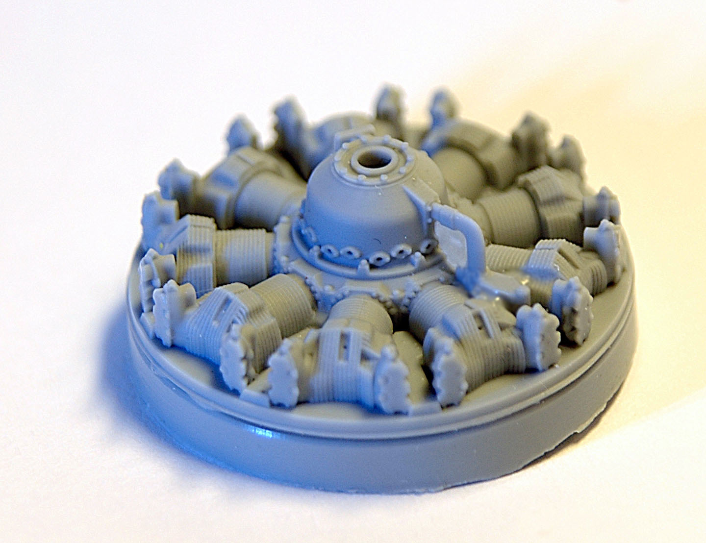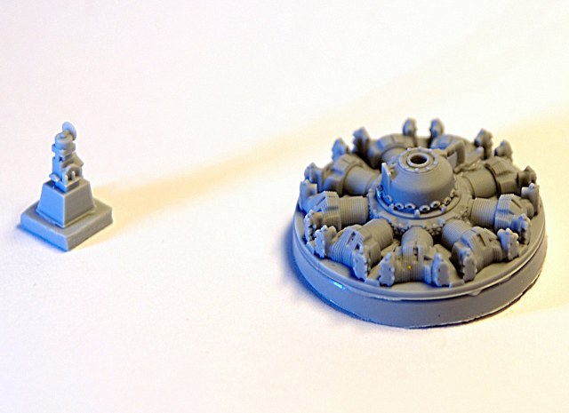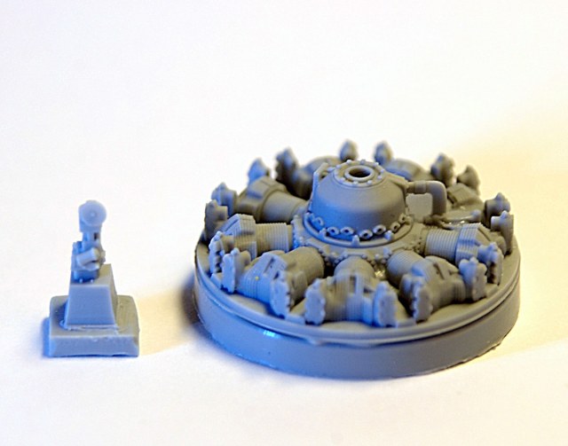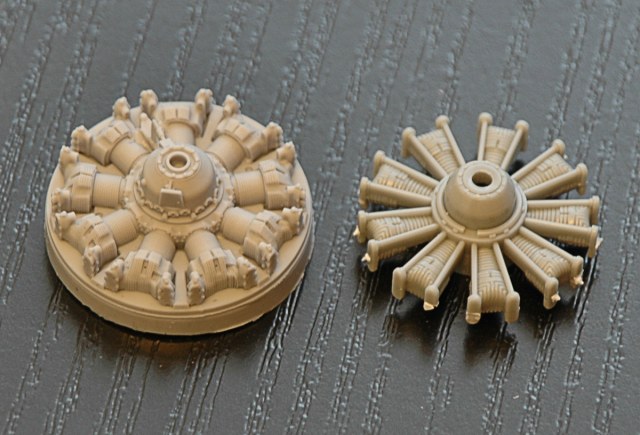 Набор представляет из себя прозрачный пакет с подробной инструкцией и двумя смоляными отливками. Предназначен для замены двигателя модели Ан-2 Hobby Boss, который просто не выдерживает никакой критики. К достоинствам данного набора следует отнести то, что двигатель выполнен одной отливкой и устанавливается на место практически без доработки фюзеляжа. Обычно производитель афтемаркета дает цилиндры и картер отдельными деталями, АМ нашли прекрасный компромисс. Двигатель сделан одной деталью и отдельно дается регулятор постоянных оборотов. Если не открывать капот, то лучше ничего и не нужно. Картер двигателя и головки цилиндров прекрасно деталированы. Толщина ребер на цилиндрах около 0, 1мм. Хорошо выполнены дефлекторы цилиндров. Для толкателей клапанов предусмотрены отверстия. Вместо привычно торчащего вала винта - отверстие диаметром 2 мм, что дает возможность моделисту самостоятельно установить металлическую ось, а по желанию и виниловую втулку (от моделей Тамия или Хасегава) что сделает винт съемным. Решение вполне обоснованное: отлитый носок вала винта смотрится неплохо, но он совершенно не функционален, хрупкий и не обеспечивает вращения винта. Коллектор проводов зажигания предлагается изготовить из проволоки.