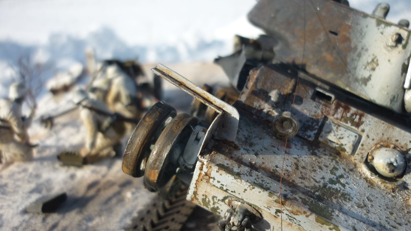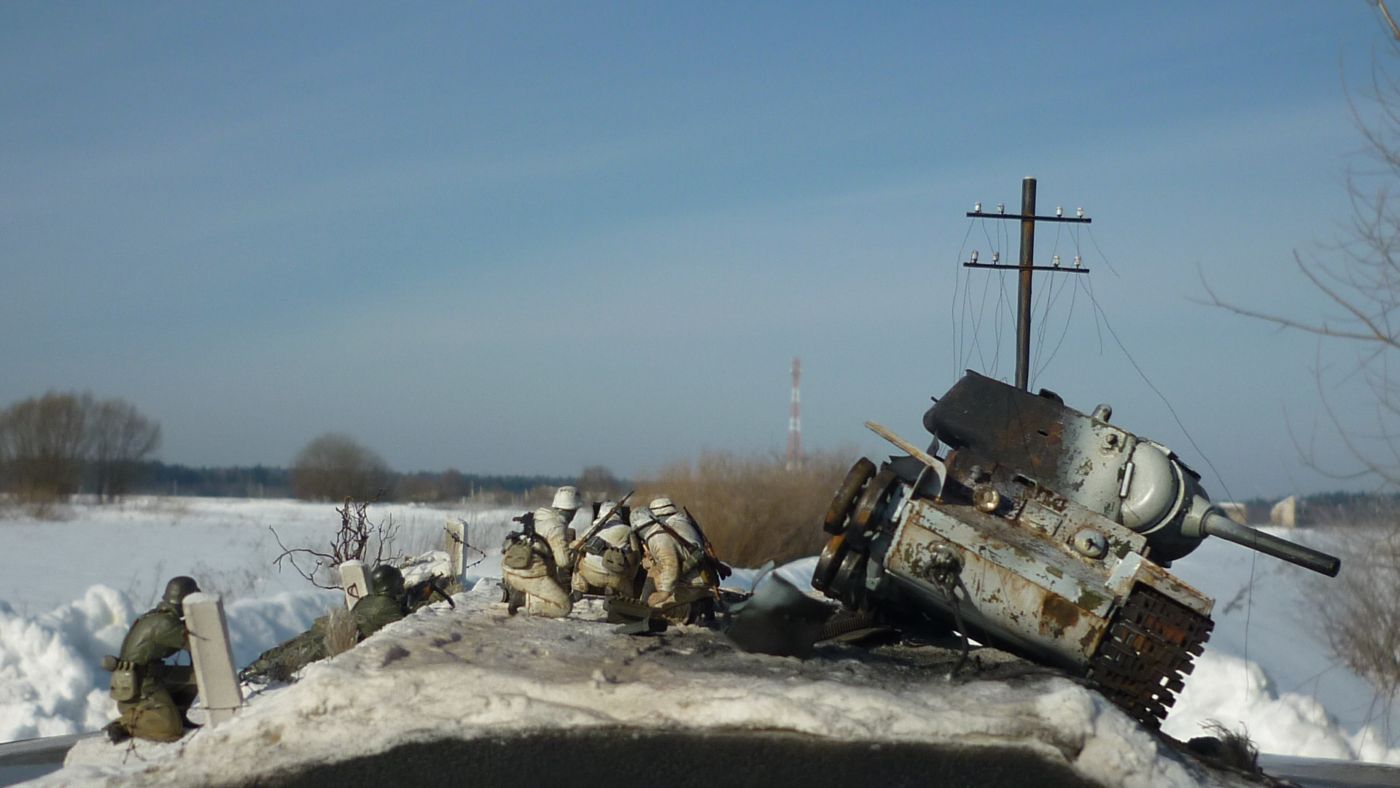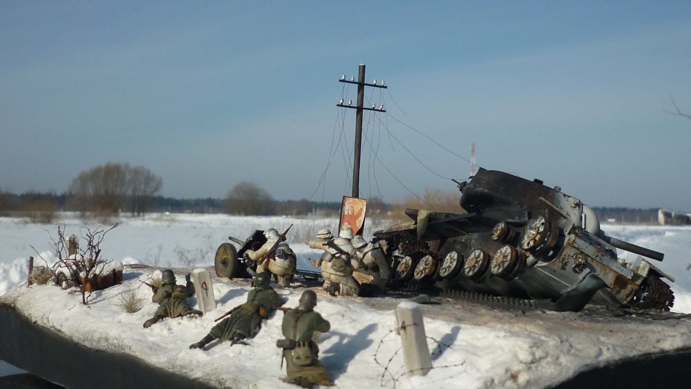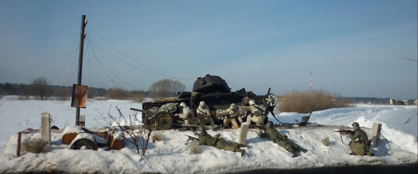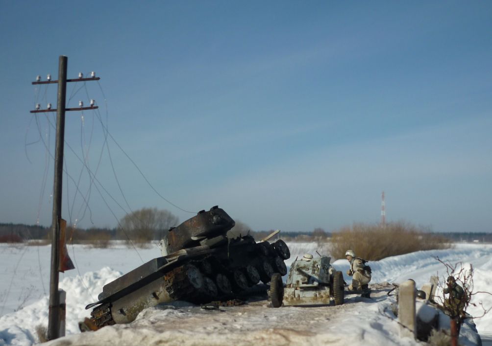 Какая вышка?!! Тут работа просто шедевр: и снег со следами горения и столб ЛЭП и столбик дорожный и пушка и особенно танк (в нем практически все: метал, ржавчина, гарь, повреждения, зимний камуфляж, следы эксплуатации и т.д.) В общем всего не перечислишь, нужно не один раз смотреть всю диораму - очень информативная. Автору респект. Огромная работа. МОЛОДЕЦ!