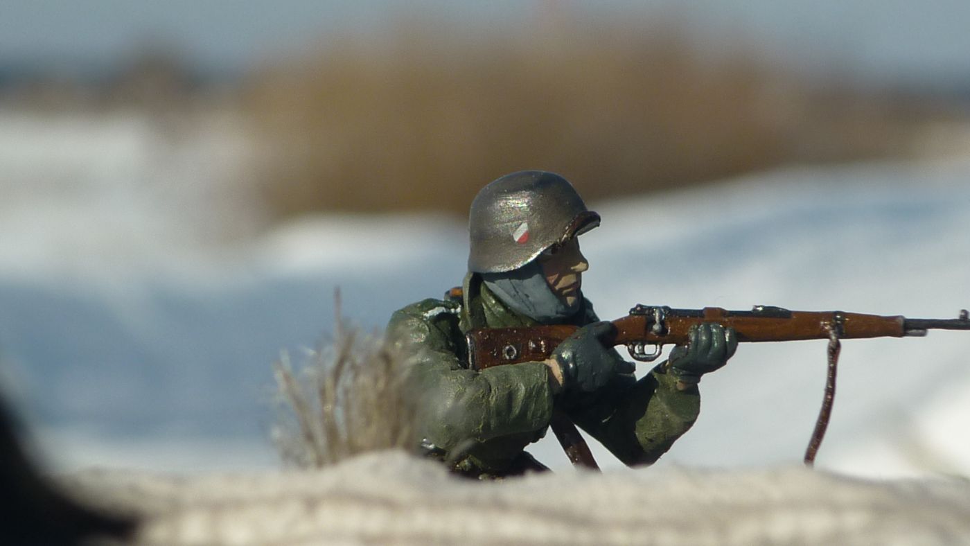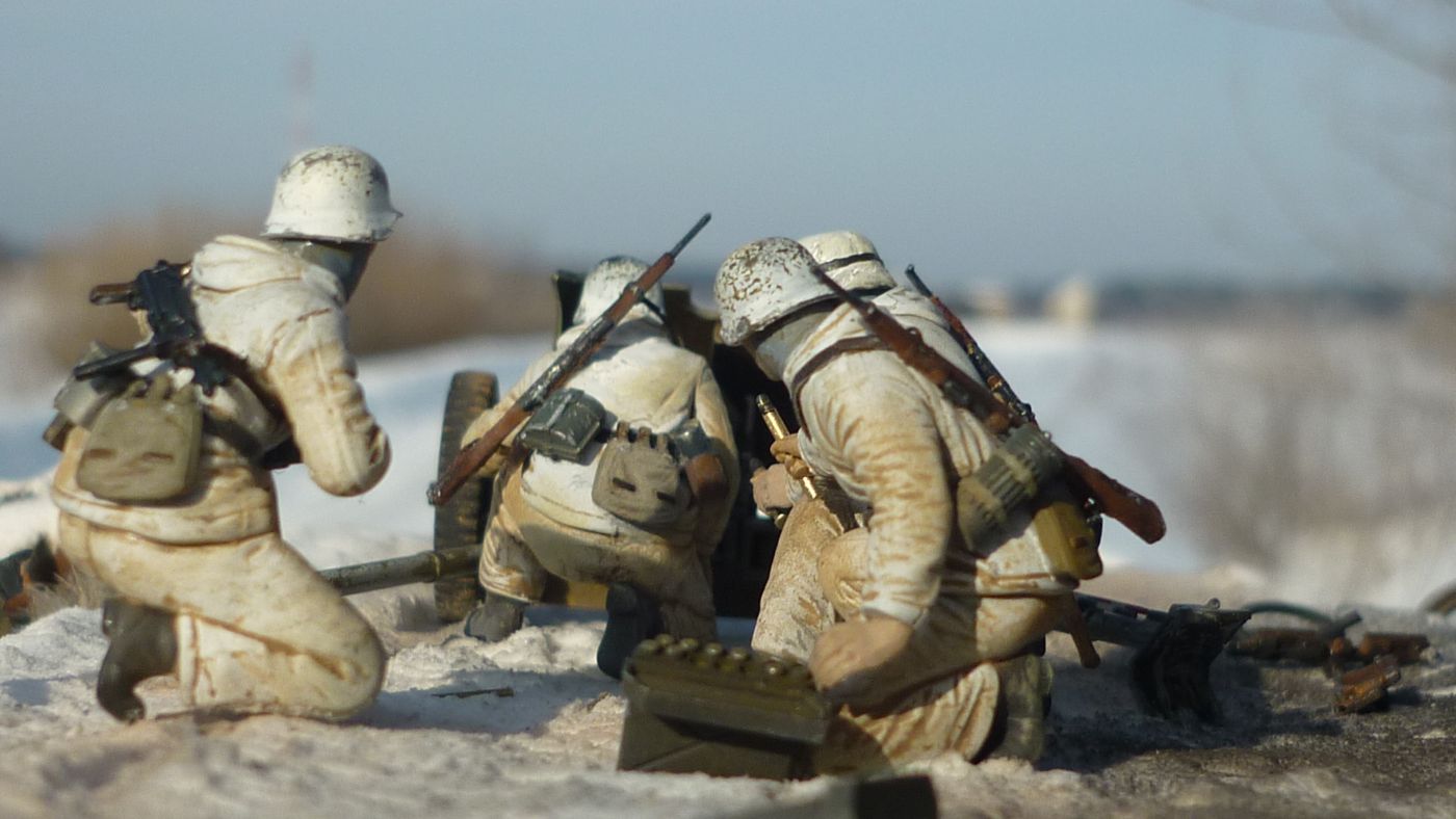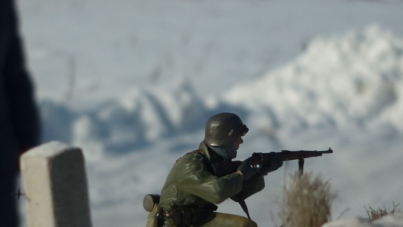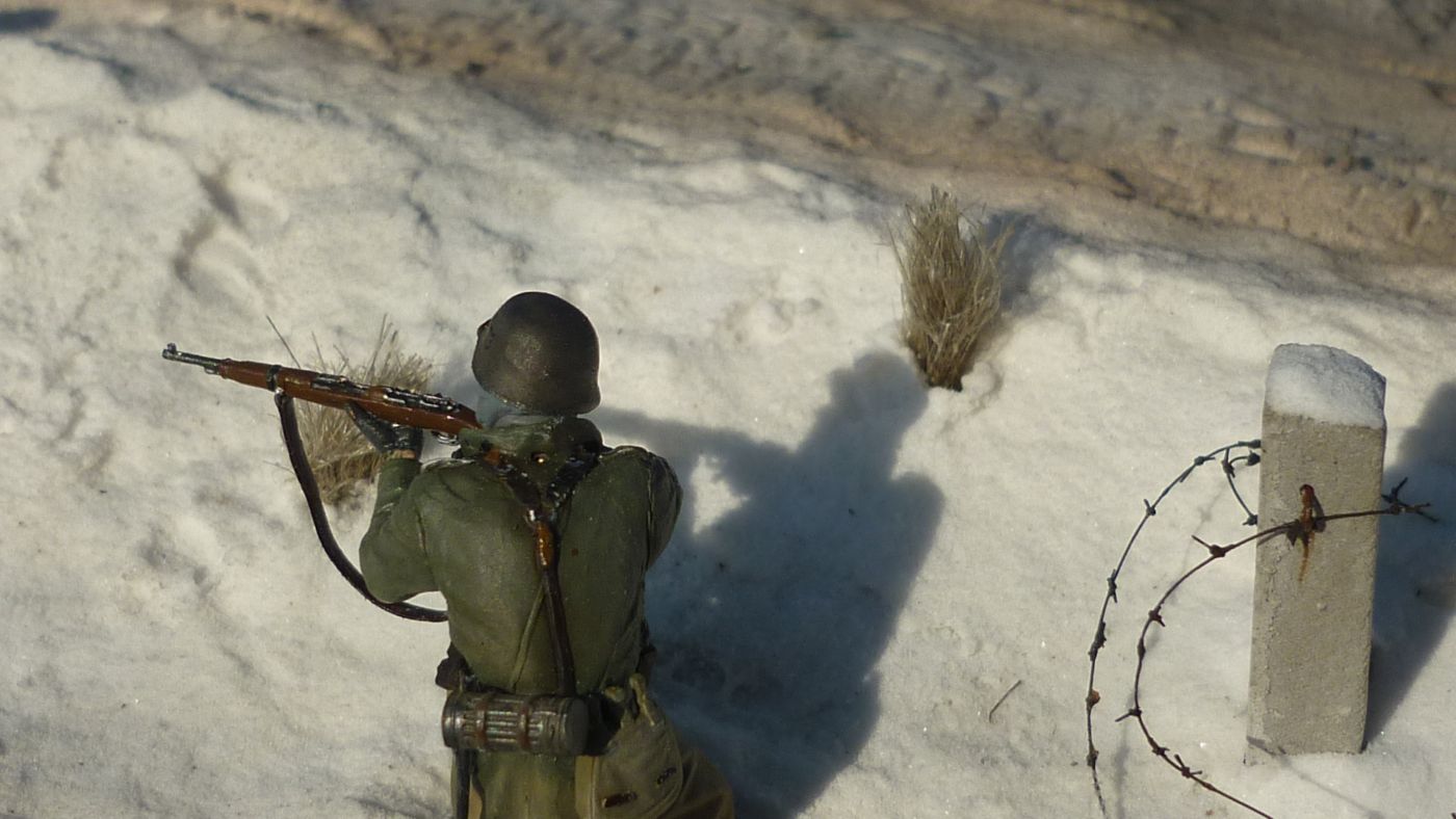 и в легкую припорошить фигурки в тех местах где могло быть соприкосновение со снегом - рукава, локти, колени, низ шинели.