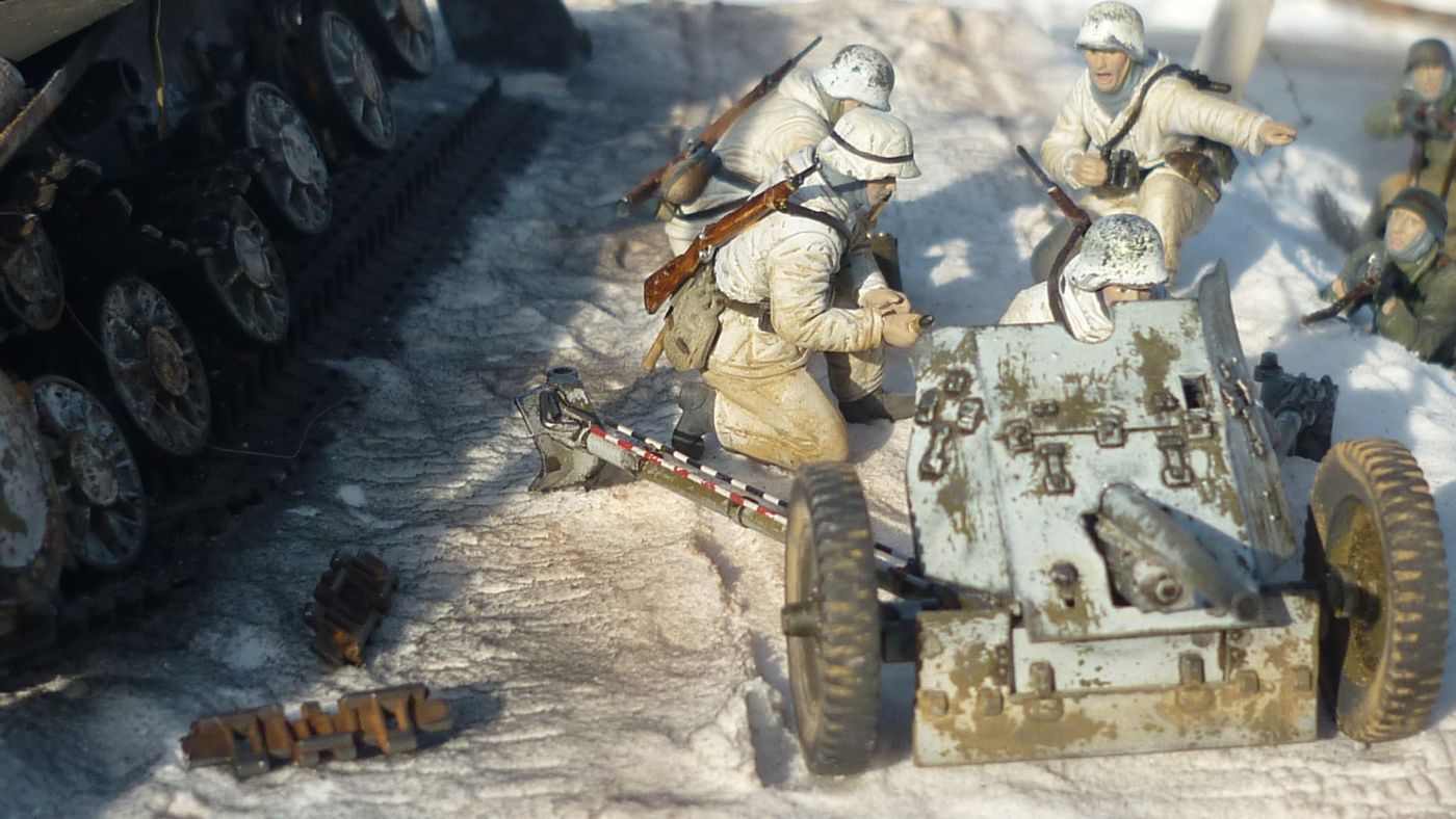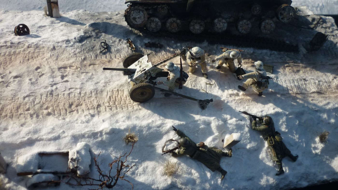 простите за не профессионализм но мне кажется диораму нужно оценивать по общему впечатлению..а оно тут как раз очень хорошее..а если начать ковырять по мелочи..с чего взяли что танк подбит этим орудием..он просто удобен для укрытия...да и при динамичной атаке некогда особо врывать пушку...тем более её тащат по снегу пердячим паром..да и не знаем мы кто противостоит пушкарям...а на негативе так и можно диораму Курской битвы обгадить..а она скажу вам как человек бывший там очень достойная..как и Бородинская панорама ...работа очень достойная..да и делал человек из того что было..вернул жизнь боевой машине