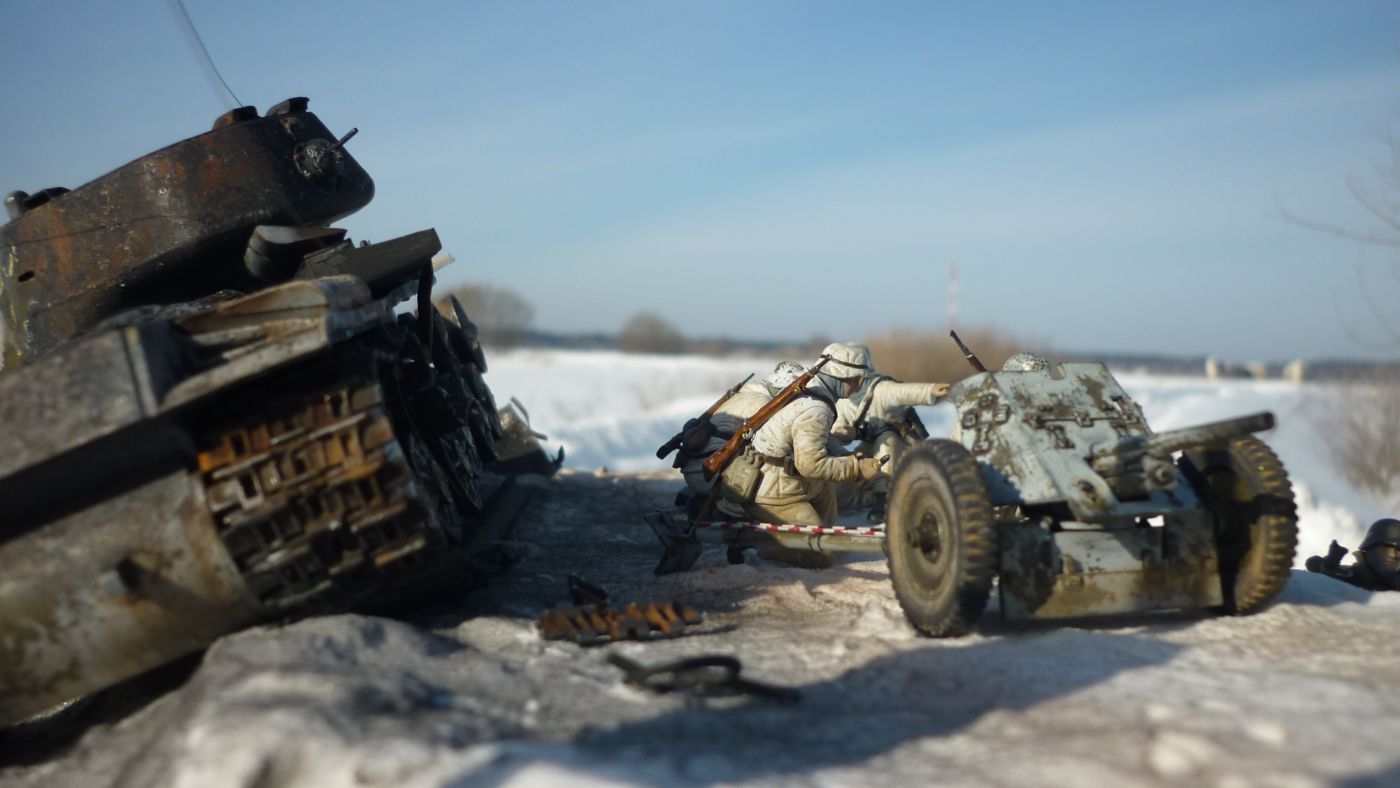 Не знаю даже с чего начать! во первых, причем тут кв-9! во вторых я и не подозревал что именно так прочитают мою диораму,конечно пак-36 был не конкурент танку кв-1 если поворошить историю то на тот период их жгли другими способами.А по поводу маскировки вот!