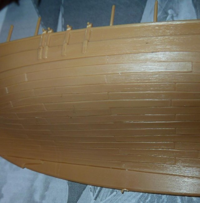 Что немного огорчает, но не удивляет (т. к. это классика для хеллеровских моделей) — досочки на бортах сделаны нормально — красивая фактура, внутренняя расшивка. А вот палуба с внешней расшивкой. Но почему?? Почему ее нельзя было сделать так же, как и борта? Этого я понять не могу.