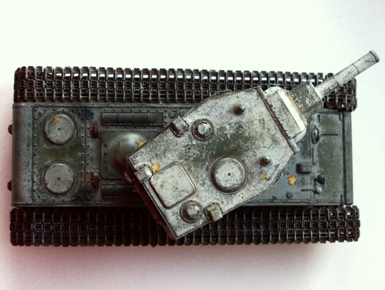 7. Кленовые листья на полустертом (!) зимнем камуфляже смотрятся либо джедаями, зубами вгрызшимися в броню, либо прибитыми гвоздями ушлым экипажем (не иначе как для маскировки) - иначе как бы они продержались на горизонтальных поверхностях танка столько времени, что аж камуфляж успел стереться?