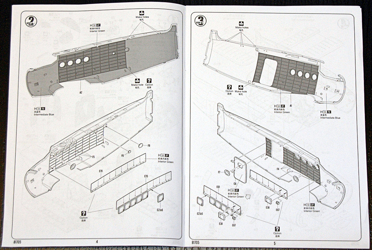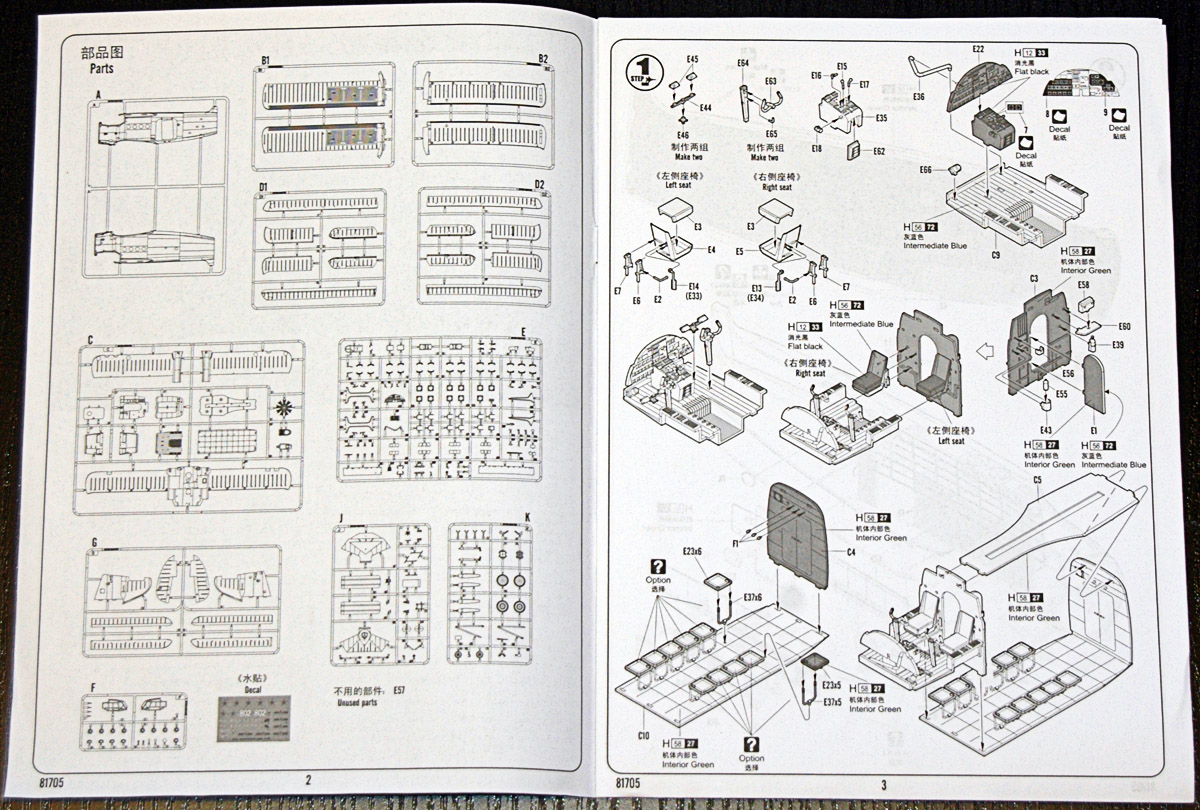 В коробке из плотного картона находятся: десять литников серого пластика, один литник прозрачного, подробная инструкция по сборке (на 16 страницах), цветная инструкция по покраске на два варианта и декаль, так же на два варианта - Россия и Китай. Причем литник с прозрачными деталями аккуратно завернут в мягкую пенку, дабы избежать царапин. Инструкция очень доступна и понятна. Качество литья очень высокое, пластик в меру мягкий и приятный в обработке.