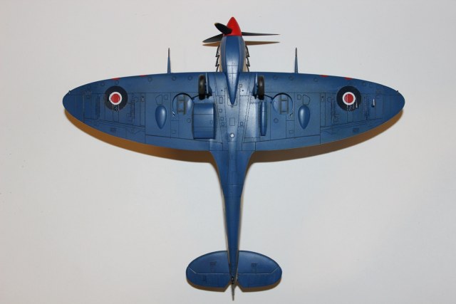 Из двух предлагаемых модификаций решил собрать вариант с массивным воздушным фильтром «Aboukir». Он придает силуэту Spitefire несколько непривычный вид. Окаска сделана без привязки с какому-то историческому прототипу. Красил как всегда аэрографом с использованием масок в цвета Azure Blue/Dark Earth/Light Stone из палитры водоразбавляемого АКАНа. Кроме того применялся Aircraft Grey/Green для окраски внутренних поверхностей машины и кабины пилота. Для выделения расшивки использовал художественную акварель цвета «умбра»+фэйри. Следы эксплуатации не наносились. Декали наносил при помощи раствора «Mark Fit» от «Тамии». Сверху модель покрыта полуглянцевым лаком АКАН. Следы от выхлопа слегка нанес с помощью сухих пигментов от «Тамии».