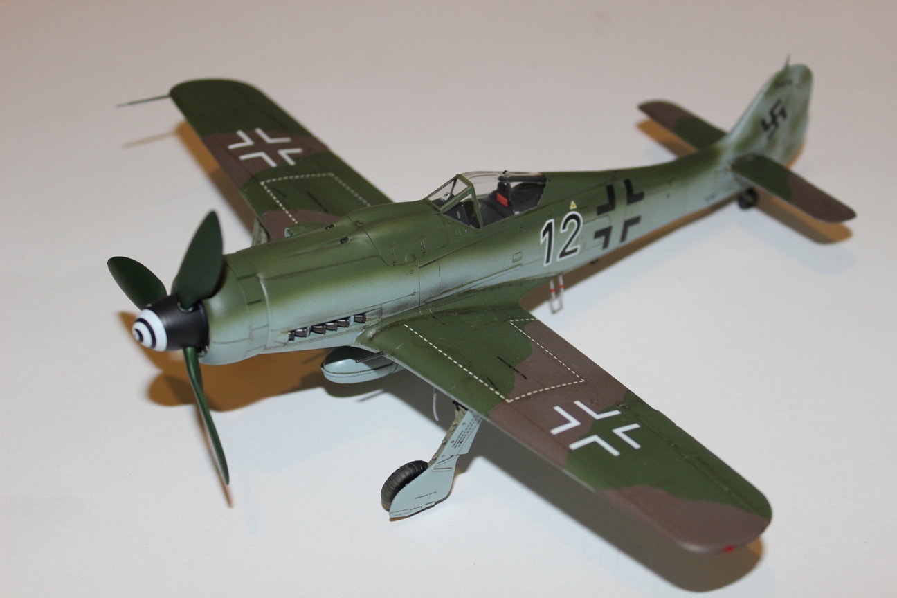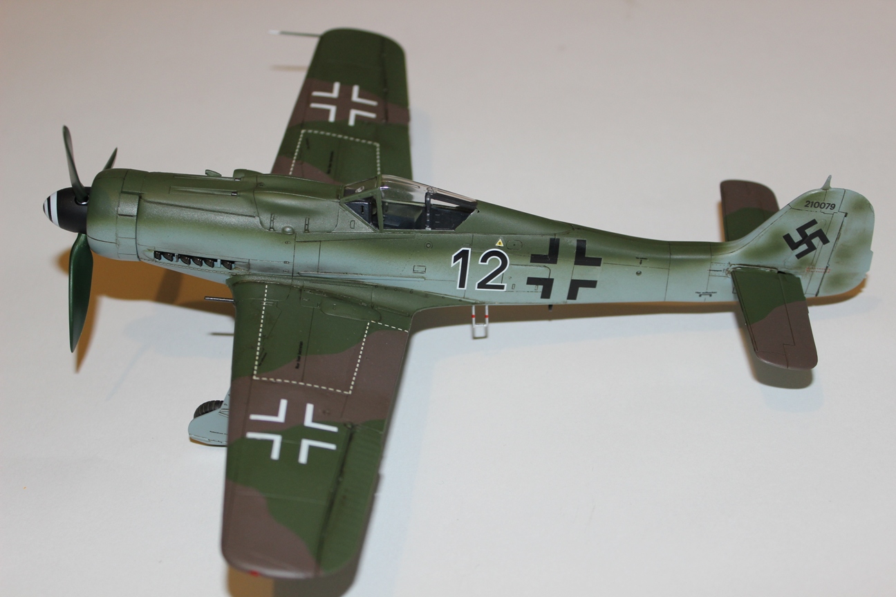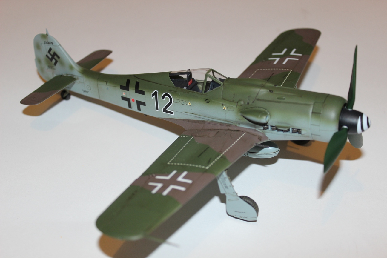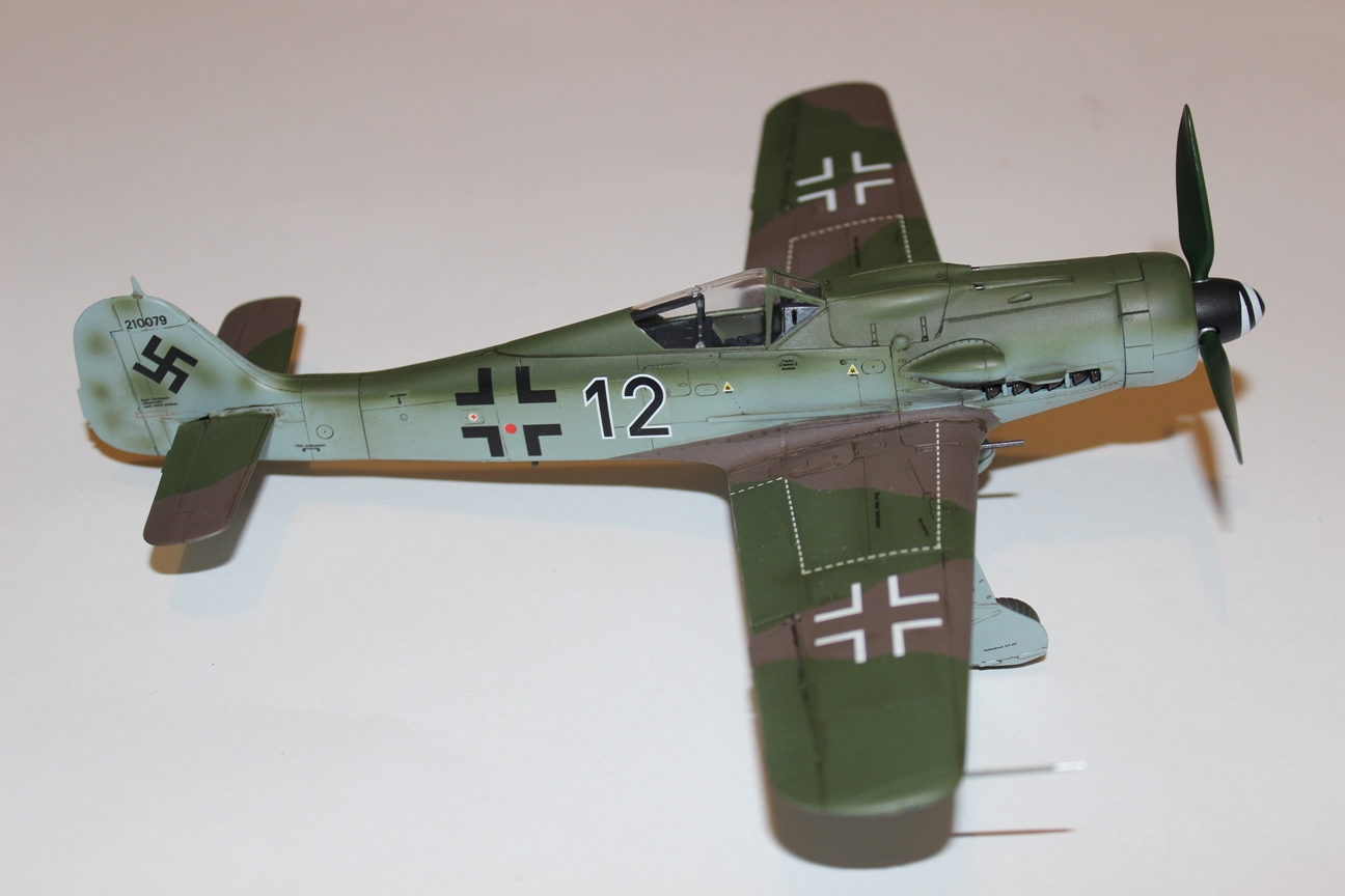 Из нескольких вариантов, предлагаемых производителем, выбрал машину лейтенанта Тео Нибеля из JG.54 с W.Nr. 210079 (« + 12»). Рассматривая немногие фотографии этой машины, которые удалось разыскать в интернете, к однозначному выводу какой камуфляж на этой машине не пришел. На одном фото кажется, что фюзеляж имеет одноцветный камуфляж сверху, на другом – двухцветный. Решил довериться производителю и сделал следующую схему камуфляжа: низ фюзеляжа и несущих поверхностей – RLM 84 (b), верхняя часть фюзеляжа - RLM 82, верхняя часть несущих поверхностей - RLM 82/81а. Ниши стойки шасси – RLM 02, кабина пилота - RLM 66, кок винта, диски шасси – RLM 22, лопасти винта – RLM 70. Для выделения расшивки использовал художественную акварель цвета «умбра»+фэйри. Декали наносил при помощи раствора «Mark Fit» от «Тамии», легли вроде бы отлично, но на макросъемке кое-где все поблескивают. Сверху модель покрыта полуглянцевым лаком АКАН. Уже когда фотографировал модель, обнаружил, что забыл закрасить черным отверстия гильзосбросов.