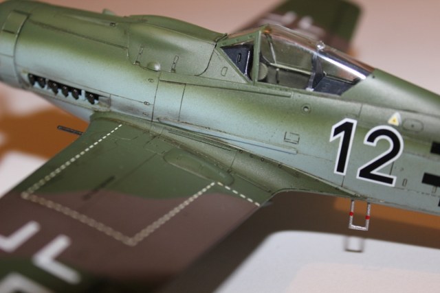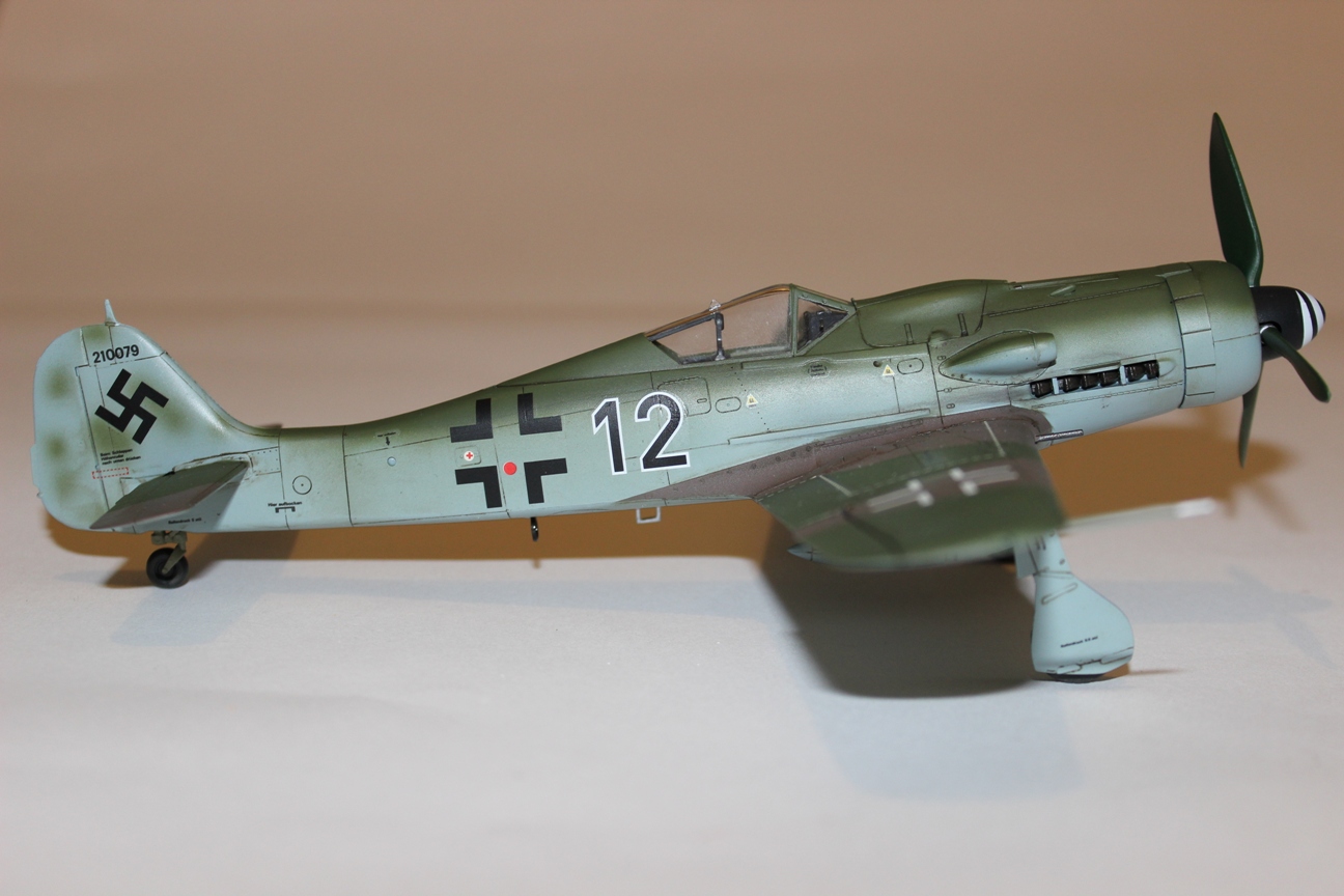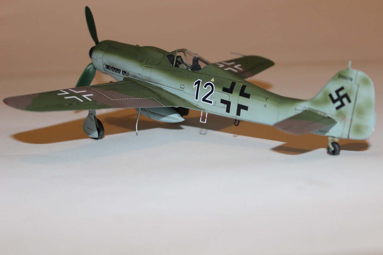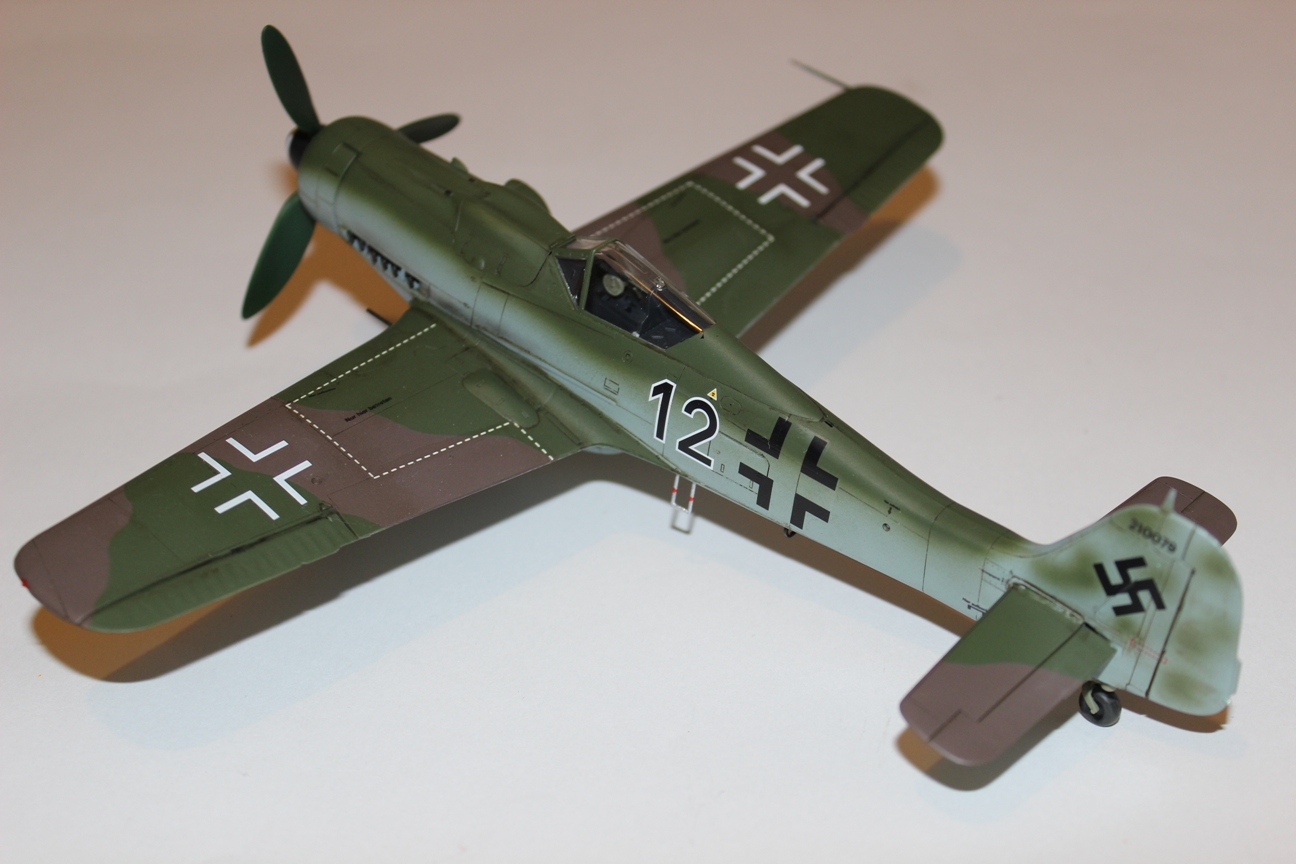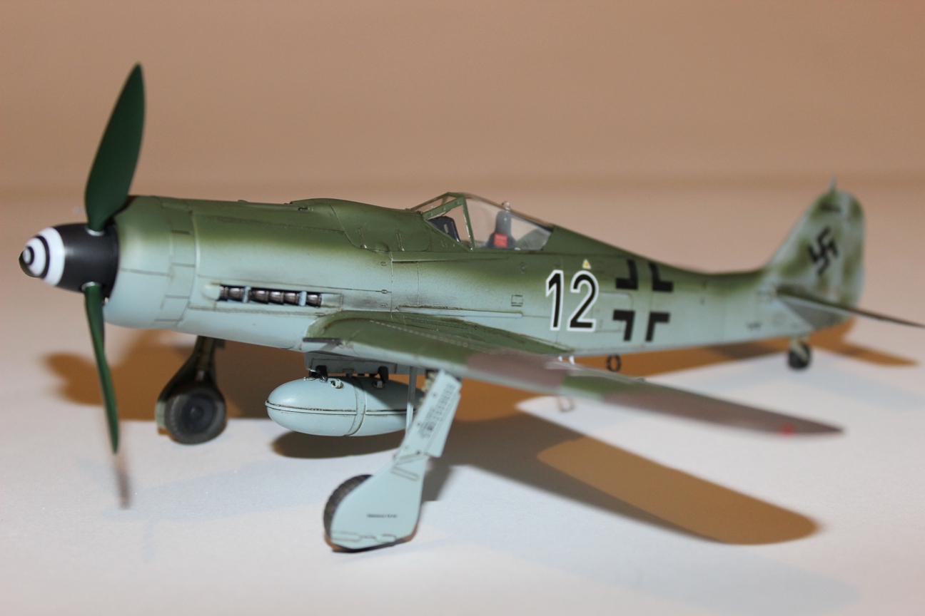 Из нескольких вариантов, предлагаемых производителем, выбрал машину лейтенанта Тео Нибеля из JG.54 с W.Nr. 210079 (« + 12»). Рассматривая немногие фотографии этой машины, которые удалось разыскать в интернете, к однозначному выводу какой камуфляж на этой машине не пришел. На одном фото кажется, что фюзеляж имеет одноцветный камуфляж сверху, на другом – двухцветный. Решил довериться производителю и сделал следующую схему камуфляжа: низ фюзеляжа и несущих поверхностей – RLM 84 (b), верхняя часть фюзеляжа - RLM 82, верхняя часть несущих поверхностей - RLM 82/81а. Ниши стойки шасси – RLM 02, кабина пилота - RLM 66, кок винта, диски шасси – RLM 22, лопасти винта – RLM 70. Для выделения расшивки использовал художественную акварель цвета «умбра»+фэйри. Декали наносил при помощи раствора «Mark Fit» от «Тамии», легли вроде бы отлично, но на макросъемке кое-где все поблескивают. Сверху модель покрыта полуглянцевым лаком АКАН. Уже когда фотографировал модель, обнаружил, что забыл закрасить черным отверстия гильзосбросов.