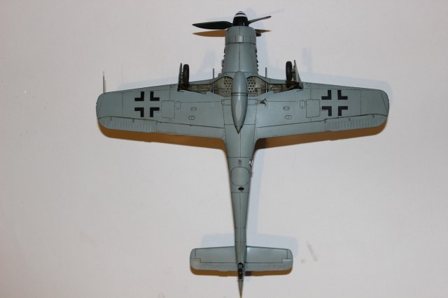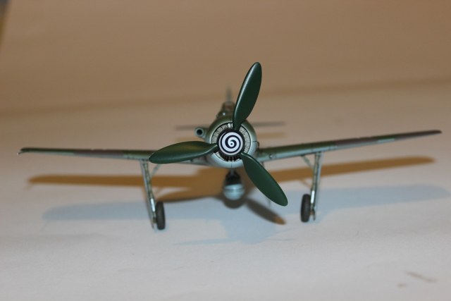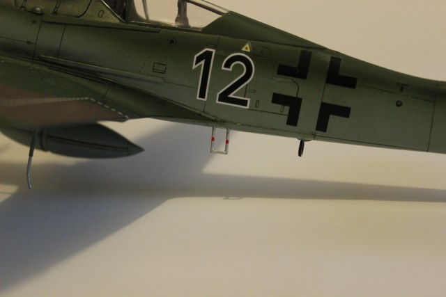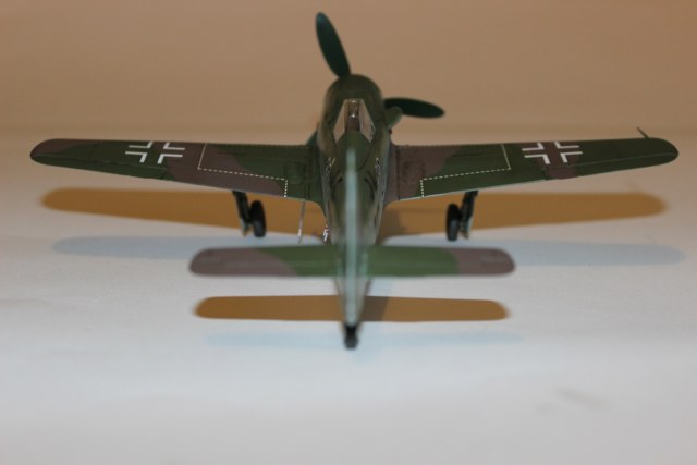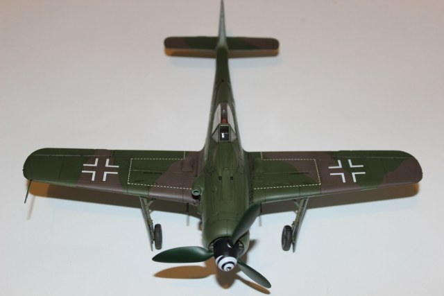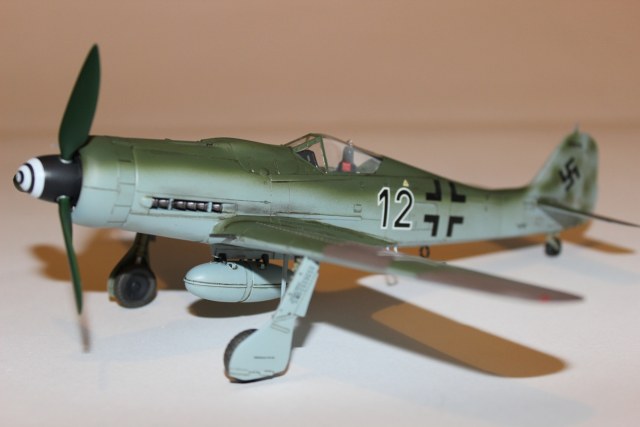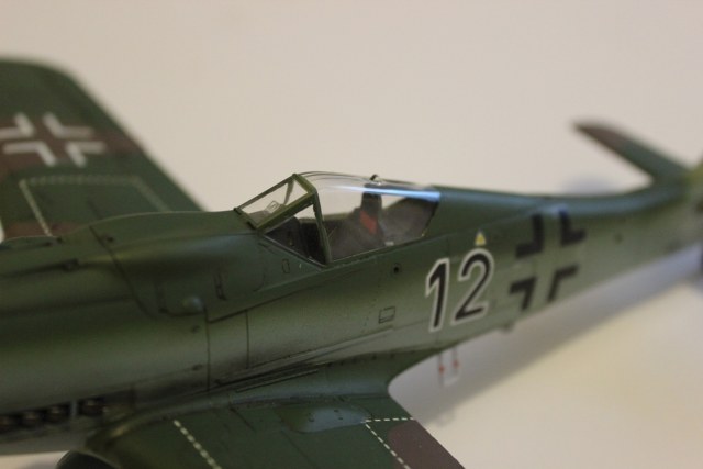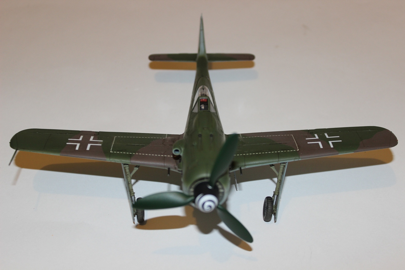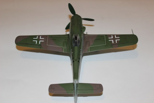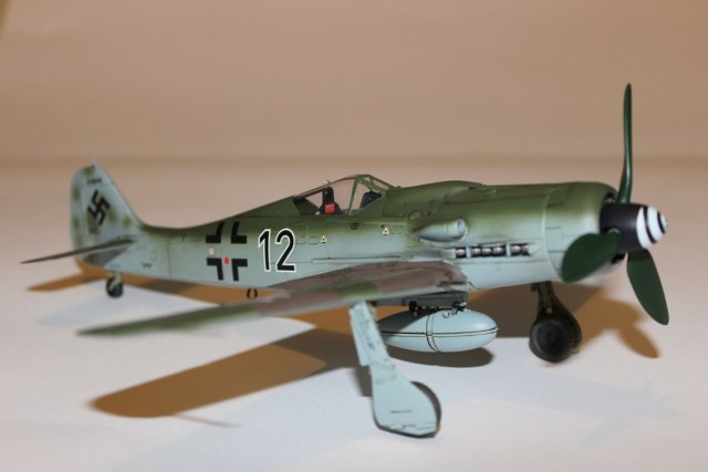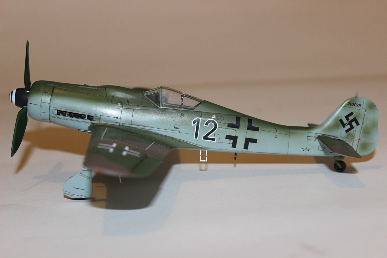 Из нескольких вариантов, предлагаемых производителем, выбрал машину лейтенанта Тео Нибеля из JG.54 с W.Nr. 210079 (« + 12»). Рассматривая немногие фотографии этой машины, которые удалось разыскать в интернете, к однозначному выводу какой камуфляж на этой машине не пришел. На одном фото кажется, что фюзеляж имеет одноцветный камуфляж сверху, на другом – двухцветный. Решил довериться производителю и сделал следующую схему камуфляжа: низ фюзеляжа и несущих поверхностей – RLM 84 (b), верхняя часть фюзеляжа - RLM 82, верхняя часть несущих поверхностей - RLM 82/81а. Ниши стойки шасси – RLM 02, кабина пилота - RLM 66, кок винта, диски шасси – RLM 22, лопасти винта – RLM 70. Для выделения расшивки использовал художественную акварель цвета «умбра»+фэйри. Декали наносил при помощи раствора «Mark Fit» от «Тамии», легли вроде бы отлично, но на макросъемке кое-где все поблескивают. Сверху модель покрыта полуглянцевым лаком АКАН. Уже когда фотографировал модель, обнаружил, что забыл закрасить черным отверстия гильзосбросов.