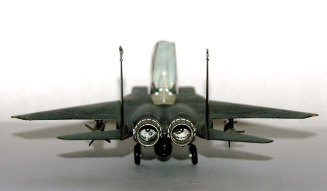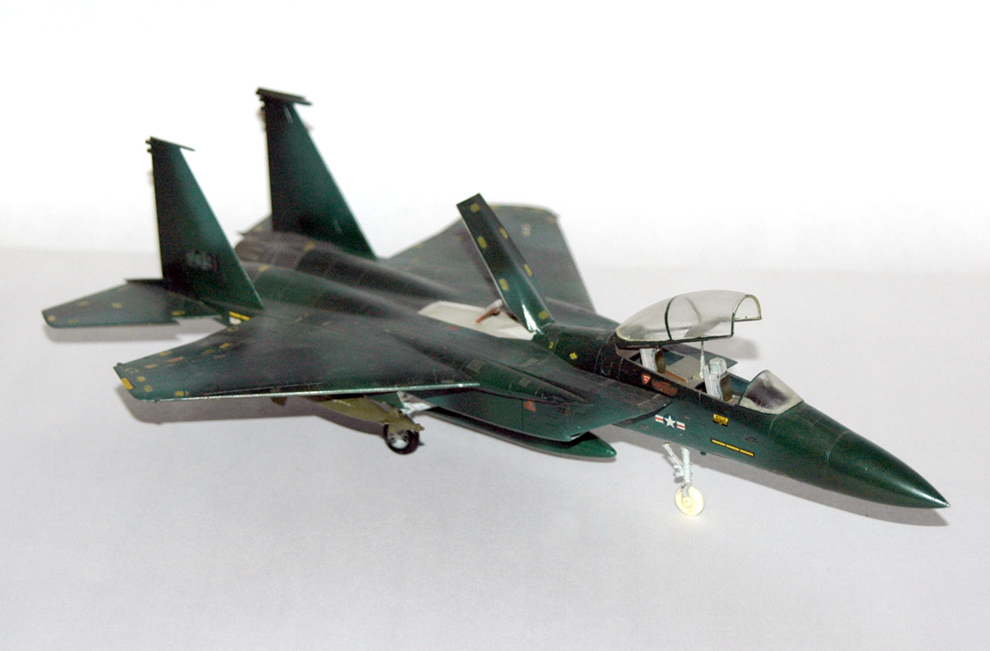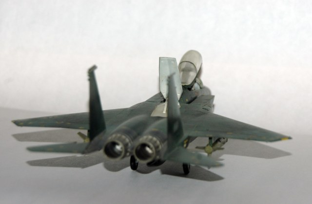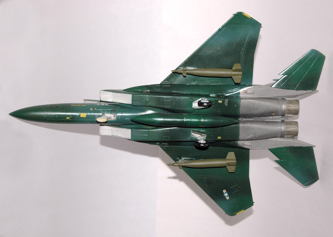 В те времена я имел весьма условное представление о шпаклевке, в итоге модель собиралась без оной. Грунтовал автомобильной (бардовой) грунтовкой, краски нитра из пятилитровых банок. Цвета подбирал сам. Схема окраски и декали не родные (от Эсчевского же F-15E Strike Eagle), их я взял у товарища по Челябинскому клубу. Красил белорусским аэром. В наборе вооружения не было, по этому (примерно в 1990г.) подвесил КАБы от какой то другой модели.