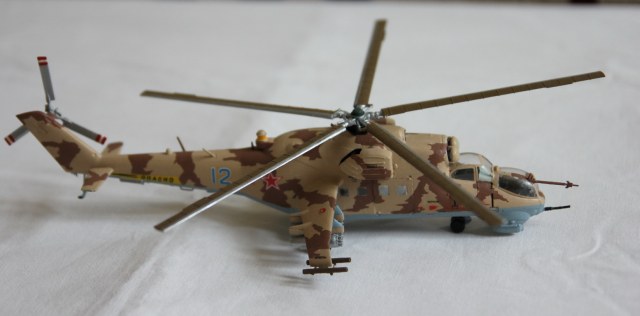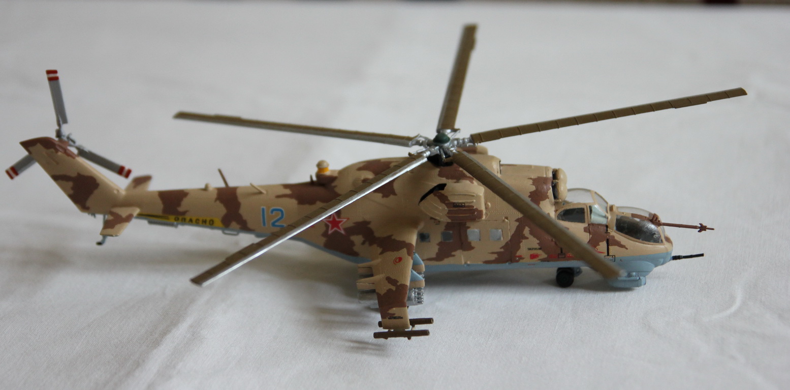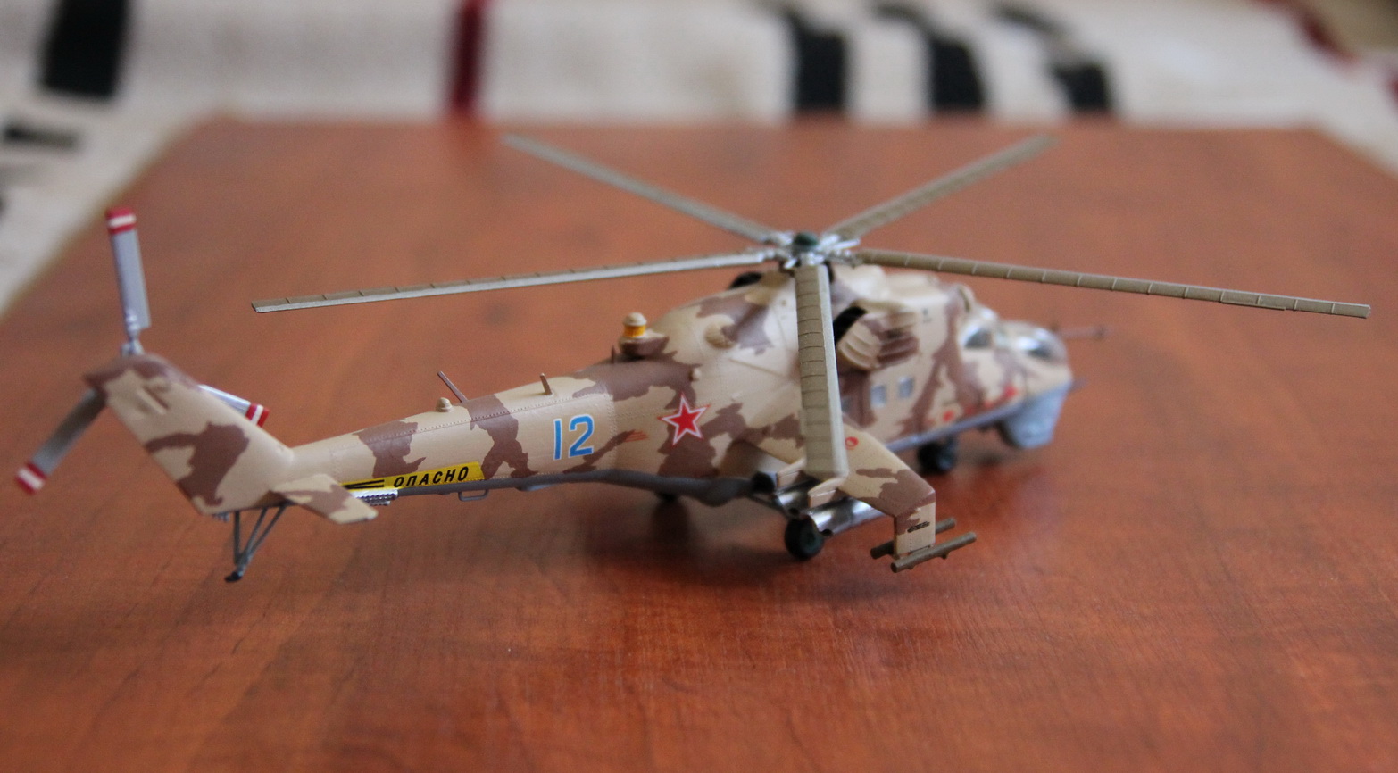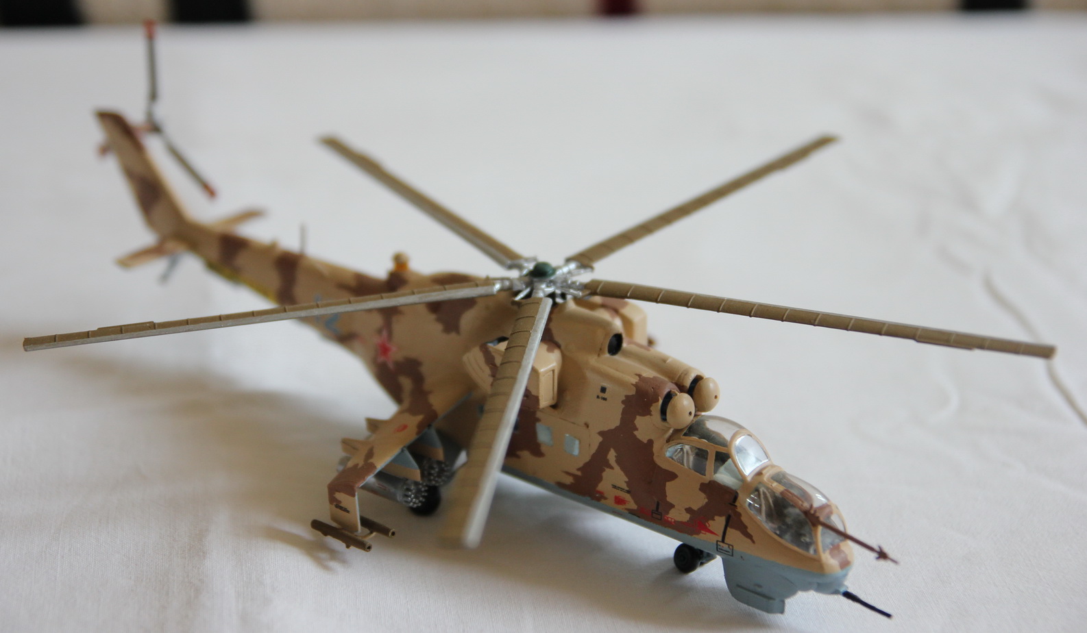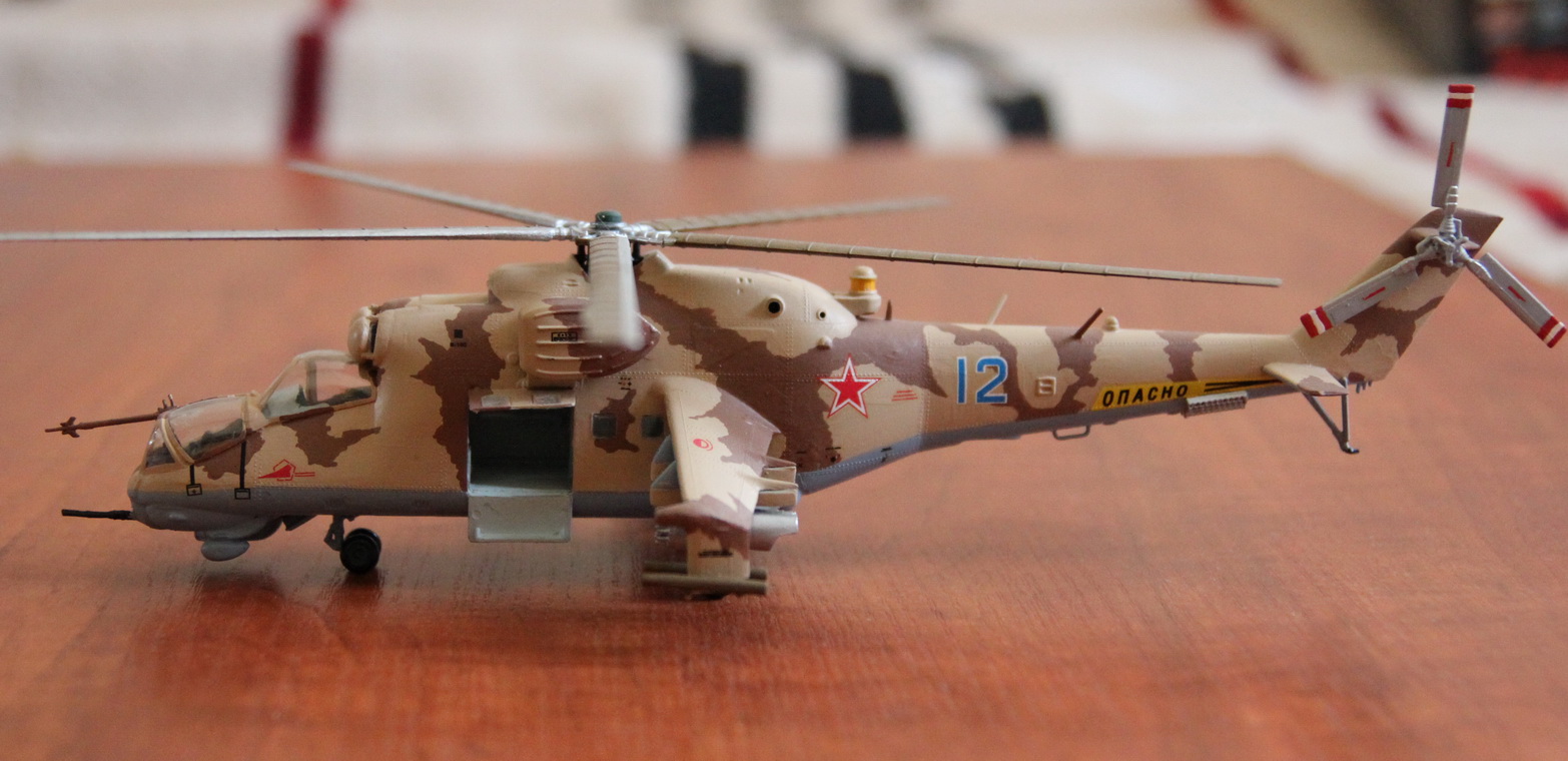 Значится так. Видно, что это пластик ИТАЛА (старая ЗВЕЗДА). А он очень кривой. Ошибок в нем не счесть! Первое, что бросилось в глаза - неправильные пятна камо, на 24-х такого никогда не было. Учитывая, что борт "афганский" следовательно должен быть или "лепестковый", или "полосатый" с плавными линиями. А с "ломанными" - нонсенс! У вас в заголовке написано, что это "Д", но модель не похожа на эту модификацию. Ближе к "В". Цвета камка похожи на истину. А лопасти нет - сверху должны быть серо-зеленые, а снизу-черные. Разумеется с масштабным высветлением. "Д" такие блоки НАР не носили - УВ-32-57. А у вас блоки отдаленно напоминающие, Б8В20. И ПТУРы "Шткрм" тоже, на них вешали "Фалангу" с ПУ на рельсовых направляющих. Далее, ЭВУ ставились позднее уже на "В", когда у духов появились "стингеры". Это была наиболее эффективная защита вертолета от этих ракет. Короче говоря, ищите в сети фото, изучайте матчасть и делайте хорошую модель уже их нового отличного набора ЗВЕЗДЫ. Значительно правильнее, чем этот. Успехов!