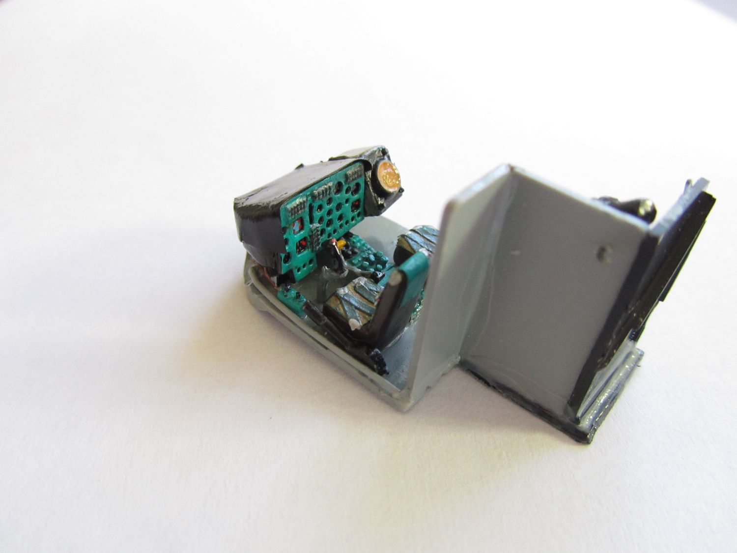 Вы отлично сделали деталировку салона, а вот с цветом втулки винта и автомата перекоса промашка вышла. Никогда не поздно правильно покрасить.