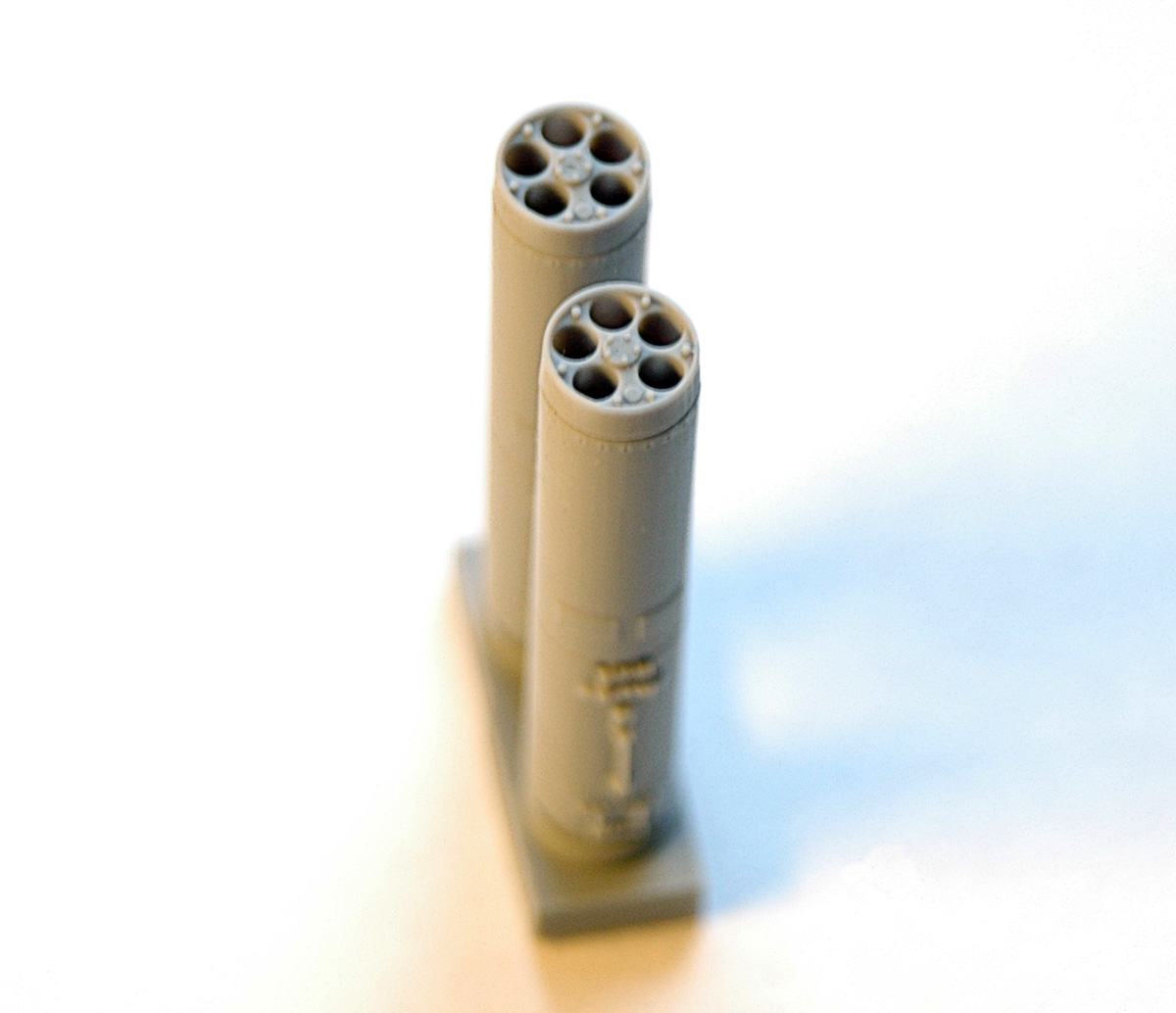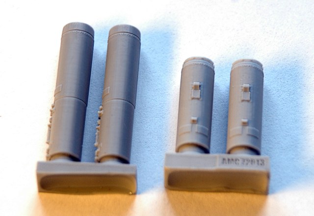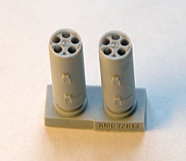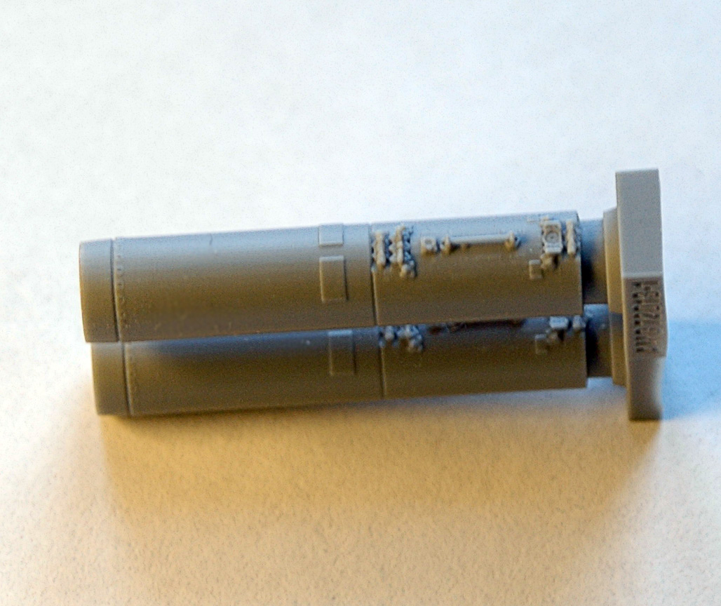 В прозрачном пакете находится буклетик с описанием и две отливки: с носовыми и хвостовыми частями для двух блоков, причем, рациональное членение соответствует реальному боеприпасу. Полиуретановая смола светло серого цвета достаточно пластичная и при обработке напоминает качественный полистирол. Очень неплохо смотрятся каналы стволов, они не сквозные, но достаточно глубокие. Замечательно получилась замковая часть, а так же торцевая часть в хвосте блока, хотя диаметр блока в 72м масштабе всего 5,7 мм.