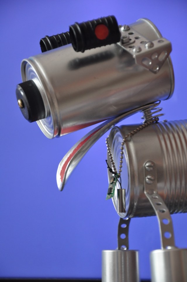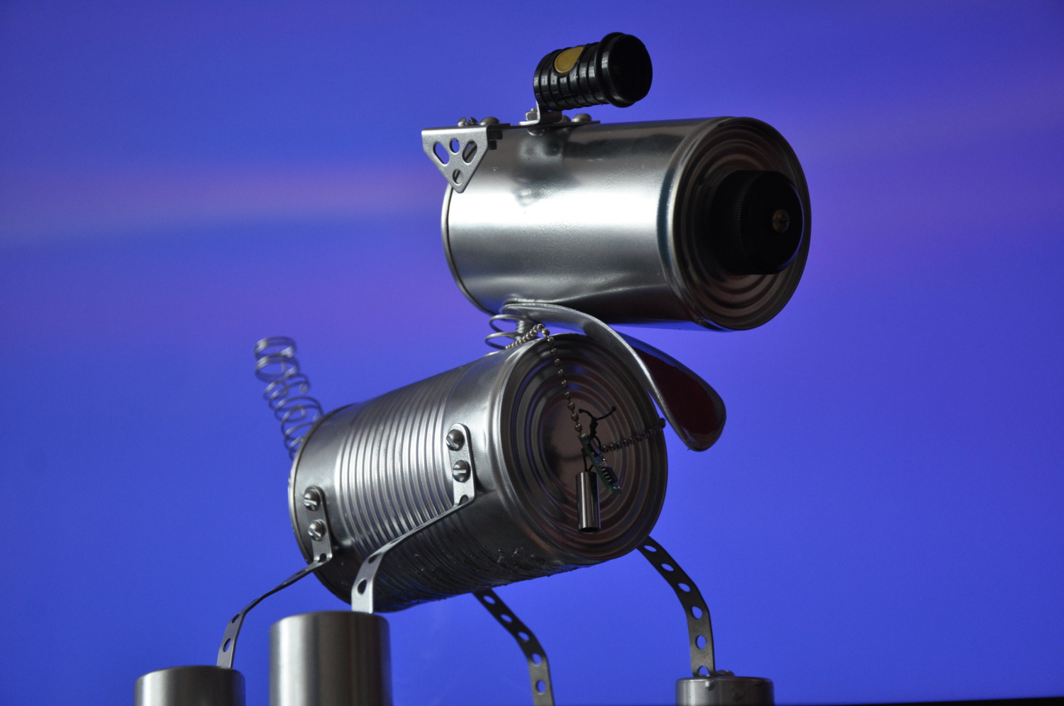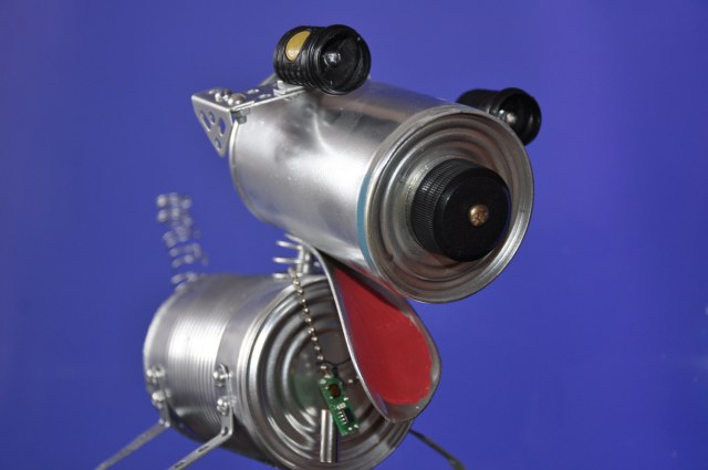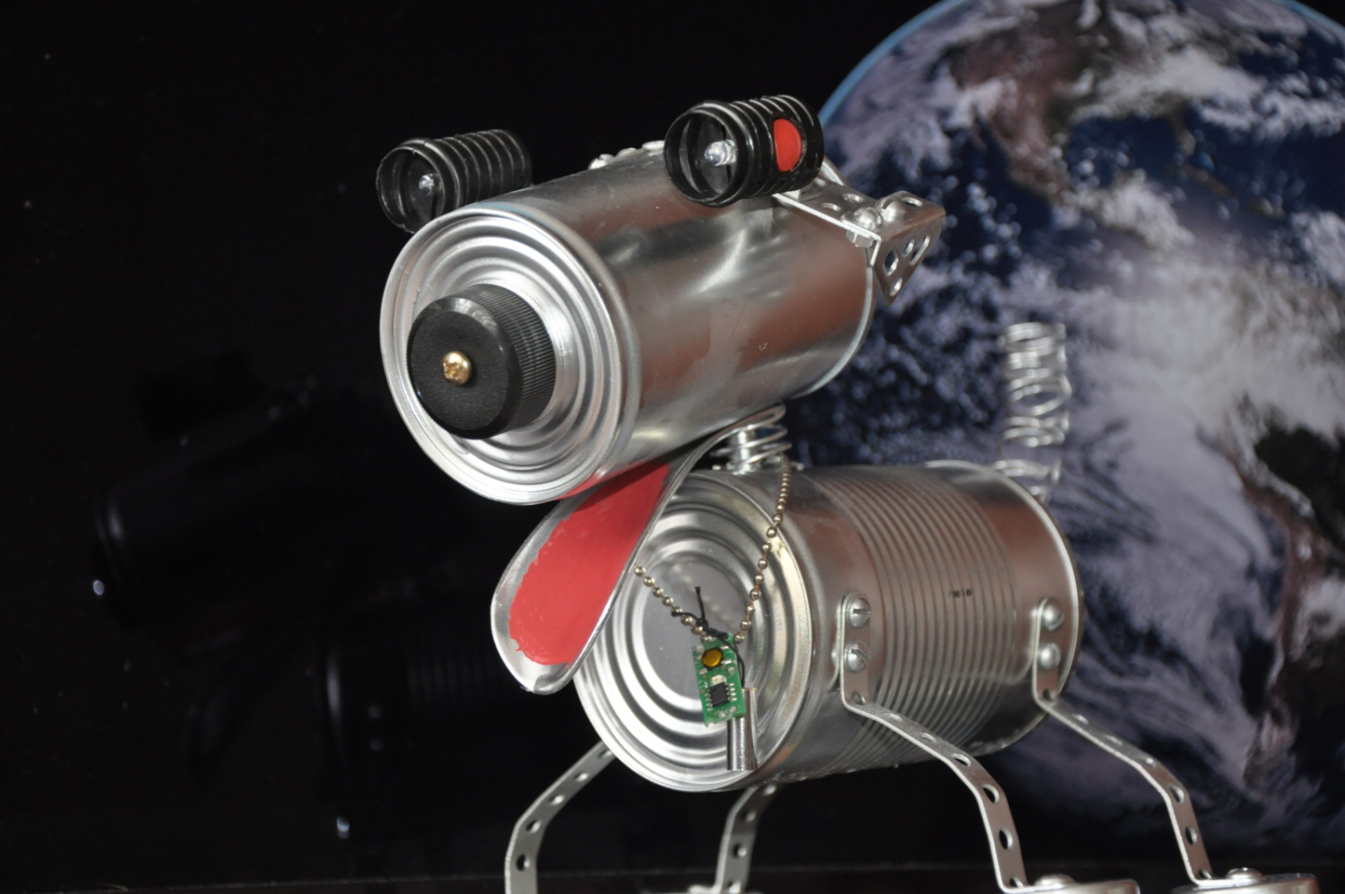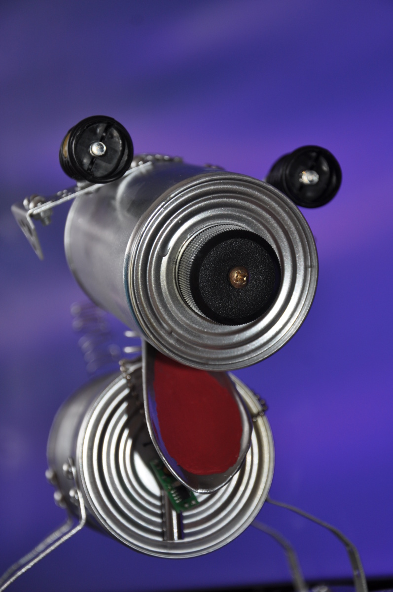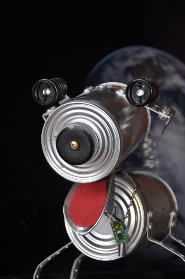 Модель изготовлена из подручных материалов. Железные банки, крышки, светодиоды .Внутрь вставлена плата со звуковым эффектом лая.