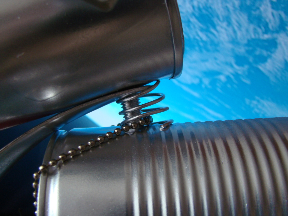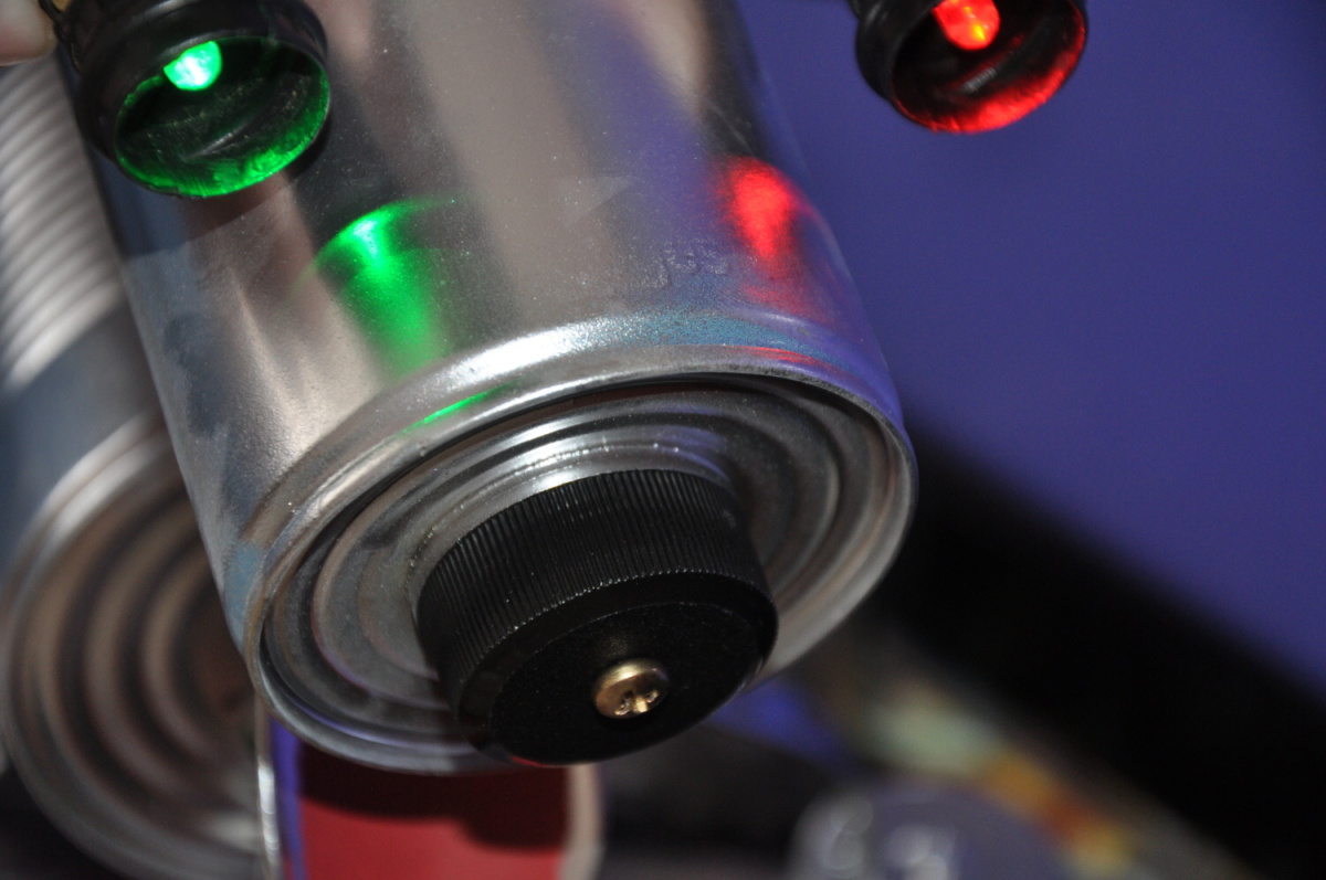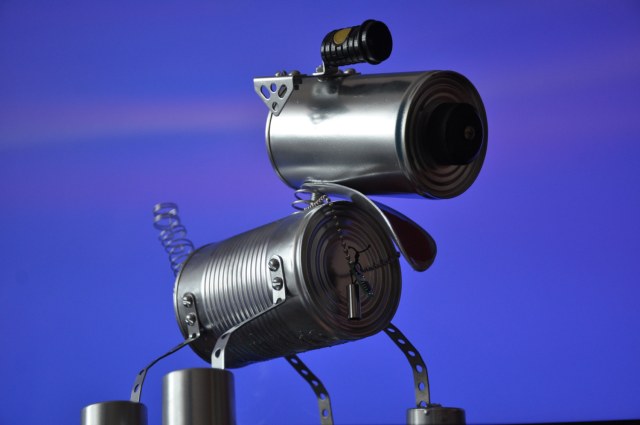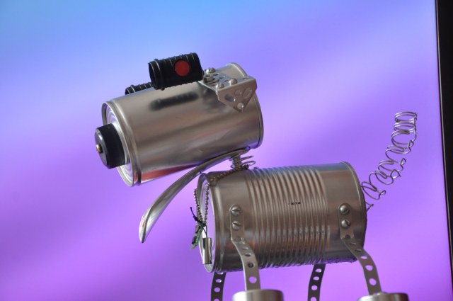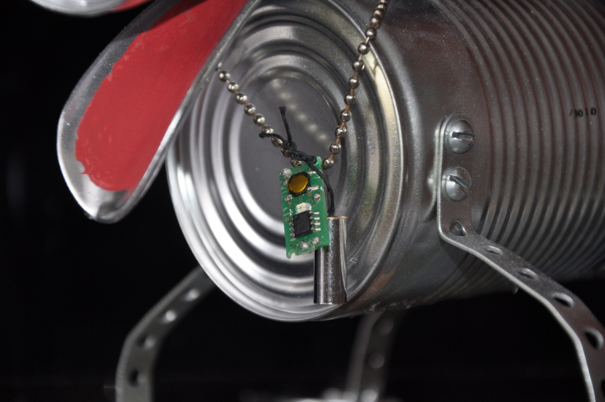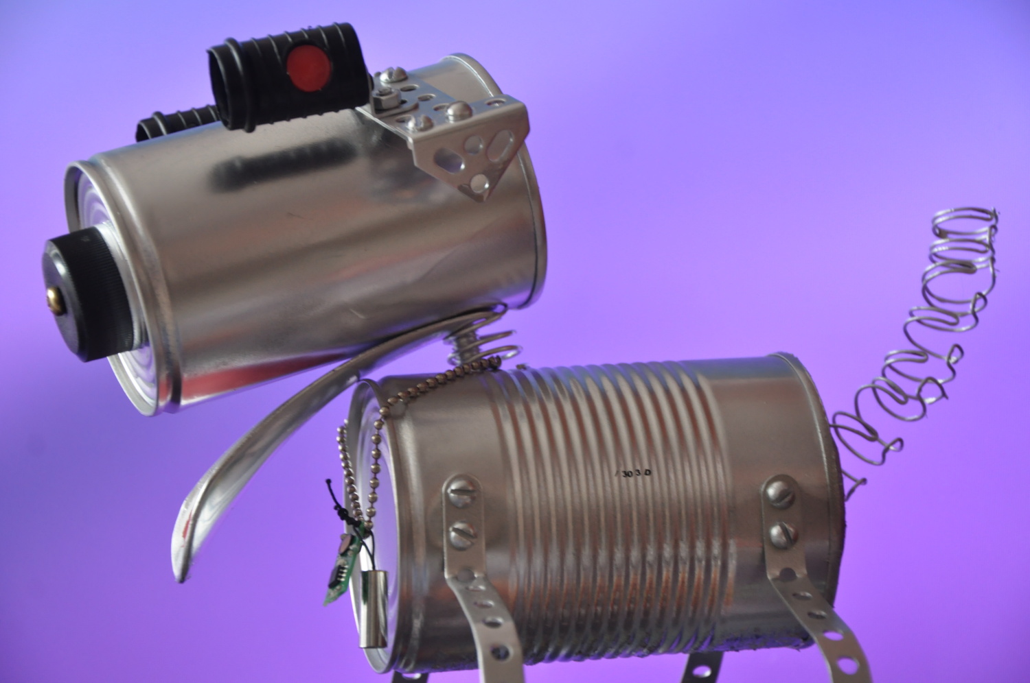 Модель изготовлена из подручных материалов. Железные банки, крышки, светодиоды .Внутрь вставлена плата со звуковым эффектом лая.