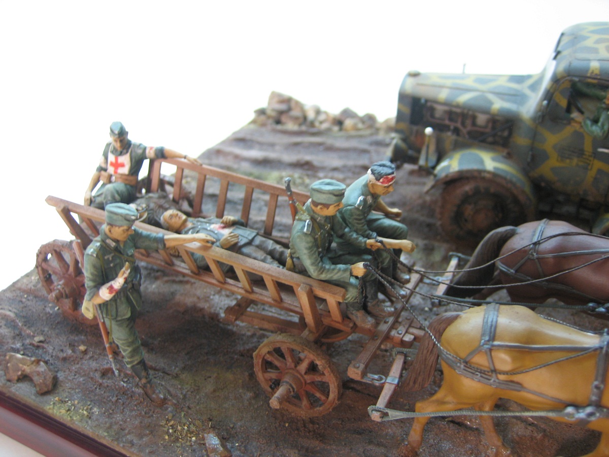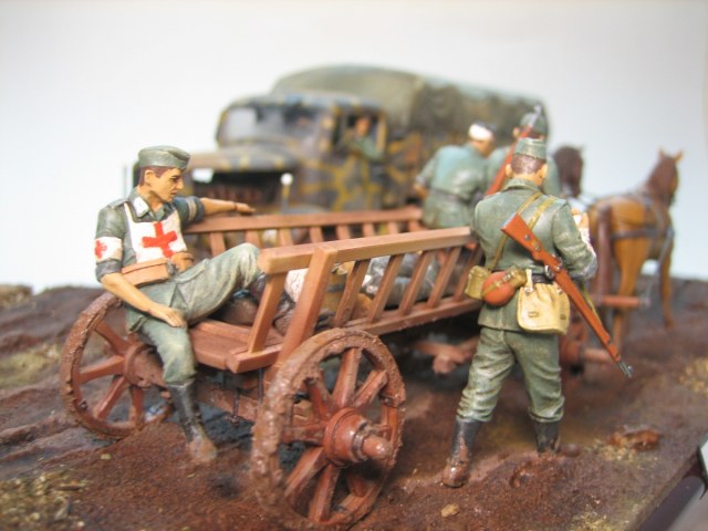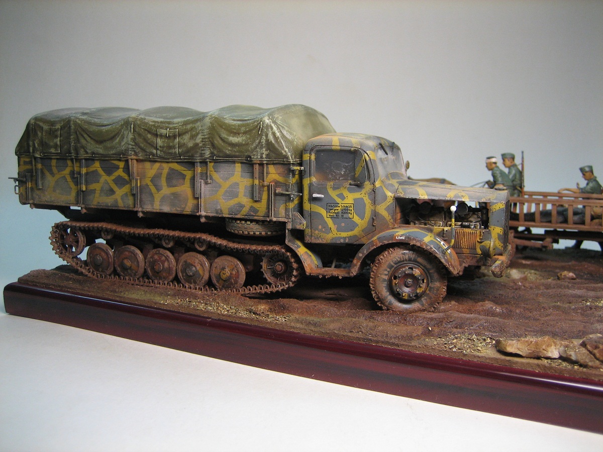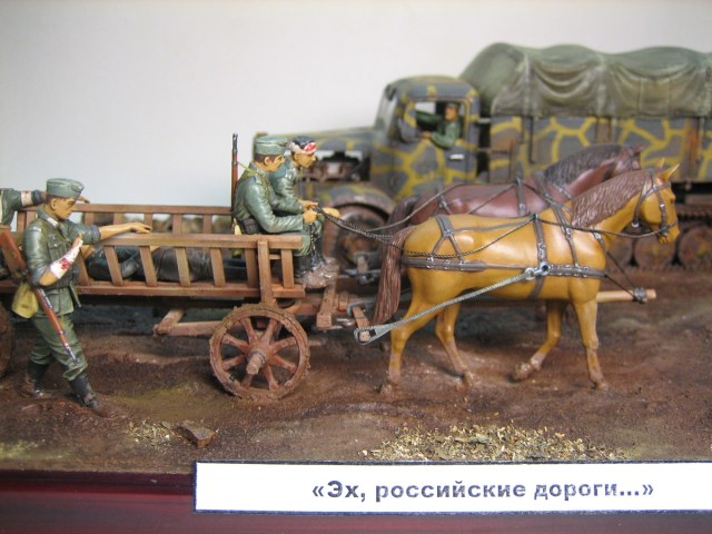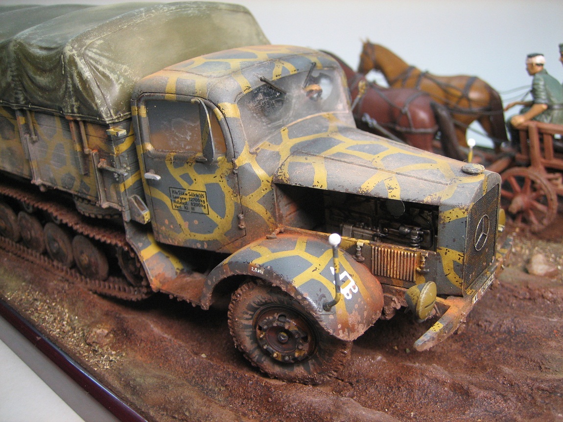 Привет Всем . Переделал фотки, снял без фотовспышки, так получше вышло. Выкладывал эту работу раньше, никому она не понравилась, все видели в ней только блеск солдат и неживых лошадей :(, может так оно и есть, со стороны виднее. Мула на заднем плане наверное никто и не заметил, поэтому помещаю модель в раздел " автомобили ". Кит всем хорошо известен, доработал провис траков и проводку двигателя. Краски Тамия, пастель + мат. лак Валехо. Прошу оценить грузовик т.к. про повозку всё знаю :)))