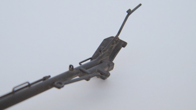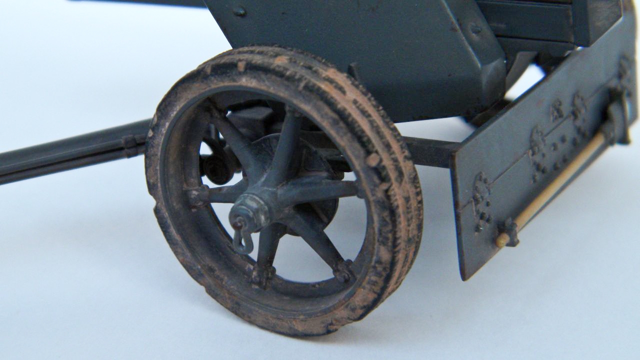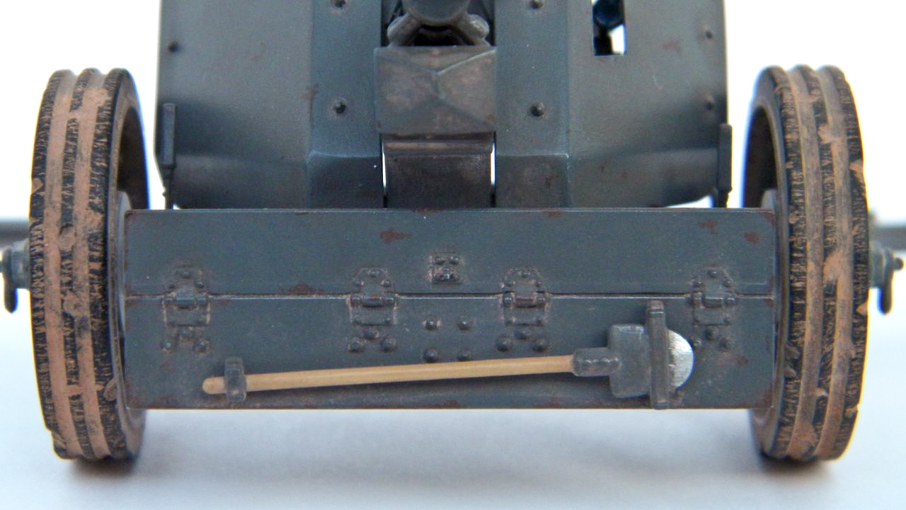 Сборка прошла более менее нормально, доработки по мелочи: нанесен протектор на колёса и его износ (перестарался как с первым так и со вторым), заменил все ручки на проволочные, палочки (ограничители сектора стрельбы?) тоже сделал из проволоки, заклеил дошираком дырки на корпусе.