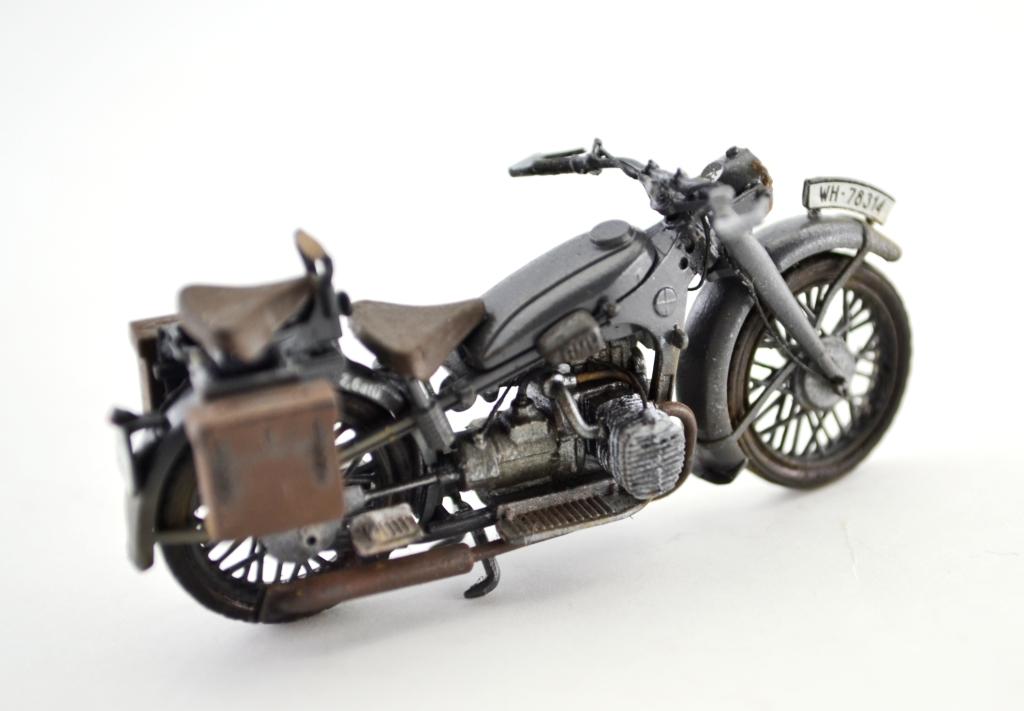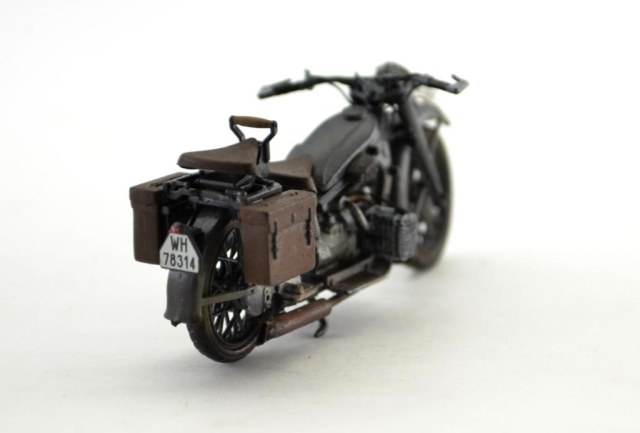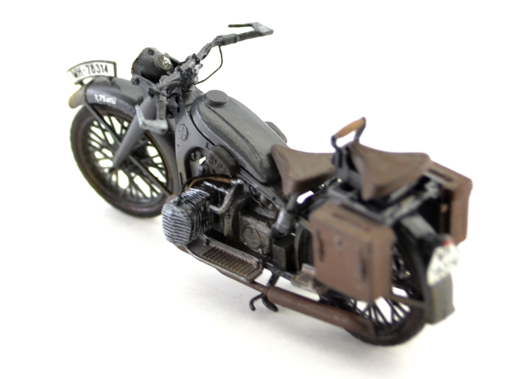Еще на стадии грунтовки стоял вопрос с дальнейшей окраской- красить "по-танковому", проходя через все стадии тонировки, либо попробовать отойти от шаблона. На такой маленькой модели серьезную тонировку делать просто негде, ИМХО. Фото сохранившихся прототипов тоже не блещут пестротой окраски - смысла городить огород я не увидел. Покрывать мотоцикл толстым слоем пыли также нет никакого смысла. Касаемо чехла на фару соглашусь- такая тонкая работа оказалась мне не под силу.