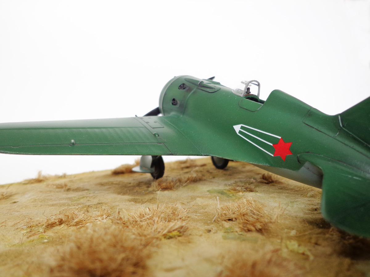 Но мне кажется, что такой чистенький и аккуратно покрашенный самолёт более логично смотрелся бы не на поле с пожухлой травкой, а на более гармонирующим с самолётом основании.