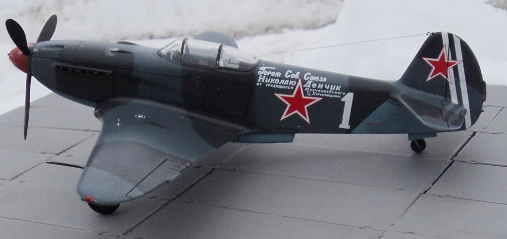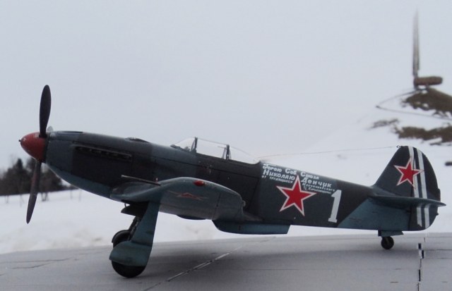 Самолет Як-3 в представлении не нуждается. Летчик, которому принадлежал данный самолет Н.Ф.Денчик, уроженец Харьковской области. Воевал вместе с Семеновм Роговым в 64 ГвИАП. После присвоения в 44 году ему звания Героя приехал в краткосрочный отпуск к себе на родину. Земляки радостно встретили Героя и собрали денег на новый самолет, который построили и отправили в полк, где служил Николай Федорович. прочитать о Николае Денчике можно тут
