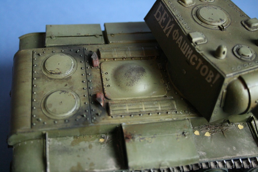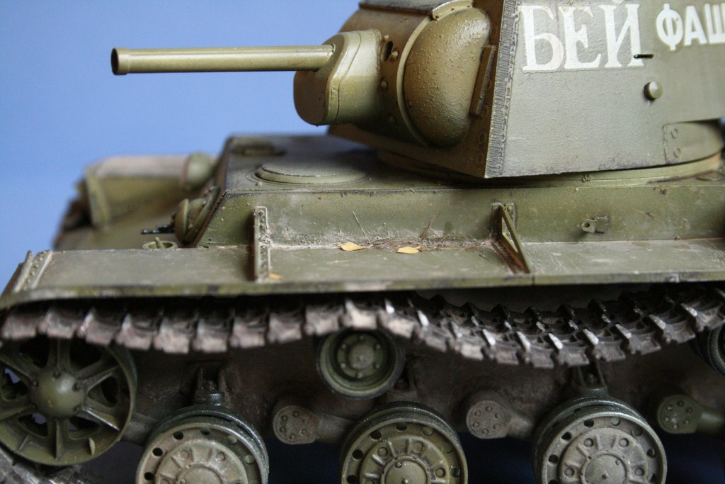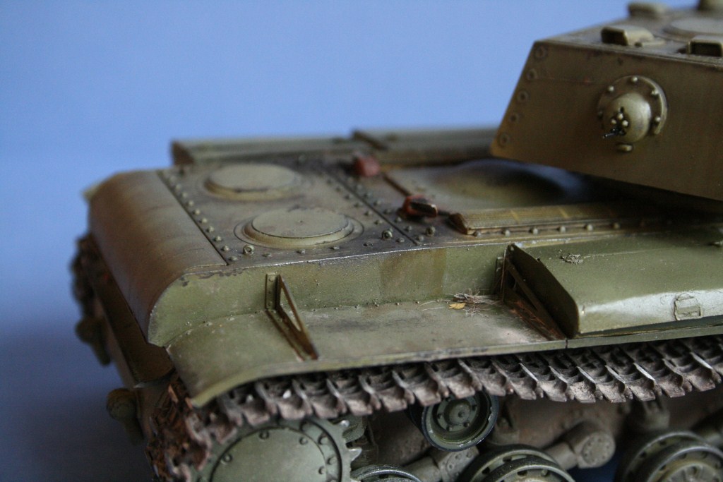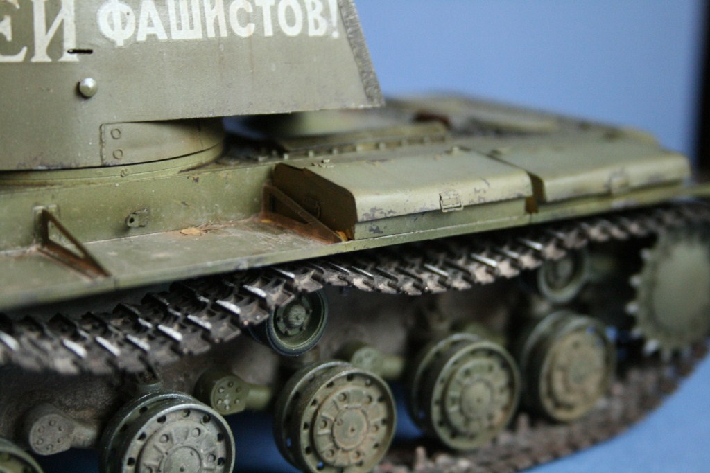Про грязь могу сказать так: полки наиболее подверженная загрязнению часть, по ним ходят и на них стекает гумно с башни и корпуса, при этом пачкать корпус пигментами я не люблю, лишь на башне есть традиционные потеки пыли и грязи. Катки, ну приглядитесь они довольно грязные, как и ходовая в целом.