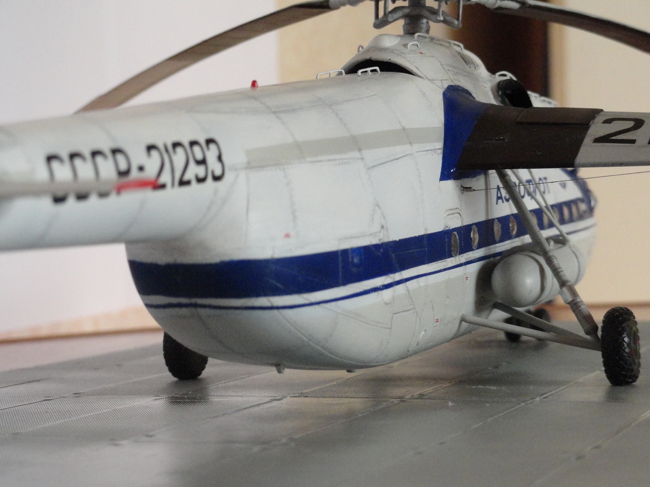 и неочень хорошее членение носового фонаря штурмана. В общем наборчик не для слабых духом. Строил год с небольшим, определенно к какому либо борту не привязывался просто выполнил гражданскую ливрею. В работе пользовался чертежами АиВ и фото из инета. Работа принесла массу положительных впечатлений, но были и разочарования когда что-то не получалось. В общем с помошью коллег сайта, настоящего русского языка и ведра шпатлевки удалось построить это чудо. Теперь о постройке применял шпатлевку от тамии (много), Красил красками АКАН. Из доработок БАНО и посадочные фары от фирмы ЕЛЬФ,шасси смола, поручни, ПВД и проводка НВ медная проволока. Вырезал нижний смотровой иллюминатор штурмана, также дверь выполнил в открытом виде, трап позаимствовал от МИ-8 натянул антенны из бантика. Синии полосы красил сам через маски, декали родные за исключением надписи Аэрофлот и курицы их взял от МИ-26 фирмы Бегемот. Более подробнее стройка изложена в Сказках о стройке. С Уважением удачи!