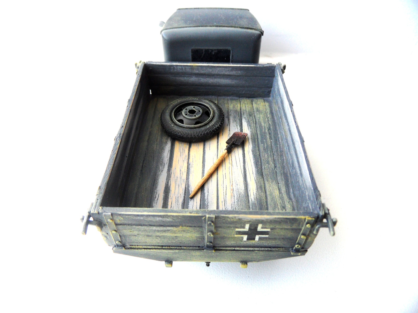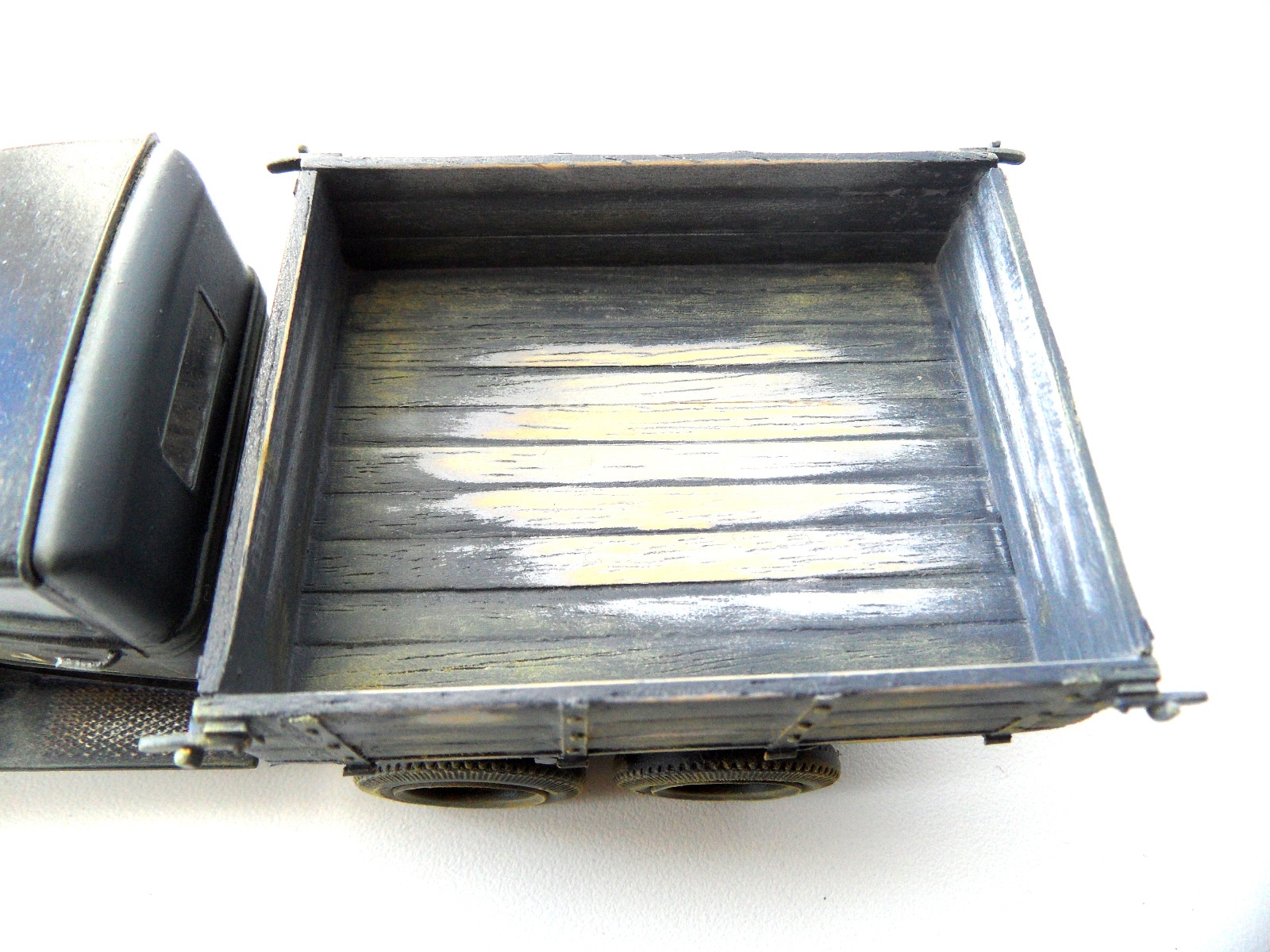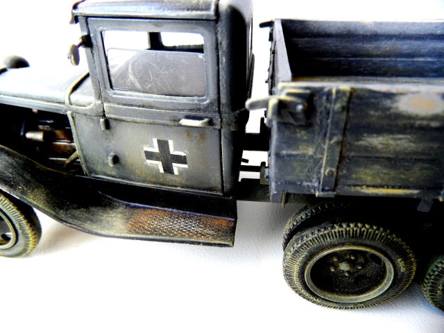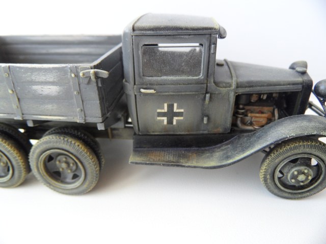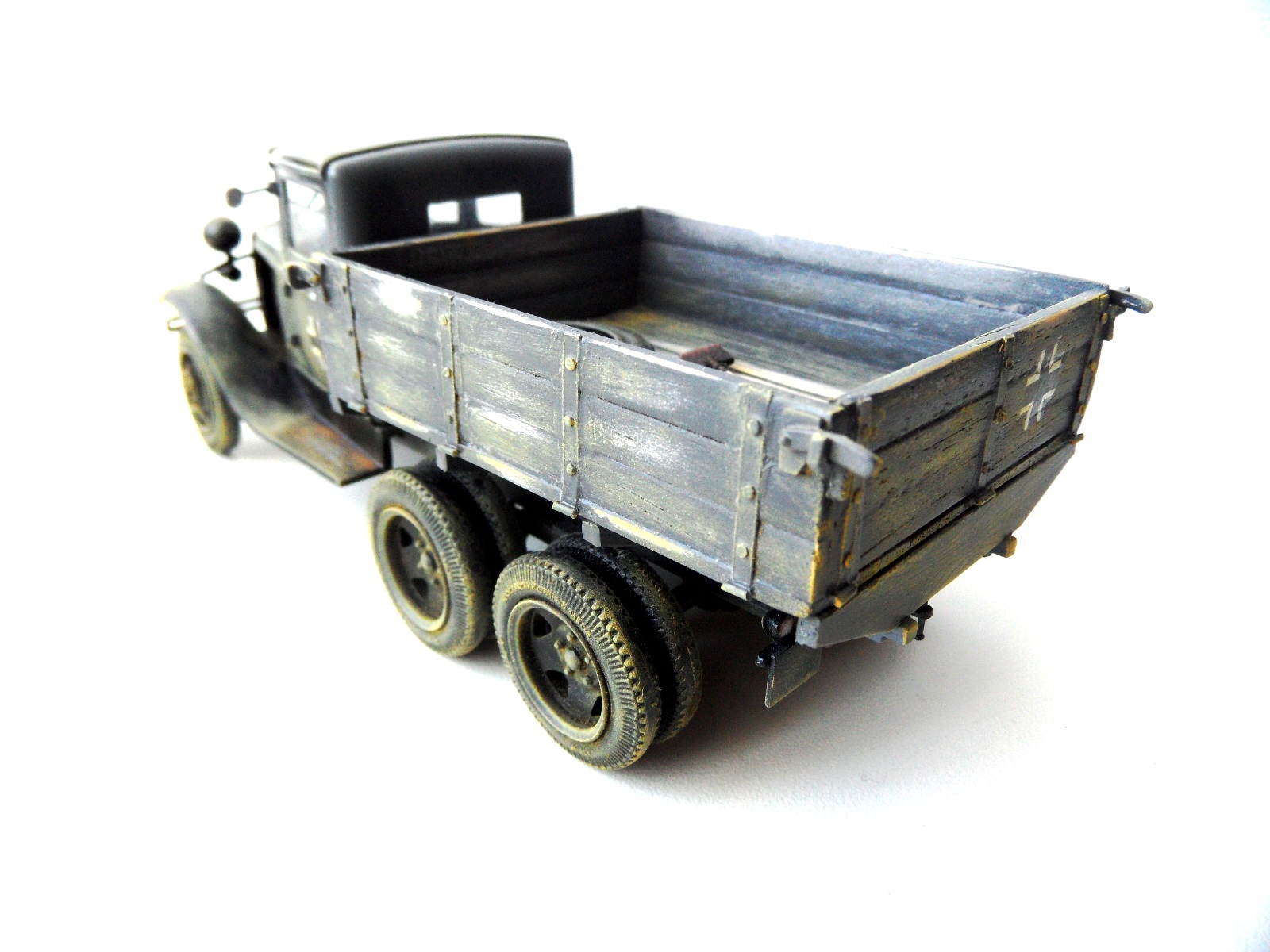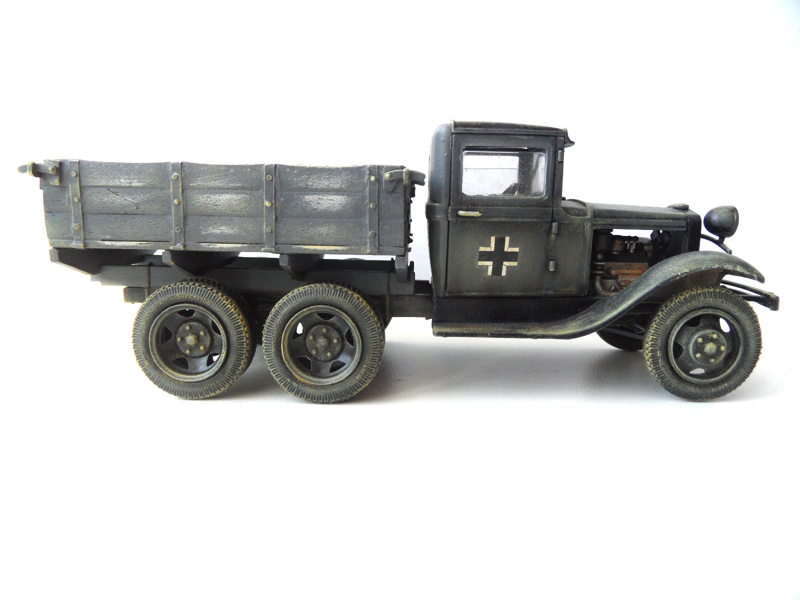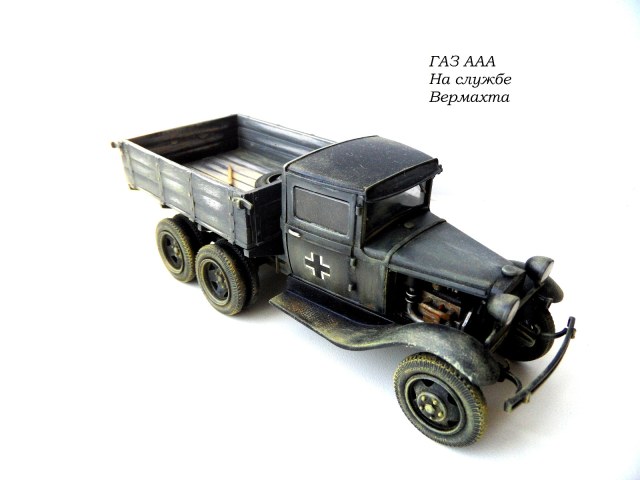 Доброго времени суток, уважаемые моделисты! Выставляю на ваш суд мою дебютную работу автомобиля - это ГАЗ ААА от Звезды. Изначально модель приобреталась в качестве «кошки» для освоения покраски аэрографом, поэтому это абсолютная изкоробка, тоже касается и мат.части, её здесь просто нет. Про качество кита думаю говорить не имеет смысла, но хочу добавить, что после этой модели расстался со Звездой навсегда. По сборке: изначально грузовик подразумевался служащим своей отчизне, даже была начата покраска в зеленый цвет, но мысль о плененном грузовичке не давала мне покоя и я решил, коль уж это пробный экспонат, то почему бы и нет? Но порывшись в нете не нашел фото с крестами и решил, гулять так с песней… Так же по ходу постройки грузовичок пару раз оказывался на грани помойки, но что то меня останавливало выкинуть его. В самом конце решил попробовать запилить самодельный кузов из деревянных реечек. Если честно, то конечным результатом остался доволен! А так это или нет, судить вам…
