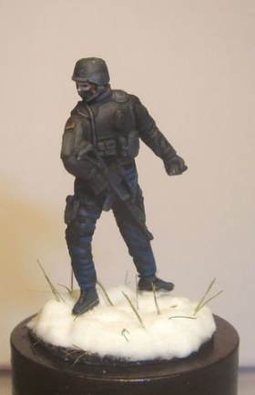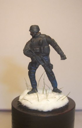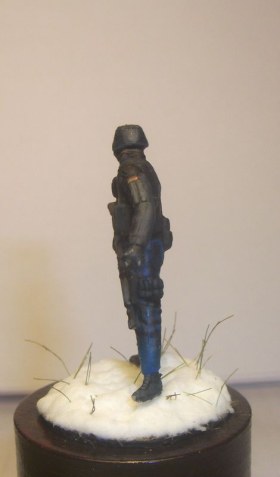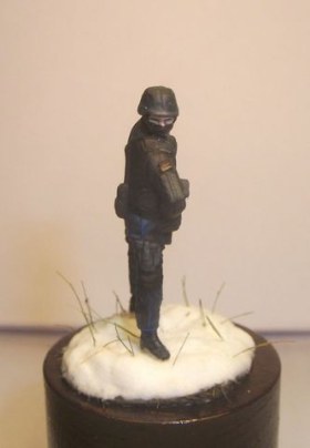 Фигурка в масштабе 1/72 25мм окрашена акрилом и эмалями. Снег сода + ПВА, трава для жд. макетов.
