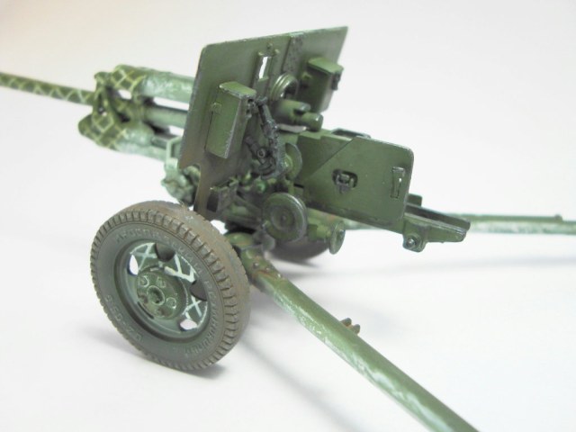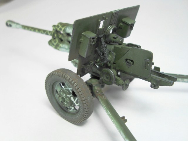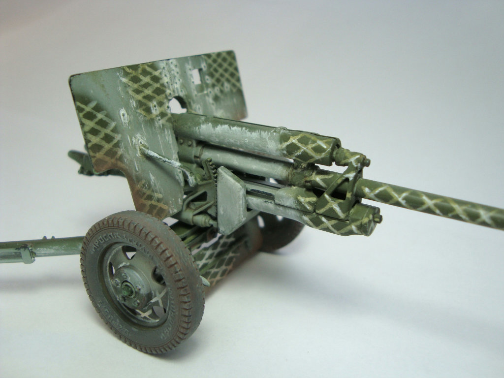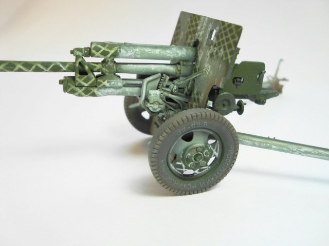Фото ЗИС-3 в сетчатом камуфляже я не нашел, есть только фото гаубицы МЛ-20 в таком камуфляже,но согласно инструкции по маскировке зимой рекомендовалось окрашивать 2/3 поверхности орудия в белый цвет(мел, известка, белила), а оставшуюся часть в темно коричневый или заштриховывать "сеткой" темные пятна. Красить просто в 4БО мне было скучно вот я и "по глумился". Фото МЛ-20 из книги Мощанского "Бои за Бреслау". А вообще КИТ ужасный, я его в 93-М купил двадцать лет провалялся недавно решил собрать.