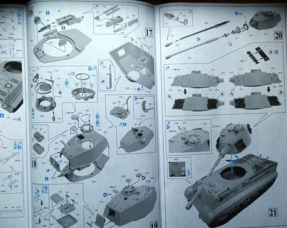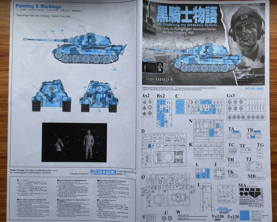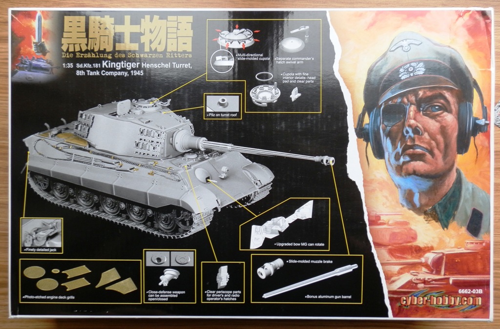Добрый день, уважаемые коллеги, хочу представить обзор модели Королевского тигра с башней Хеншель от Кибер Хобби. Набор из так называемой "комиксной" серии, предлагающий построить танк из некой "8th Tank Company, 1945" , однако имея необходимые декали можно сделать для себя что то более приземленное. Сам набор упакован в большую коробку с изображением самого танка и одноглазой мрачной личности на фоне сюжетов из комиксов. Внутри присутвует лист с доп. деталями, в которые входят точеный ствол, плата травления, два металлических троса разной толщины, две ком башенки, кусочек медной цепочки, прозрачный литник с остеклением, а также пакетик с Магик траками раннего образца и декаль. Литников в коробке 17 штук, из которых четырнадцать литники самого танка (литники с деталями ходовой повторяются), четыре литника с альтернативным шанцевым инструментом под травленые крепления и коуши под стальные тросы, хотя на основных литниках они также присутствуют. Как я понял в наборе присутствуют как старые литники, которые еще паковала Звезда, так и новые с различными бонусными мелочами и дополнениями. В целом качество неплохое, облой присутствует в скромном количестве, утяжин вроде не заметил. Инструкция большого формата, в дрегоновском трехцветном оформлении, достаточно информативная. Декаль, как и схема окраски дана на единственный вариант, изображенный на коробке.