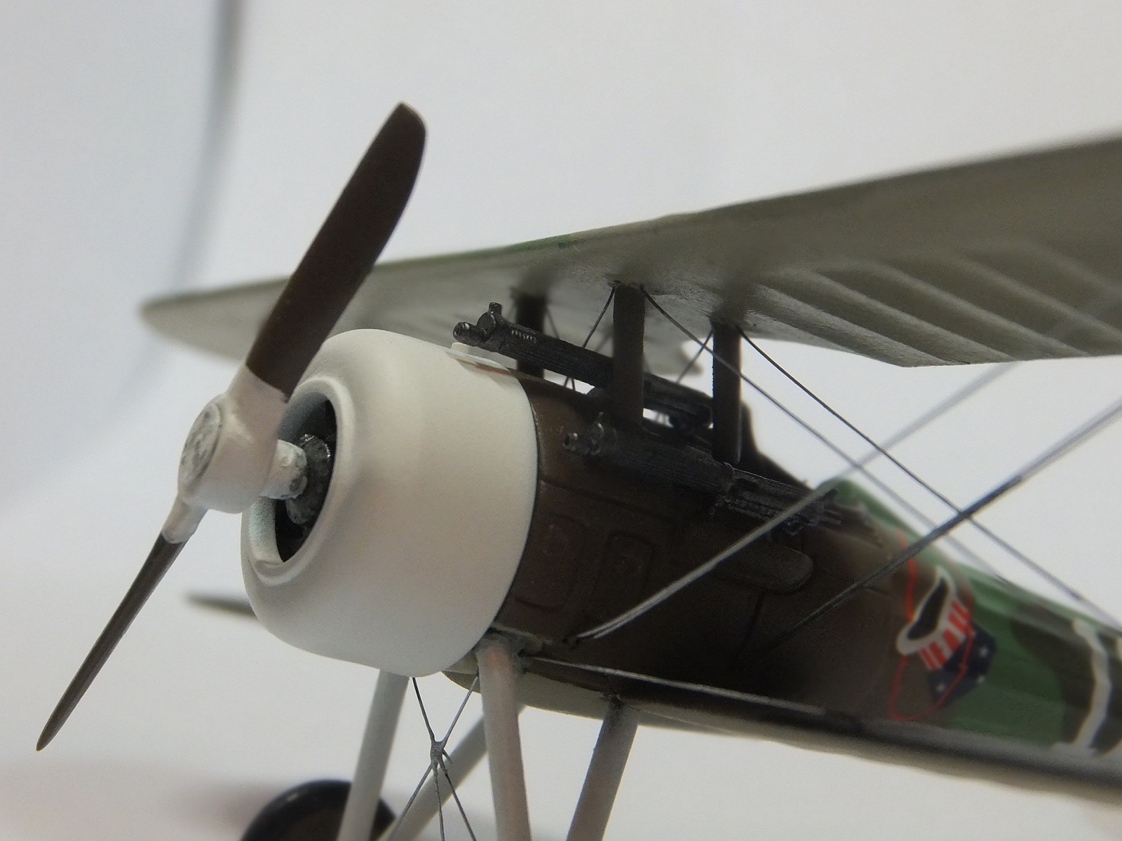Красил водным Аканом, не угадал с цветом нижних поверхностей, должен быть желтее. Остальные цвета - моя интерпретация, в оригинале красилось по стандарту Methuen, конкретных цветов нигде нет, на всех форумах одни интерпретации. Пачкать начал (видно на втулке винта), но продолжать не стал, подумалось, что лишнее, учитывая размеры модели, легко переборщить и выглядеть все это будет одним грязным пятном.Только по пулеметам прошелся сухой кистью, но все равно не видно. Кабину оборудовать не стал, все равно не видно, да и мелковато для меня.