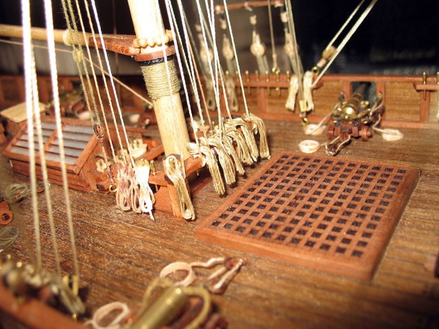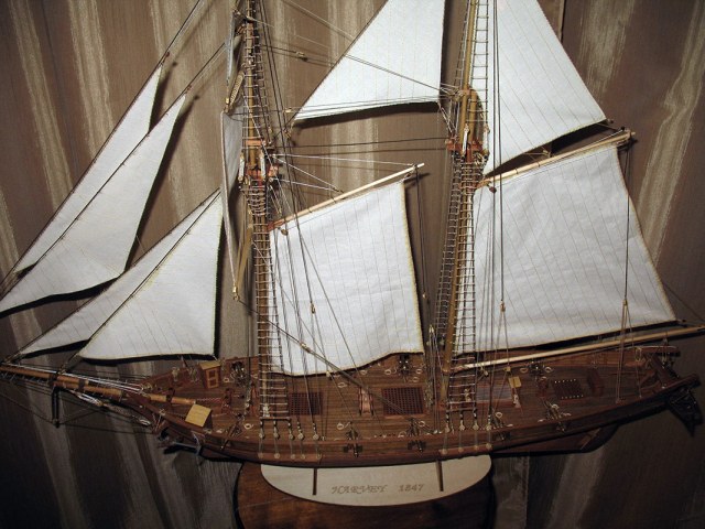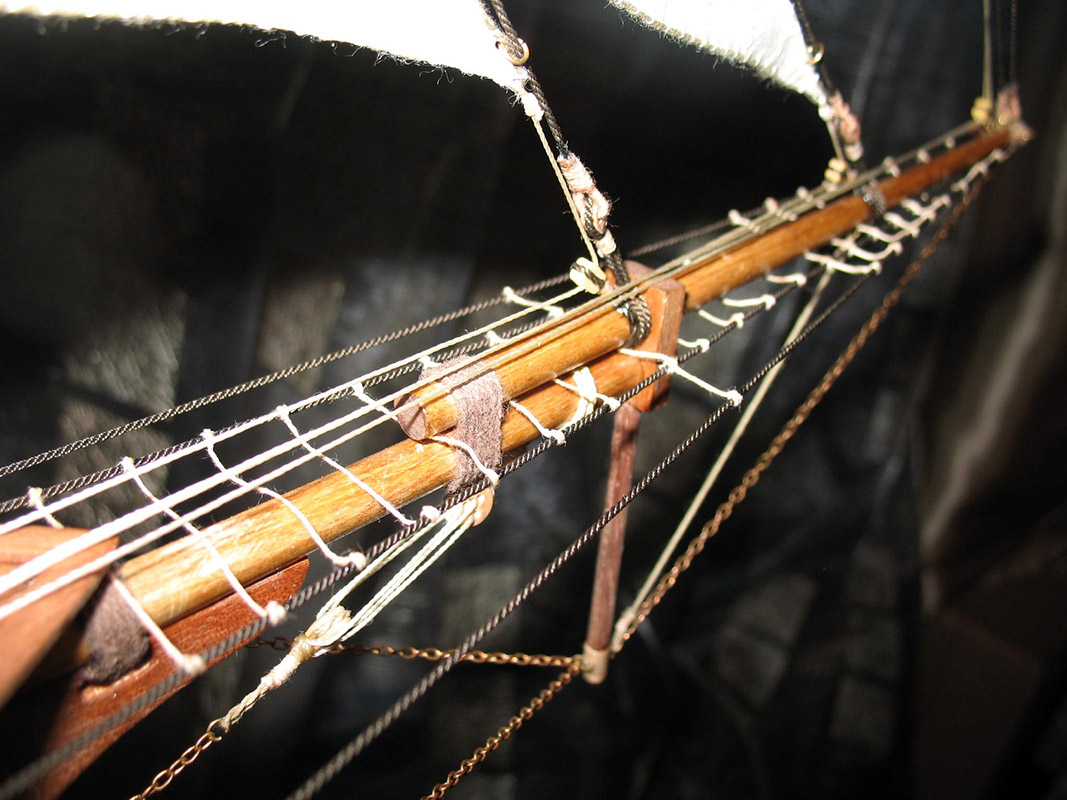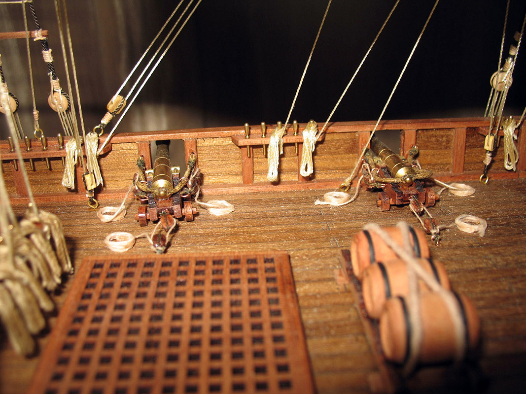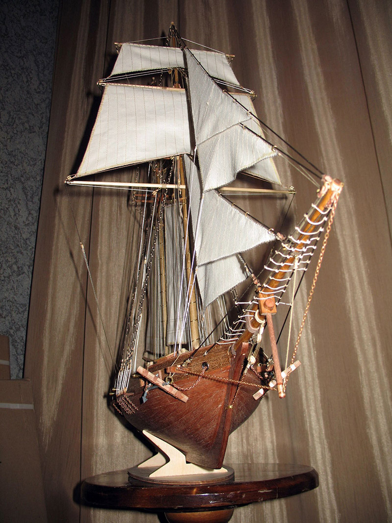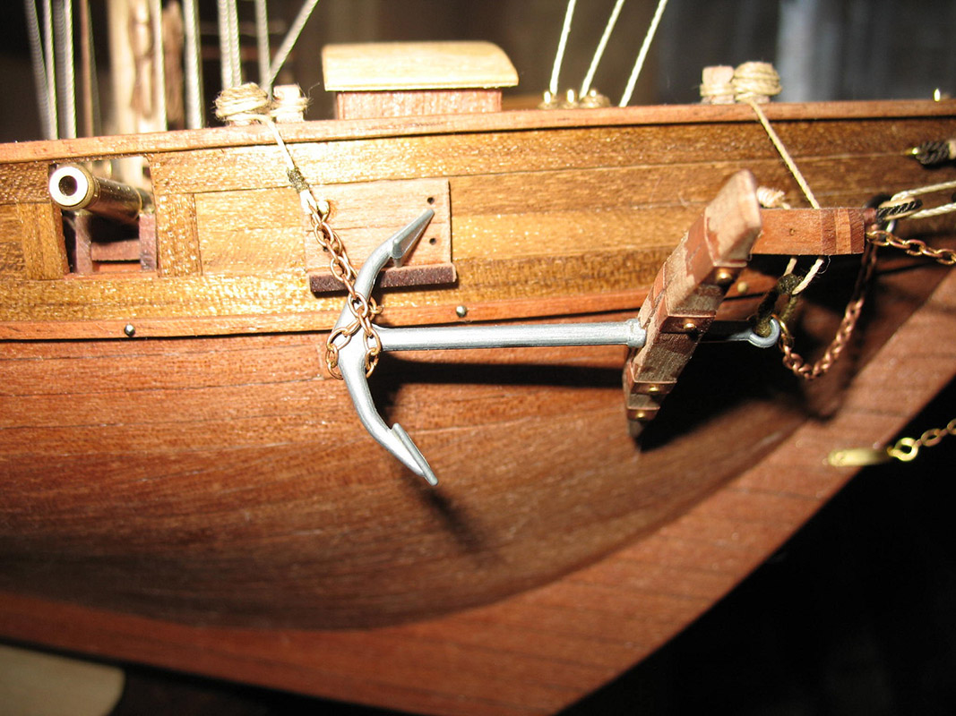 Так,автор просит справедливости.ее есть у меня/хочется так думать/.Первое- простыни на веревке сушаться.Господа коллеги!Парус- живое существо,надо все время думать откуда дует ветер на мою модель и как будет вести себя парус.Теперь второе-все/!!!!!!!!/ все "веревки",которые могут быть залиты водой/морской!/ тировались,т.е. были черными или темно-коричневыми.Я про обвязку под бушпритом.Глаз режет.Якорная цепь на этой шхунке-нонсенс,а ее проводка и укладка кроме улыбки ничего не вызывает.Особенно ручка из деревянного шкива.Только канат.Да и кто-то сказал про облой на штоке,а по моему он как раз сделан нормально,и это стык двух половинок дерева.С пушками можно ничего и не делать,оставить в "золоте",через какое-то время потемнеют.За обвязку орудий- большой +,только брюк коротковат.Как минимум на полную длину орудия должно откатится.Если можно лучше исправить.И якорный канат и брюк.
