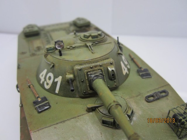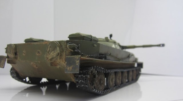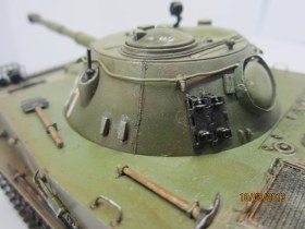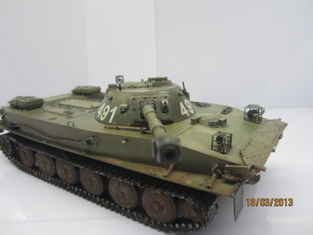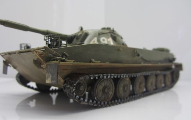 Здравствуйте коллеги!!Хочу представить вам свой ПТ-76,который проводился в рамках коллективной стройки у нас на коробке.Танк делался как ранний вариант,но с последующей модернизацией.Из доработок: добавил недостающие сварные швы,заменил некоторые скобы на проволоку,рассверлил сливные отверстия по бокам машины(Трумп дает их глухими).Фары ЕЛЬФ,Покупал к нему еще и траки от мастер клуба на защелках,но они оказались бракованными.Пробовал склеить ничего не получилось.В итоге поставил родные гуси и с помощью нити прижал их к каткам.Красил акрилом тамия,цвет мешал сам на глаз.Тонировка масло,смывка,лаки,пигменты.Вот в принципе и все,что хотел рассказать.