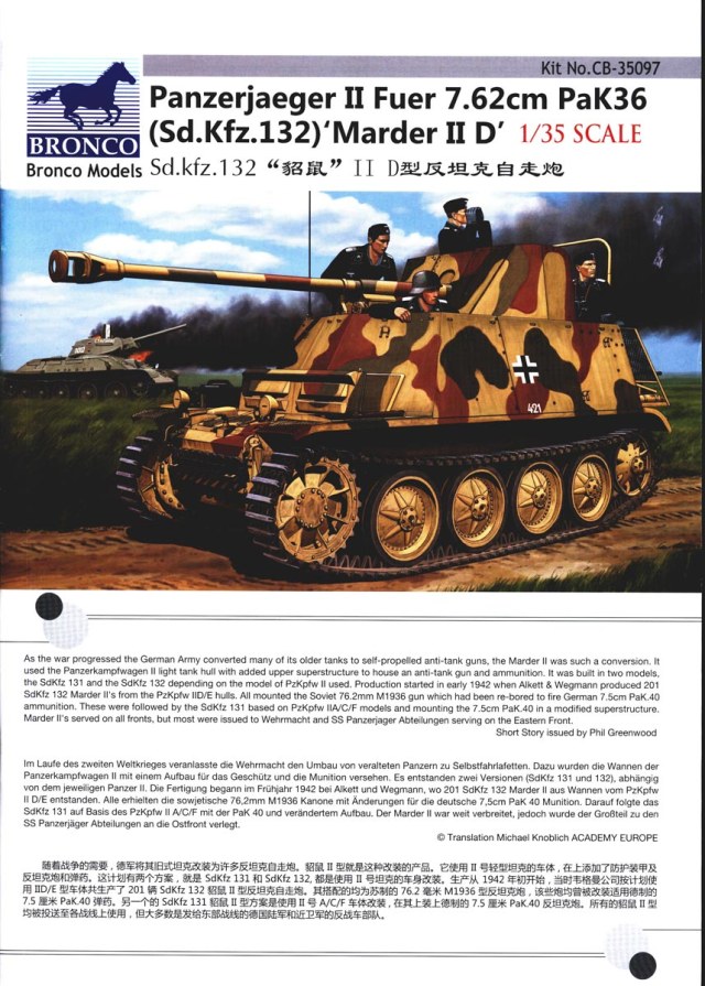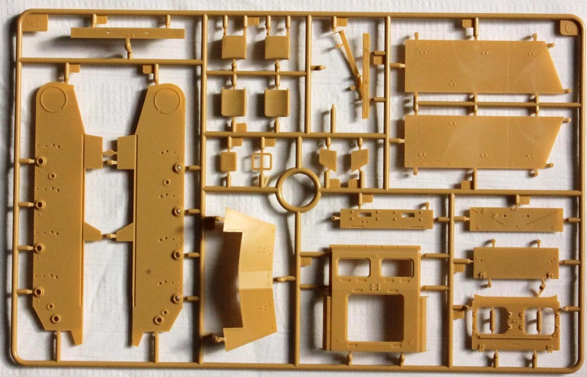 В довольно увесистой коробке находится 10 пакетов с деталями корпуса и орудия..и пять пакетов с литниками траков. Отдельно на картонном вкладыше закреплена плата с фототравлением , декалью,и два литника с прозрачными деталями фар и триплексов