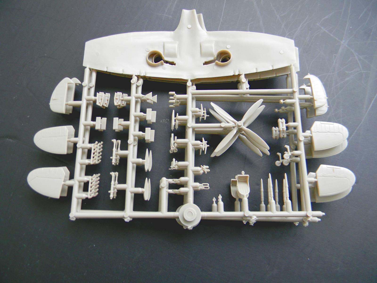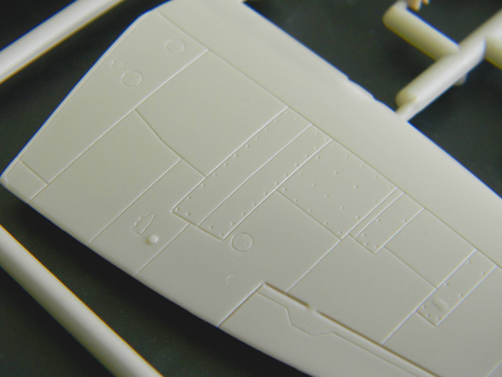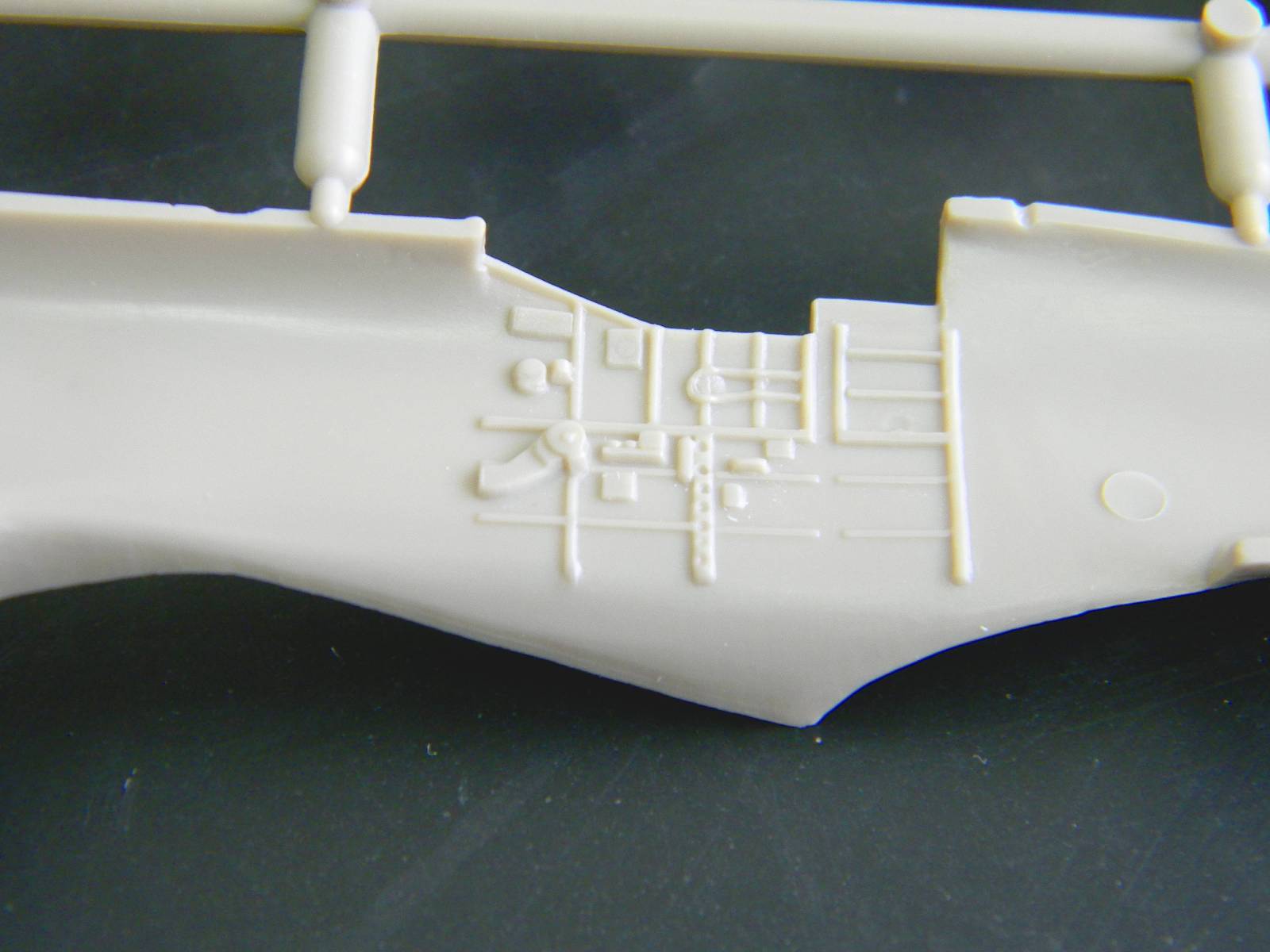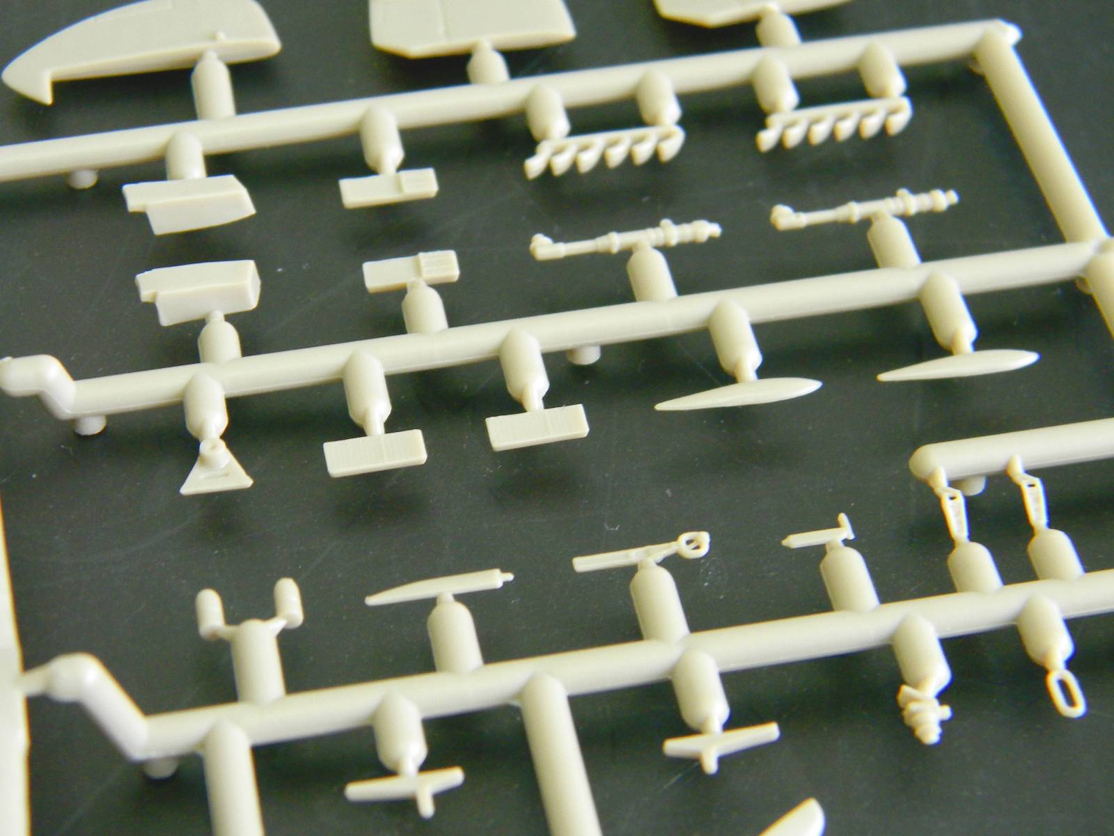 Перейдем к пластику. Отлита модель хорошо, ни облоя, ни утяжин я не заметил. Расшивка, хотя и мелкая, но четкая и не замыленная. Подробный кокпит, ниши шасси, два варианта руля поворота; обтекатели пушек даны отдельно, можно сделать разные варианты крыла. Фонарь тонкий и прозрачный, но купание в футуре не повредит. В чертежи не вкладывал, ежели кто исследовал данный кит, пожалуйста, отпишитесь.