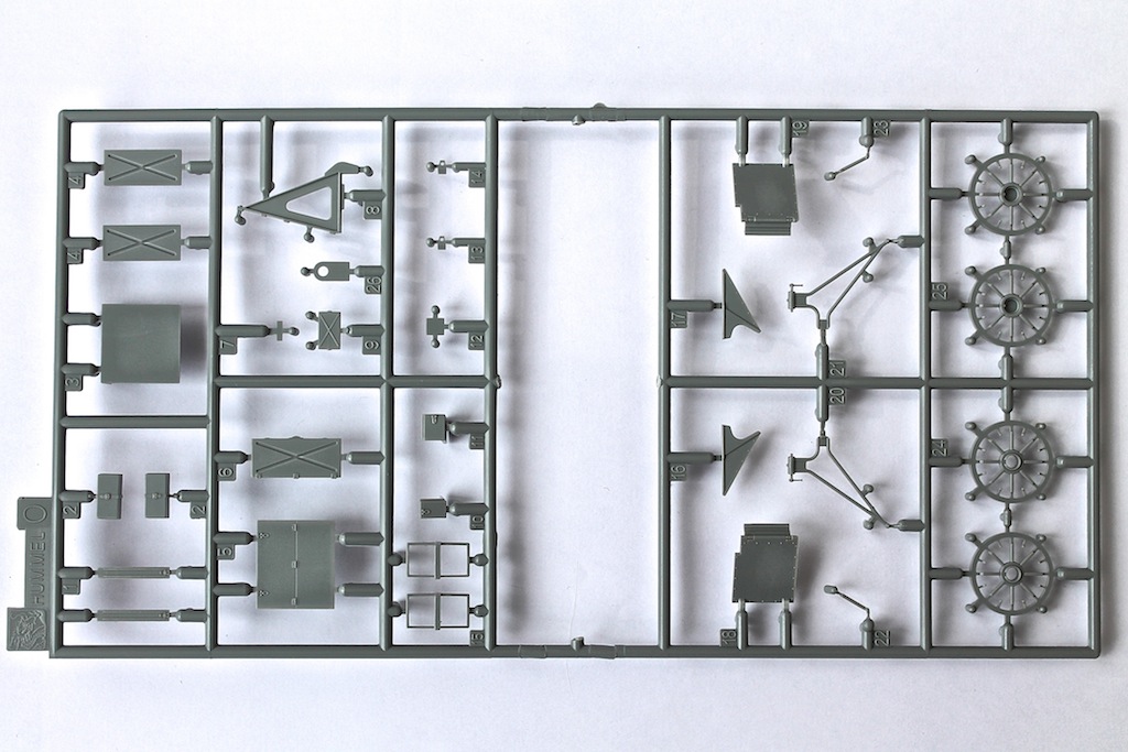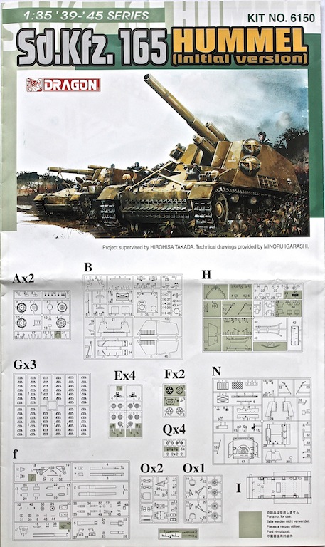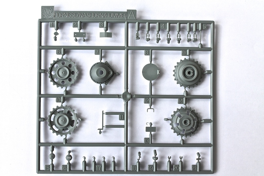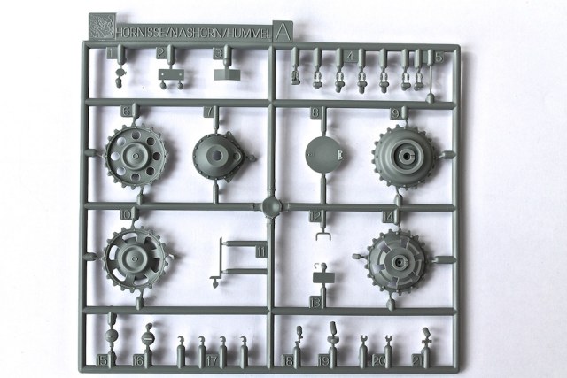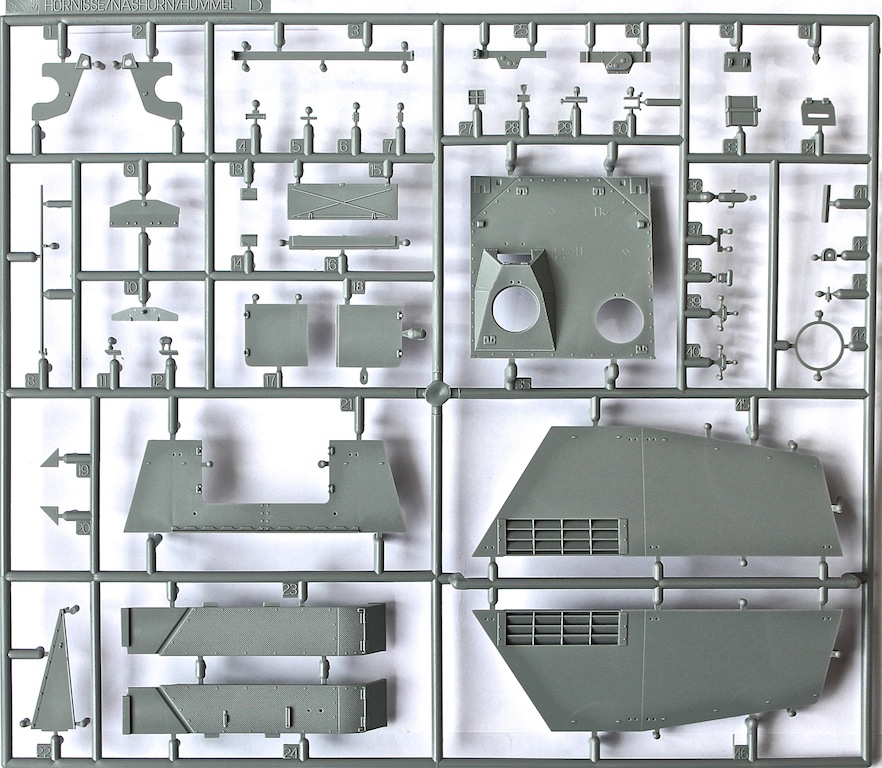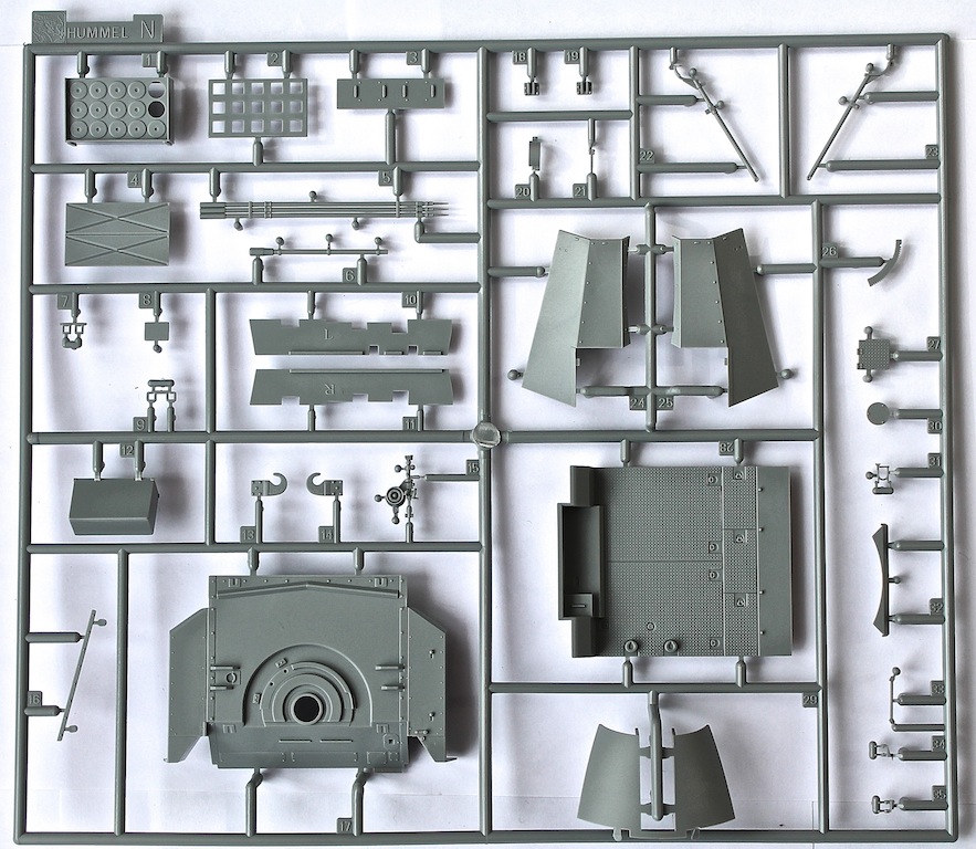 Hummel-начальное производство. Хороший набор, но без травления. 19 литников с деталями, плюс три с наборными траками. Траки нормальные, но как водится, на каждом сзади по два толкателя. Ствол из двух половинок и по-этому, уже давно, куплен Jordi Rubio. На мой взгляд, травлением можно не дорабатывать, если только по мелочи т.к. детализация на уровне. Производитель предлагает два варианта окраса : Hoenstaufen и неизвестный юнит.