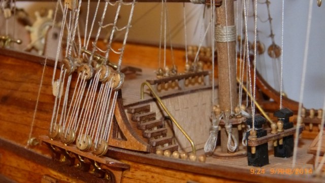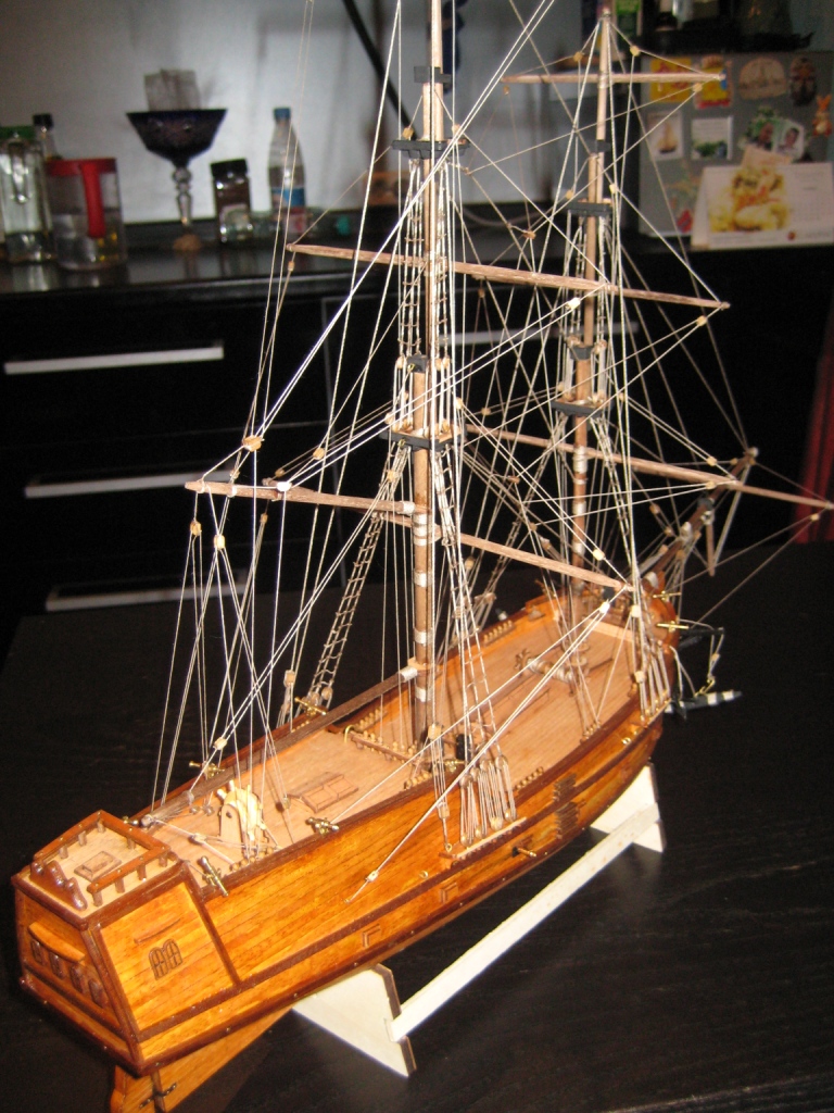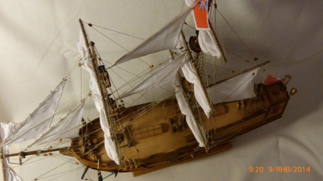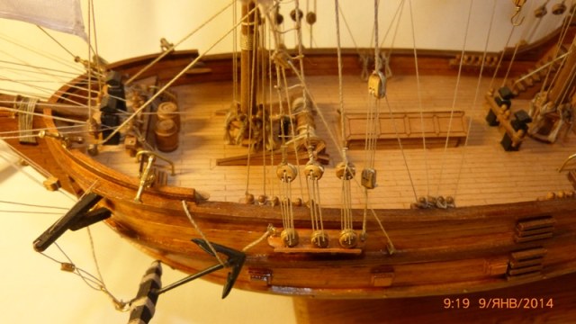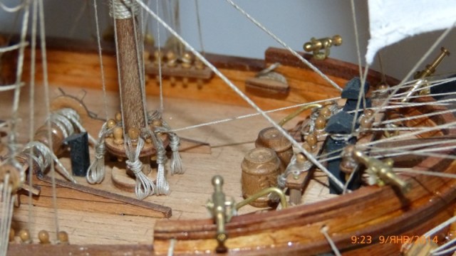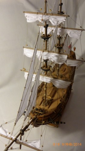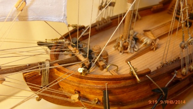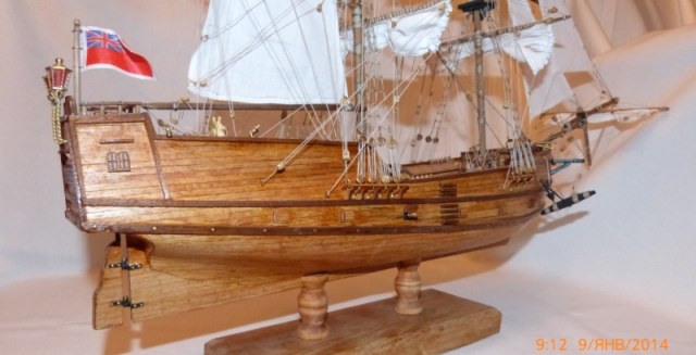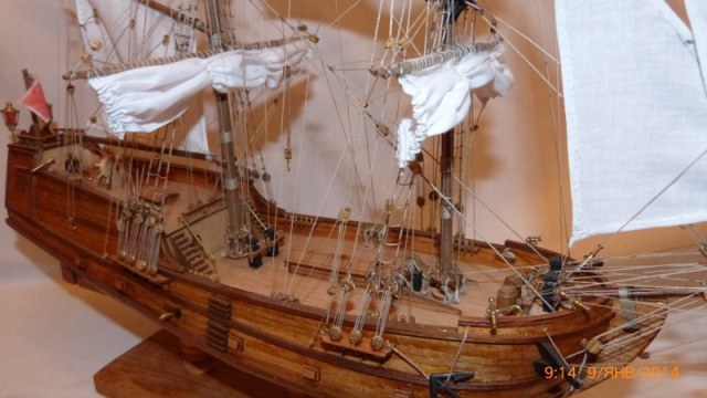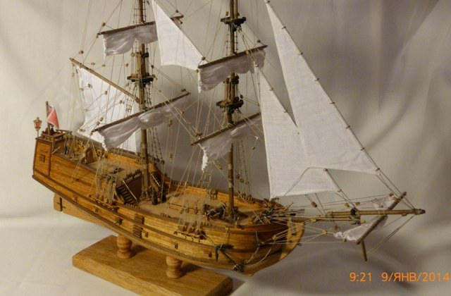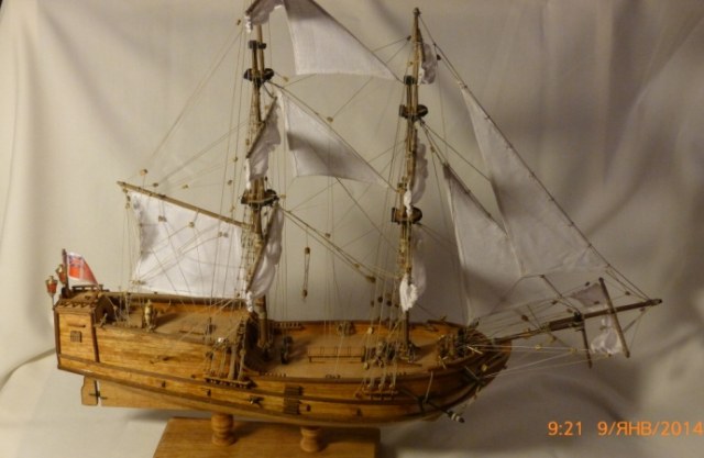 Масштабная модель английского брига, популярного в 17-18 веках. Вооружение модели состоит из десяти фальконетов по обоим бортам корабля и двух выдвинутых пушек. Остальные десять пушечных портов закрыты, корабль идет в спокойных водах.Размеры модели: длина 520 мм.высота400 мм.