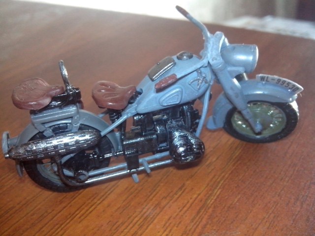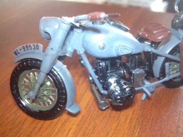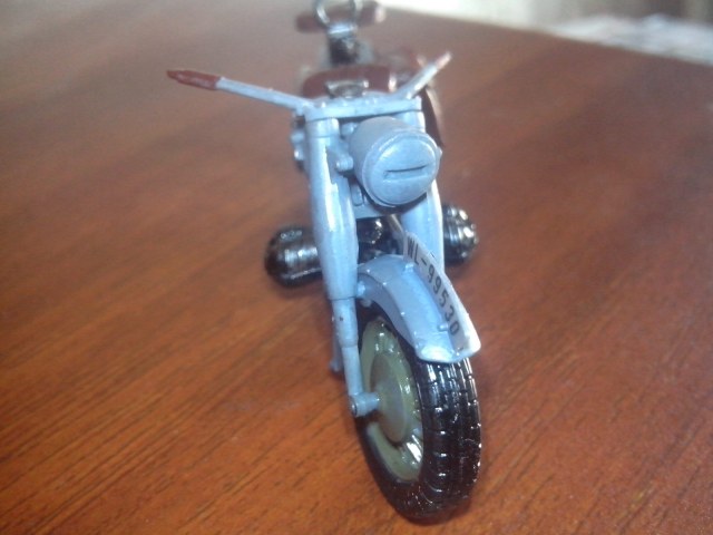 Пиветствую.Рули мотоцтклов в то время красились в базовый цвет, так что тут все верно.Байк имеет карданную главную передачу(на модели он черным окрашен).Движок должен быть не хром, а скорее алюминий или сталь. Выпускная система красилась в землистый цвет.Вобщем все можно на фото посмотреть.С уважением.