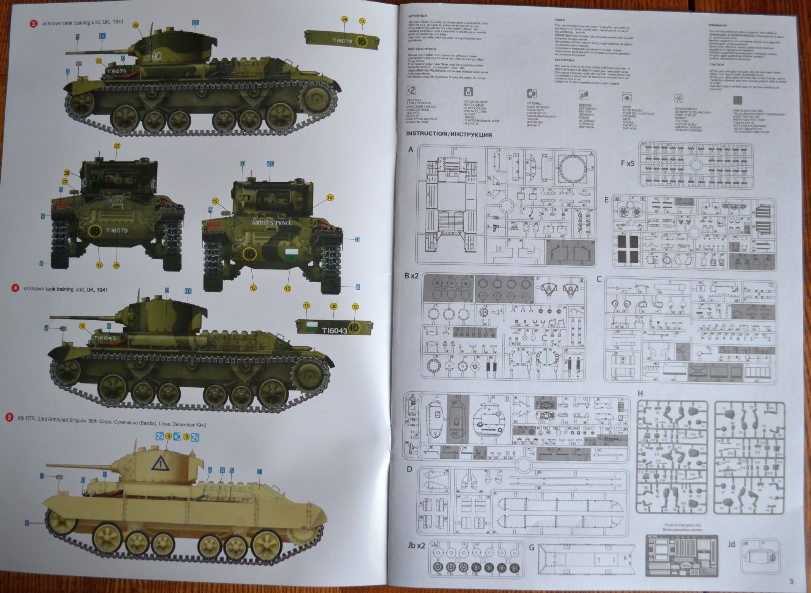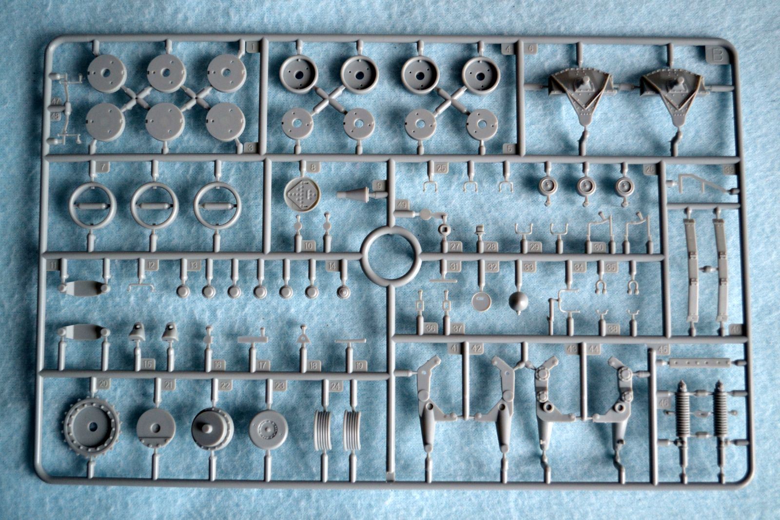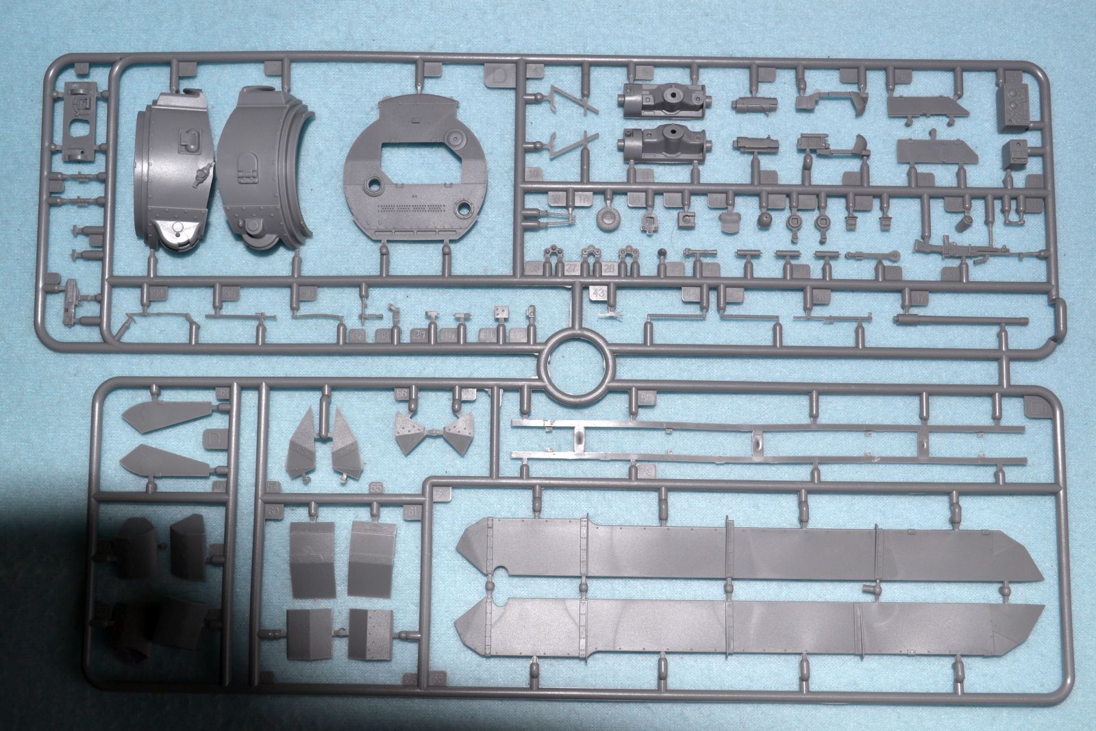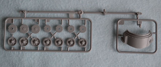 В каробке 14 литников ( 5 литников траки, 1 машинное отделение, 4 ходовая и 1 солдаты) + корпус+ декали и небольшая плата травления.