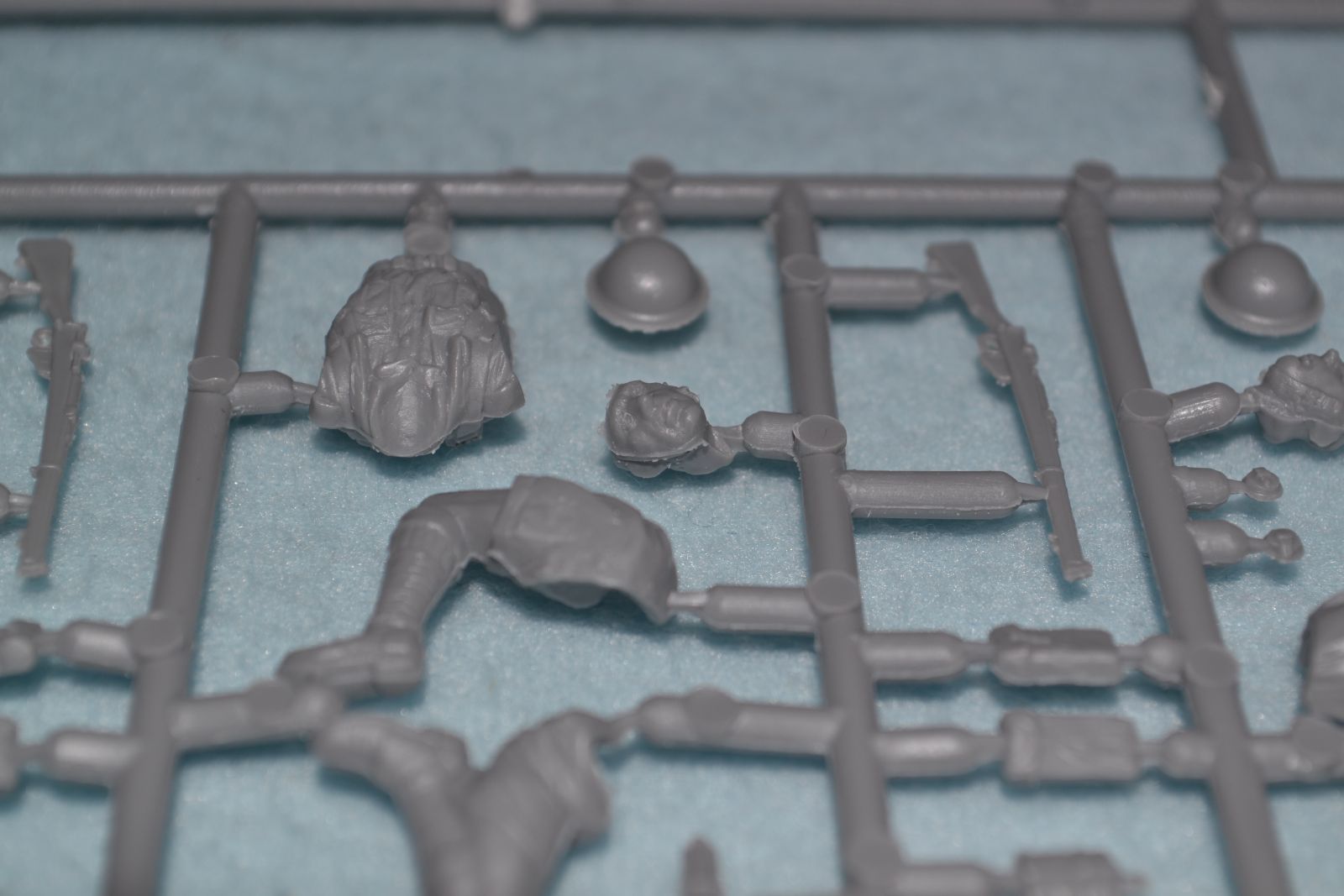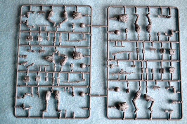 В набор входят пять фигур пехотинцев в шортиках. Облой в минимальном количестве заметил только на плате с ходовой и фигурами.