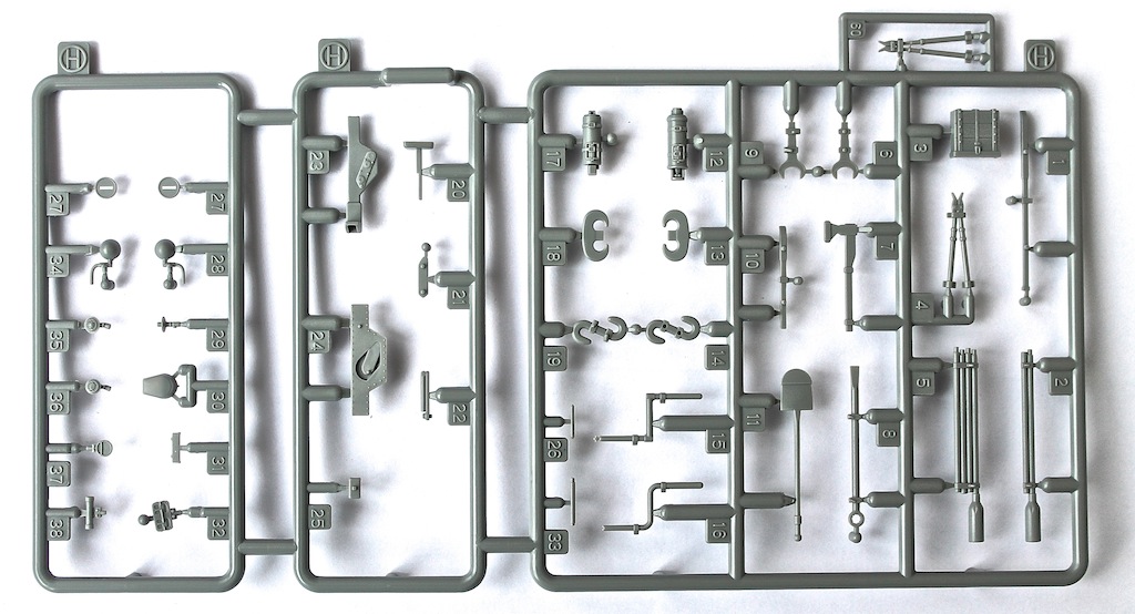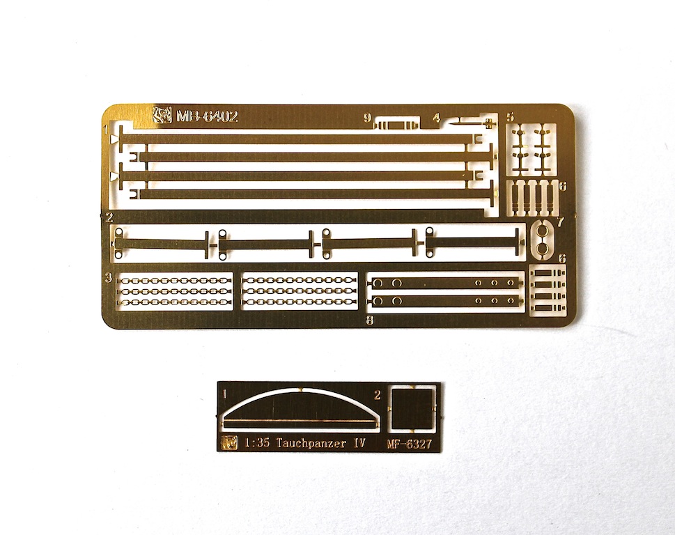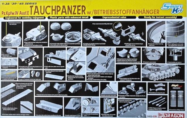 Четверка Е с оборудованием для подводного хода. Набор богатый. Огромное количество деталей. Много фототравления. Наборные траки Magic Track. Наборные катки! И т.д. Производитель предлагает два варианта сборки: Обычный танк и "подводный". Имеется тележка с дополнительными топливными бочками (как я понимаю). Вообщем много чего.