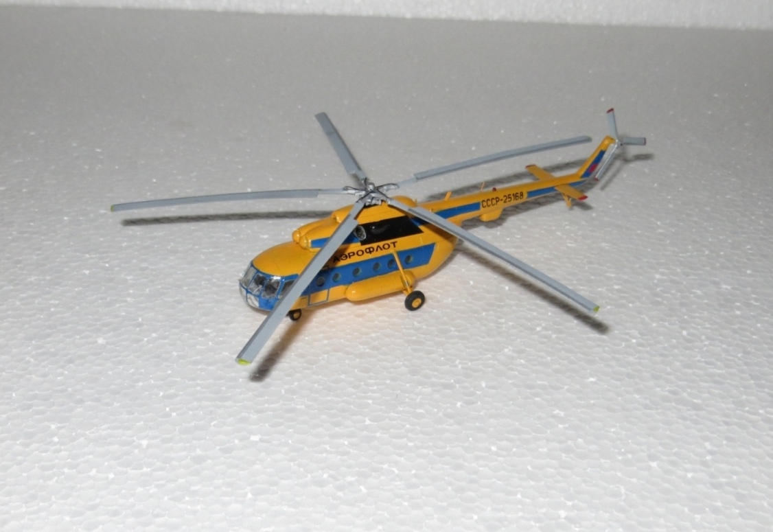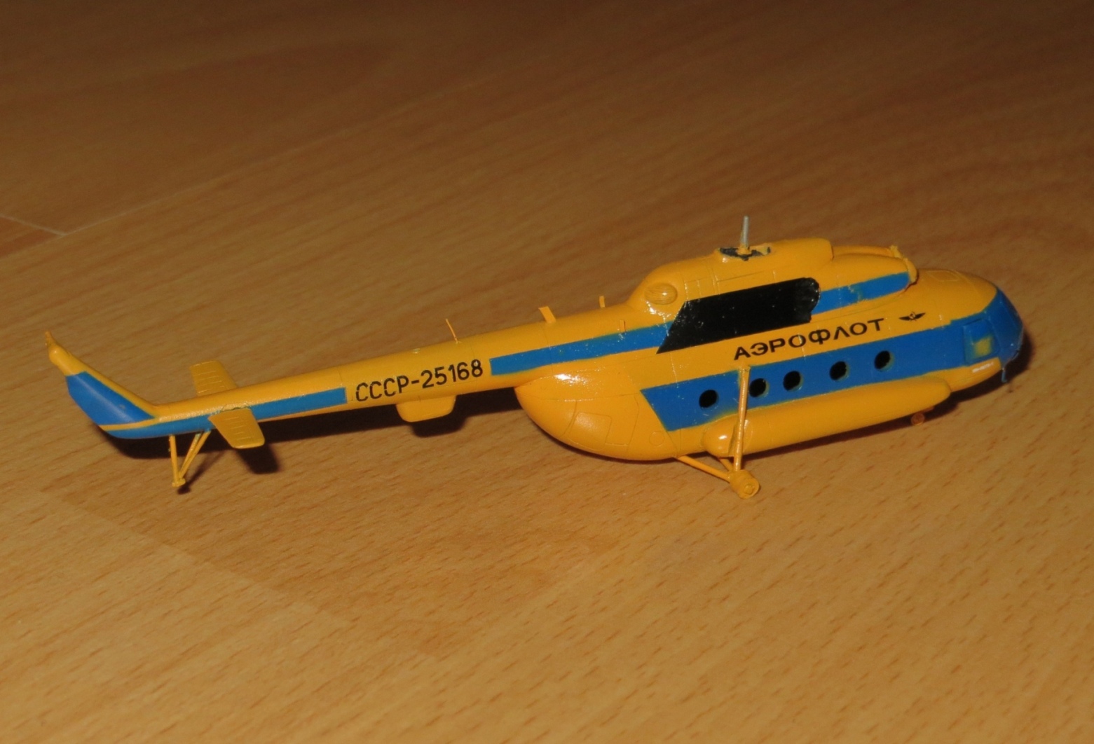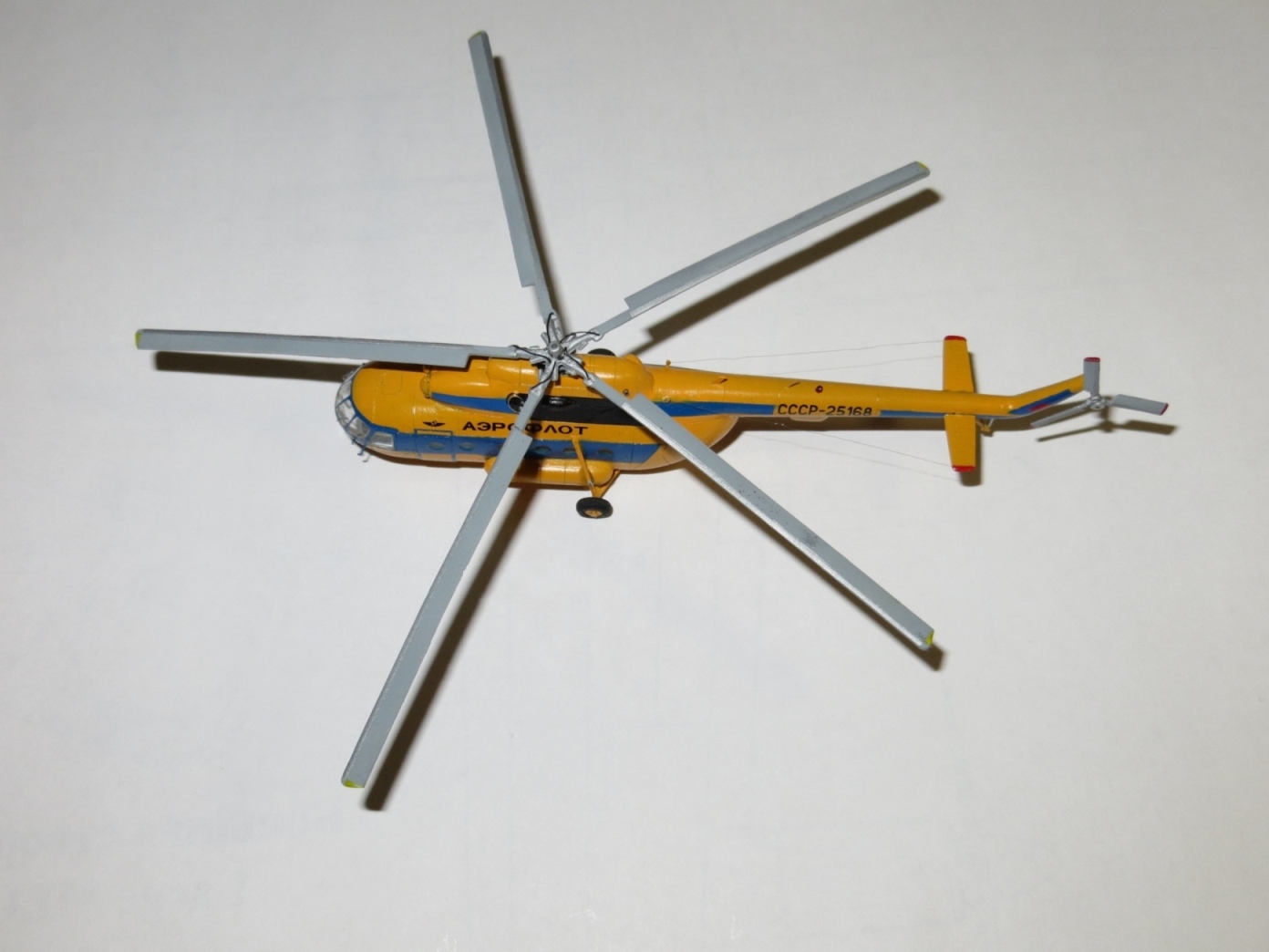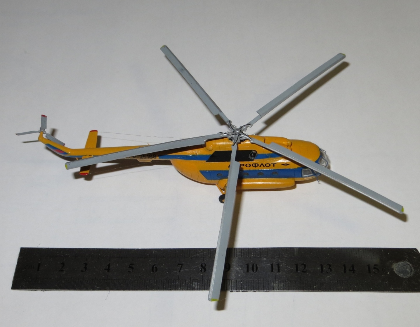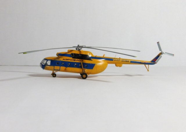 Вся модель выкрашена красками, декаль - птичка аэрофлота, надписи аэрофлот, бортовой номера, флаг СССР и надпись Ми-8МТВ-1.