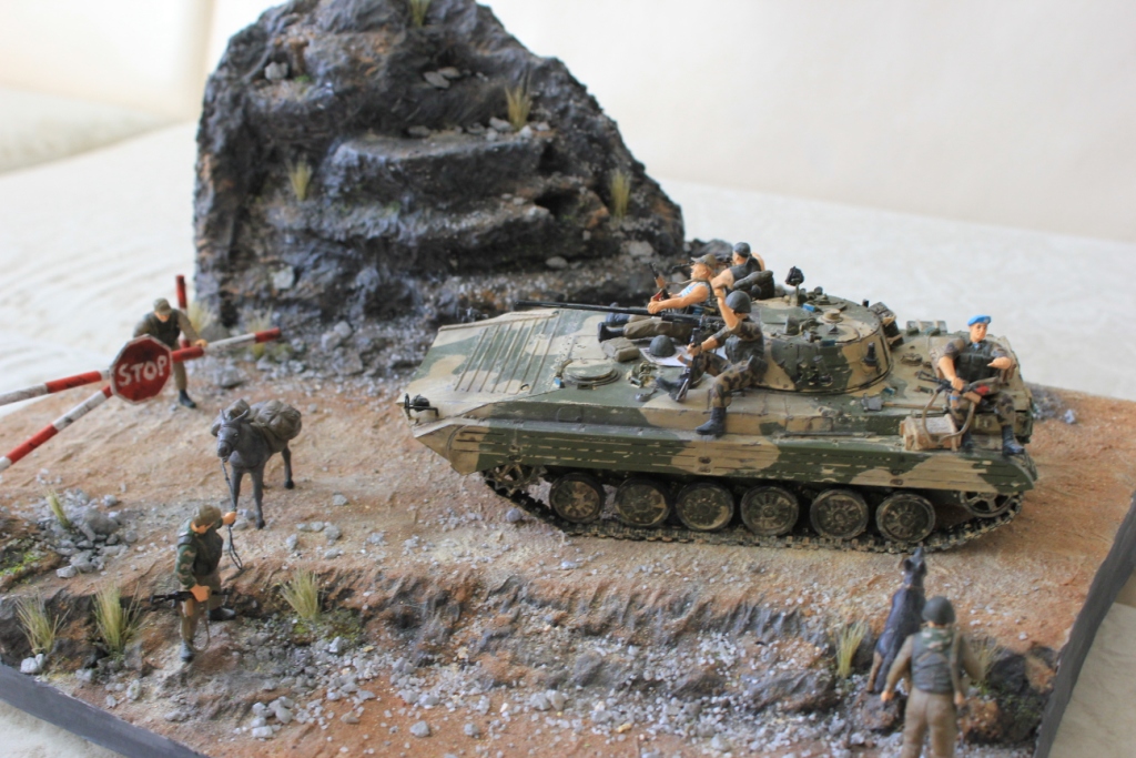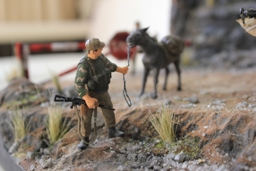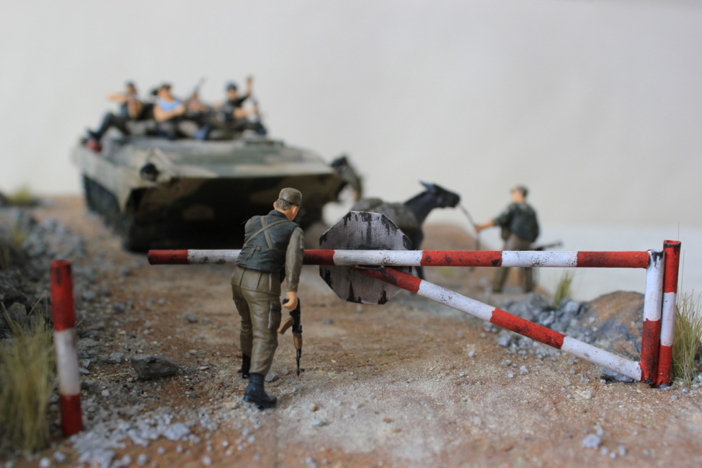 Основание и гору я делал из пенопласта, шлагбаум из литников, кустики из строительной кисти, покрашенной разными оттенками зеленого цвета, красой "Звезда".