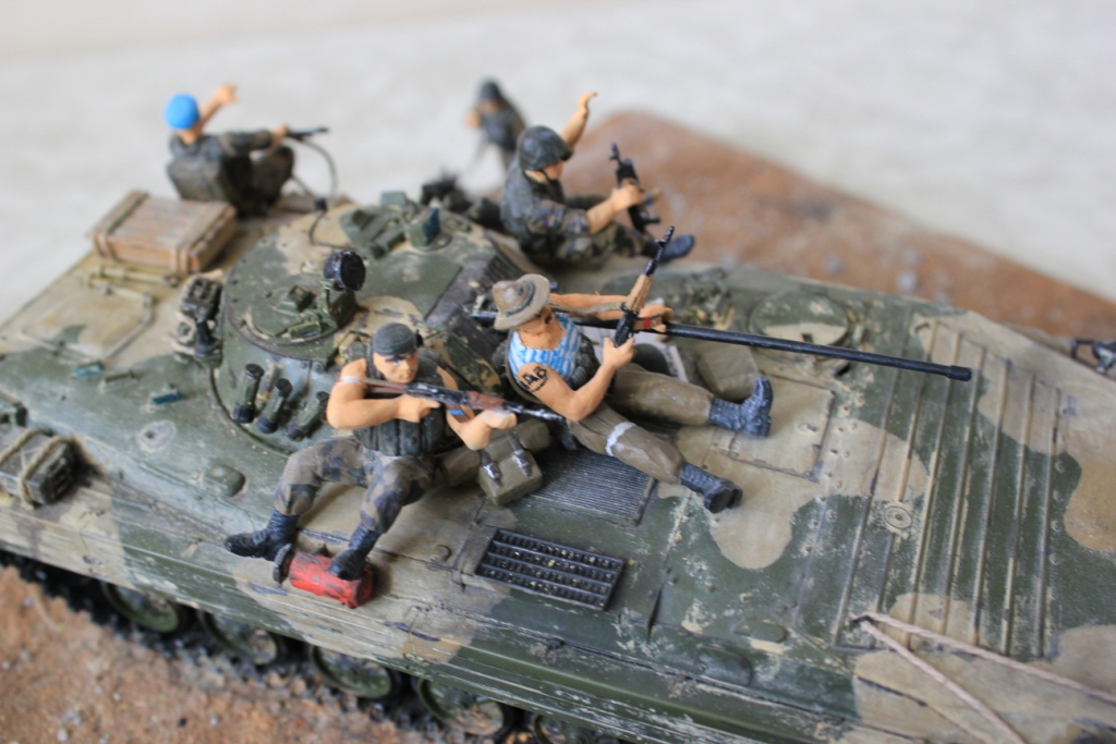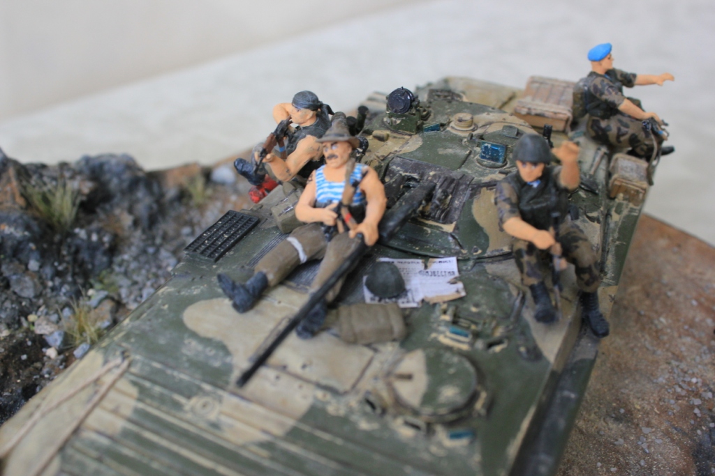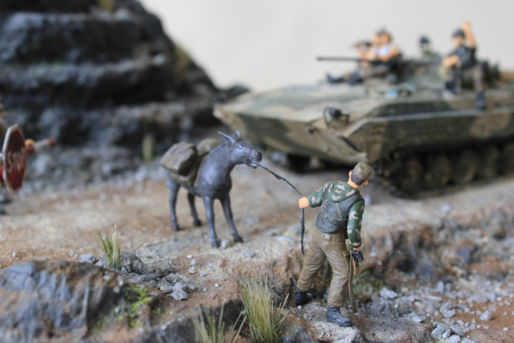 Двоякое впечатление от просмотра работы. Основание классное, сюжет не плохой, вроде бы БМП не плох, хотя сложно его рассмотреть на предоставленных фото. С другой стороны неудавшиеся фигурки, особенно не понравился мужичок в тельняшке, он как-то по-кукольному завалился назад, смотрится дико. Ну и фото, фото мало, не все ракурсы удачные, фото на левый борт и корму БМП напрочь отсутствую.