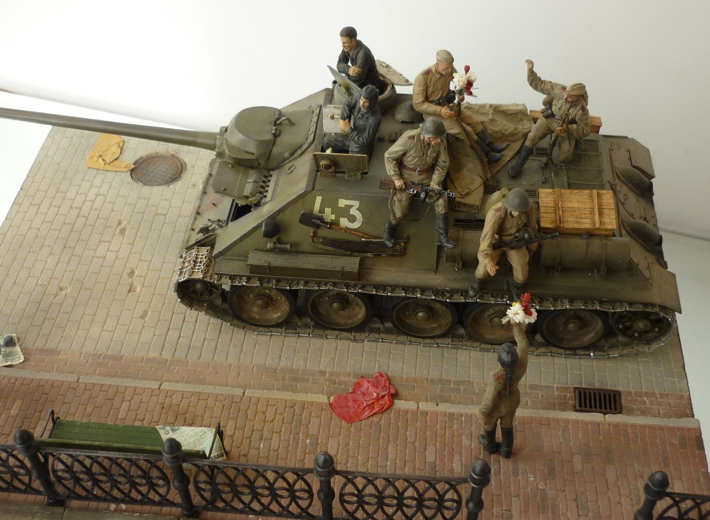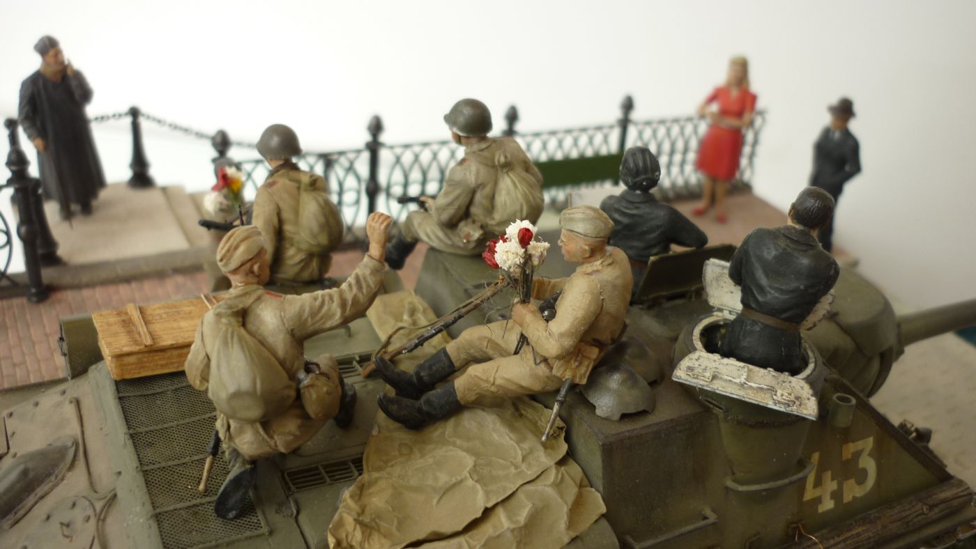 Доброе всем время суток! Наконец то я ее доделал.Мостовую подсмотрел у MiniArt,и решил сделать сам из алебастр, как получилось судить вам.По поводу пехоты та что на броне, а в частности ее форма у фигурок , не нашел я чтобы она была образца после 43г, довольствовался тем что есть.Краски тамия пигменты миг .Приятного просмотра!