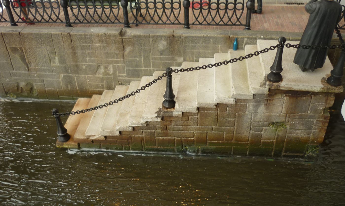 2) Располагая фигурки по углам диорамы, Вы делаете эти углы- активными, то есть пытаетесь что-то сказать этим самым расположением. И вот тут вопрос- Бабушка что делает на лестнице ведущей к воде? Образ не понят- ибо она могла так же стоять на тротуаре. Хотя если присмотреться- мы видем рядом с лестницей- бутылку, понимая, что автор не зря разместил старушку и бутылку рядом...