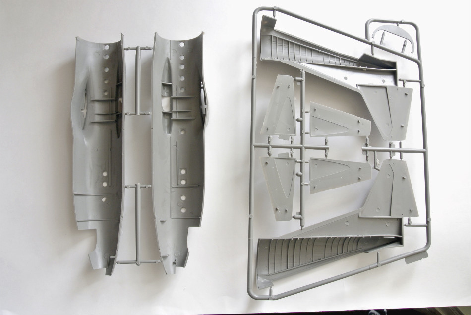 При отделении половинок фюзеляжа, для сборки на "сухую", немного обработал края мелкой шкуркой, затем чуть, чуть "полирнул" войлоком, обрабатываемость пластика нареканий не вызвала.