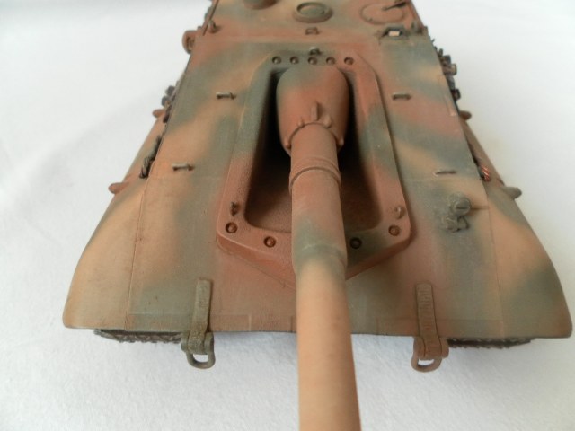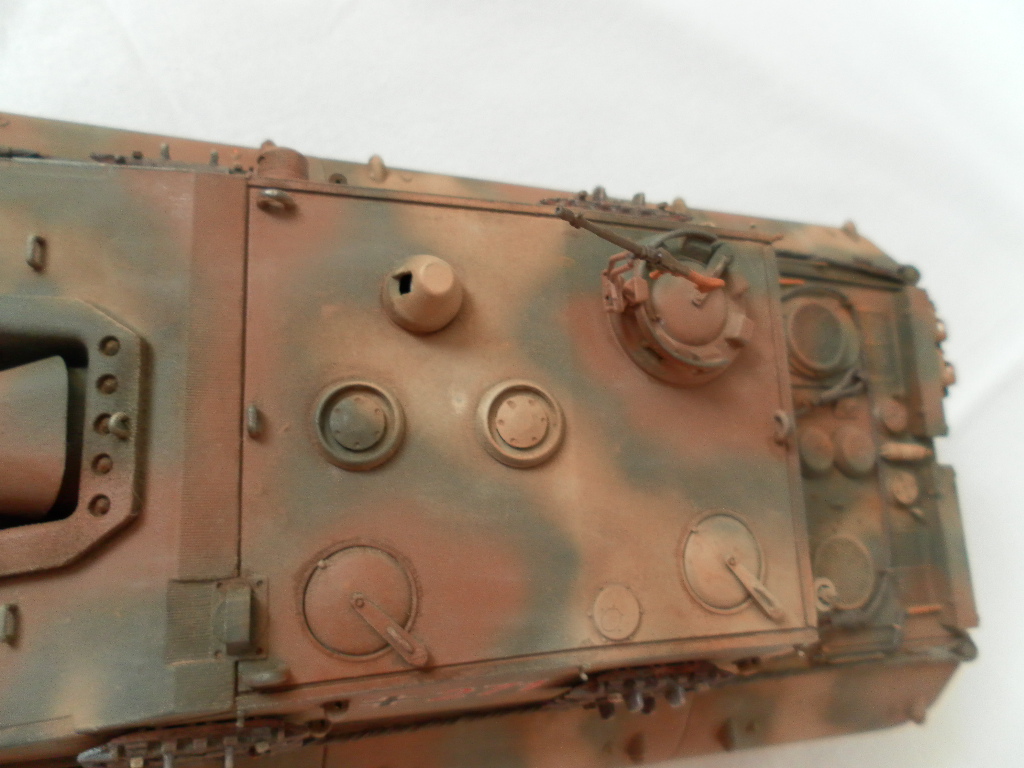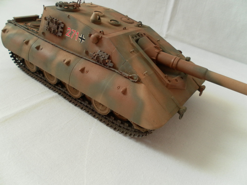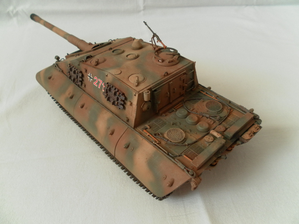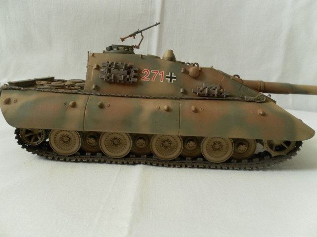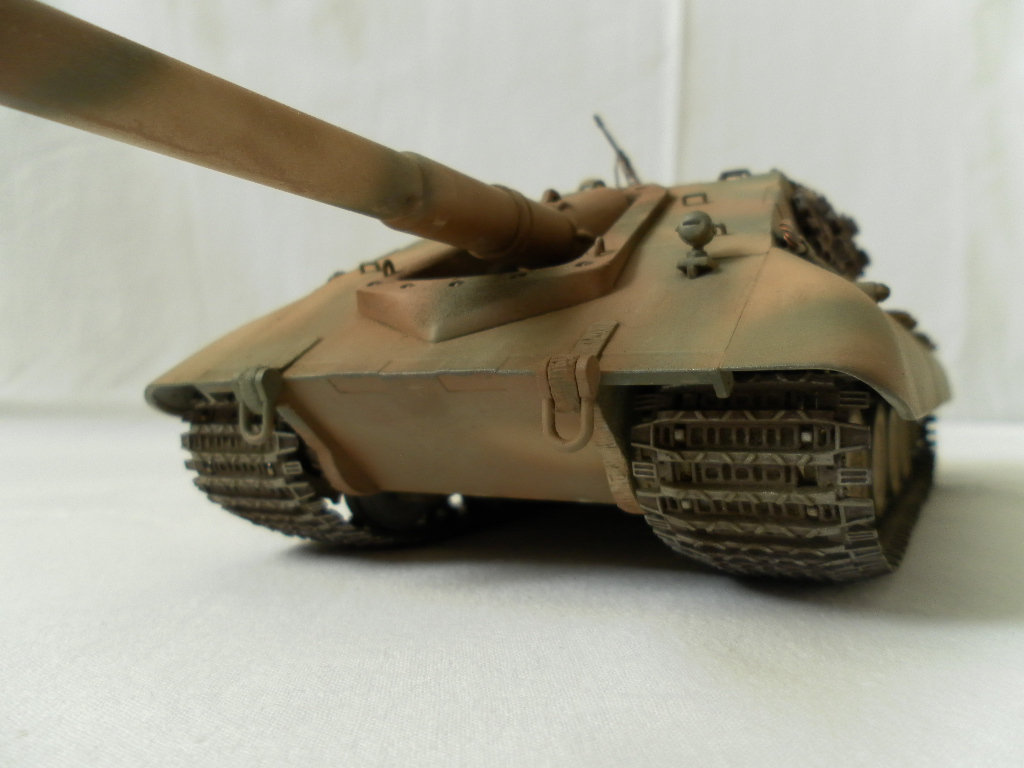 Представляю собранную мной модель немецкой САУ на базе танка Е-100. Данный танк был только на бумаге и говорить о мат части не приходится. Сборка порадовала, отличная стыкуемость, нет облоя и утяжин. Были только проблемы с катками. Гусеницы хорошого качества, только из-за плохого расположения в коробке были слегка помяты. Сделал небольшие дороботки, т.к по инструкции он получался слишком простеньким. Внушает своими размерами. Впервые пользовался технологией масляных точек.