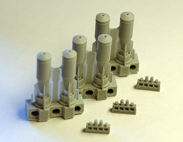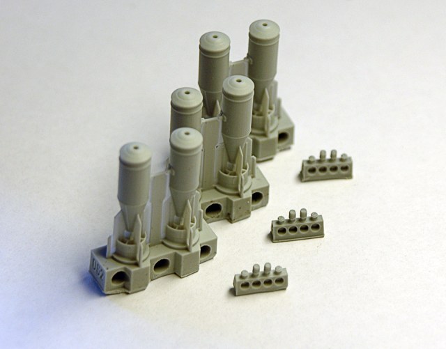 В прозрачном пакете находится буклетик с описанием и шесть отливок: три с бомбами непосредственно и три с, вкручиваемыми в носовую часть, взрывателями АВУ и заглушками. Набор содержит шесть бомб.