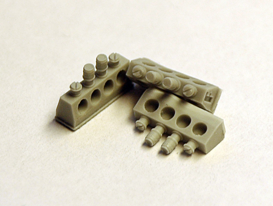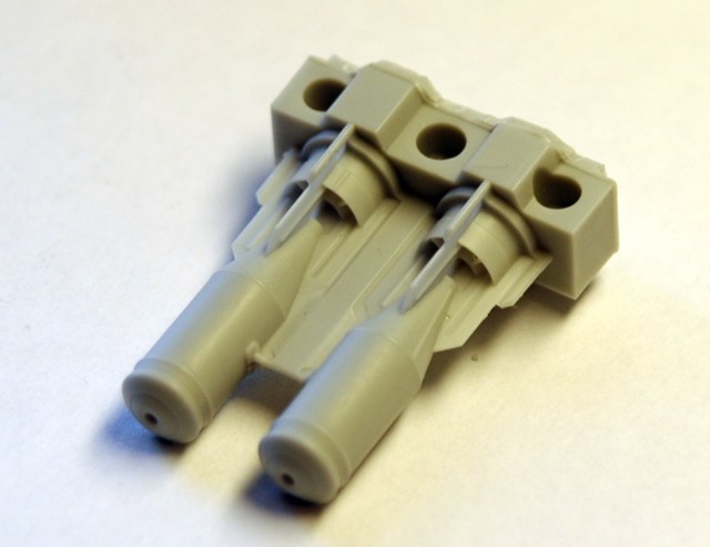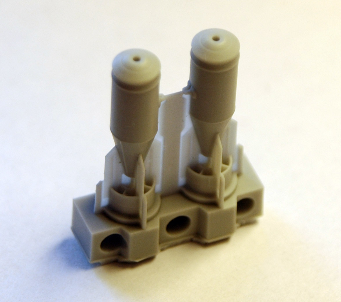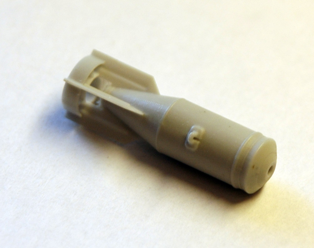 Бомба достаточно фактурная, с характерным баллистическим кольцом. Внешний вид и геометрические размеры не вызывают сомнений, промерялись реальные образцы на аэродроме и кафедре АСП. Из особенностей можно еще раз подчеркнуть то, что бомба отливается в одну деталь вместе с кольцом и перьями стабилизаторов. У производителей модельной продукции это встречается крайне редко. Толщина стабилизатора 0,15 мм, что даже немного меньше толщины стандартной фото-травленной пластины (0,16-0,17 мм). Для защиты стабилизаторов от повреждения при транспортировке они защищены вертикальными пилонами. Удаление пилонов не вызывает трудностей, толщина соединяющей перемычки около 0, 1 мм. Хорошо выполнены сварочные швы. Дается две опции,- установка в очко взрывателя пробки или взрывателя типа АВУ. Причем, по опыту знаю, что взрыватели (как правило) вкручиваются в уже подвешенную бомбу, а до этого она заглушена пробкой. В общем, дополнительный бонус для любителей диорам.