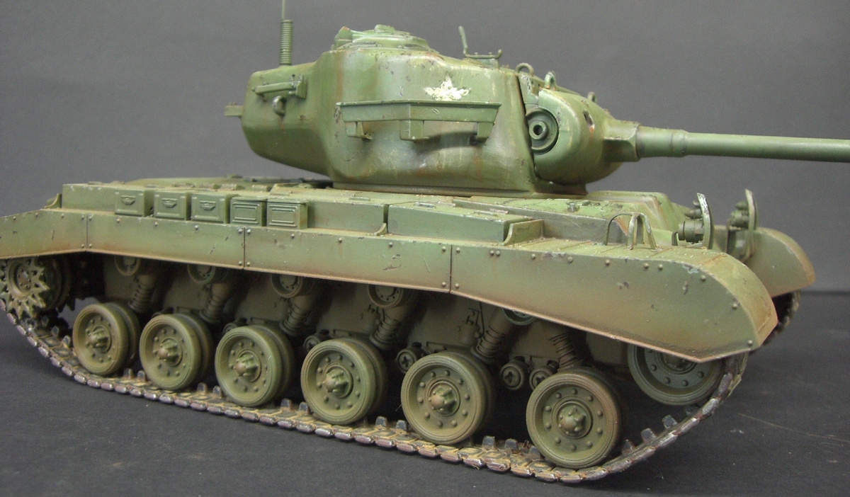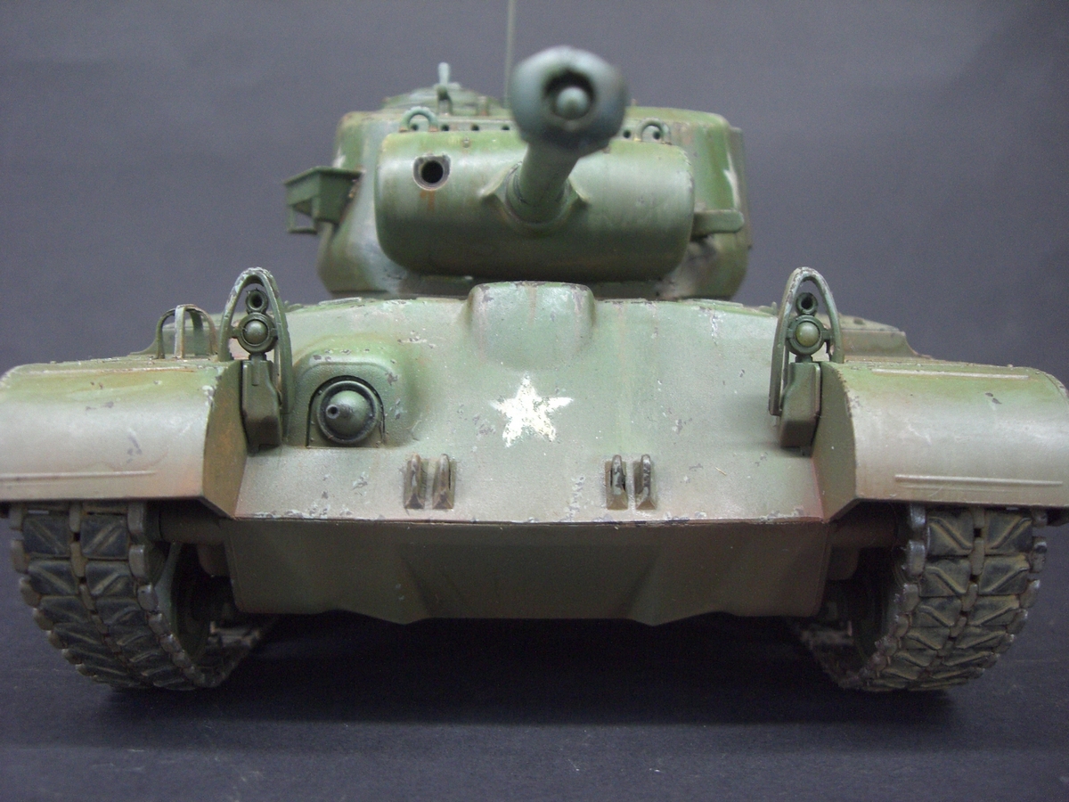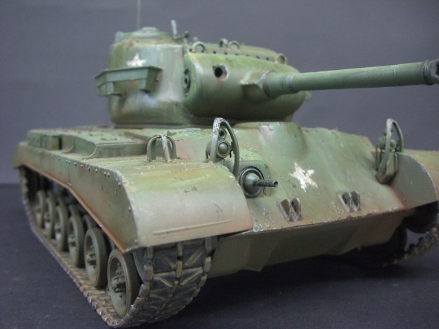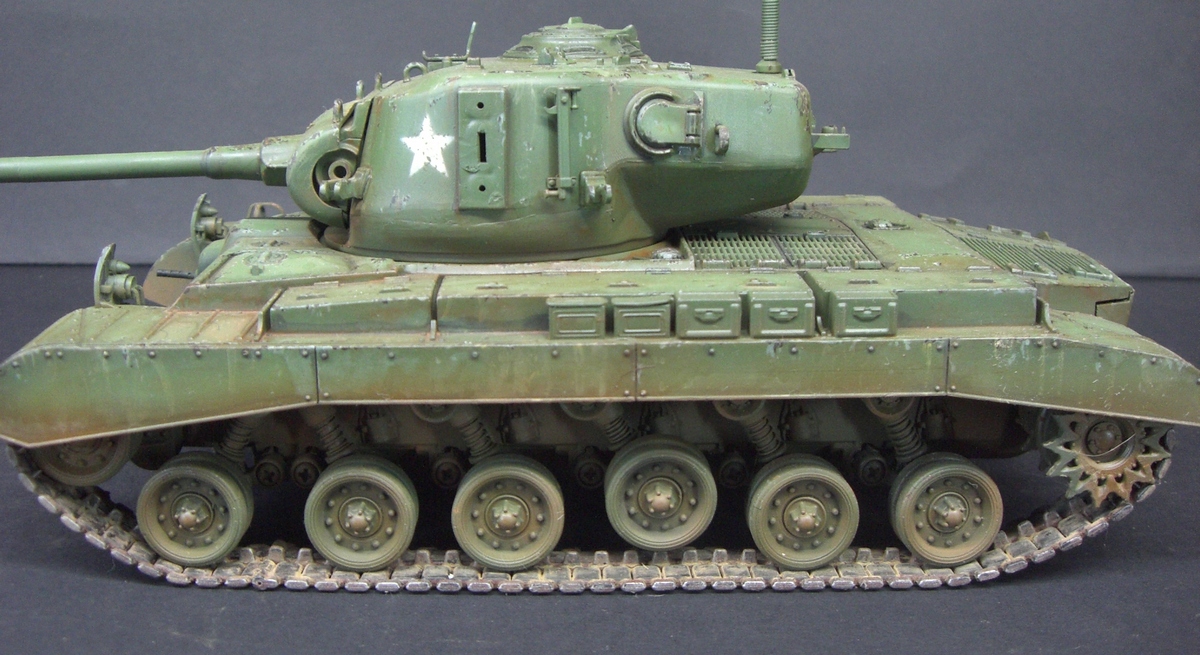 Ещё одна игрушка , совсем уж игрушка , похожая на М 26 " ПЕРШИНГ " , Но только визуально . У данной модели маленький ствол орудия не соответствующий оригиналу. Модель интересно запускается - При включении кнопок готовности на модели и на пульте для окончательного включения надо нажать кнопку " ЗАВОД " на пульте с эмблемой ключика. Когда её нажимаешь слышится звук стартёра как у трактора сперва работает магнето заводя сам двигатель, так же и на модели. Стреляет УВЫ только звуком и световым проблеском , но при выстреле танк как при отдаче дёргается назад. А при выключении танка вдруг звучит детским голосом " БАЙ БАЙ ".